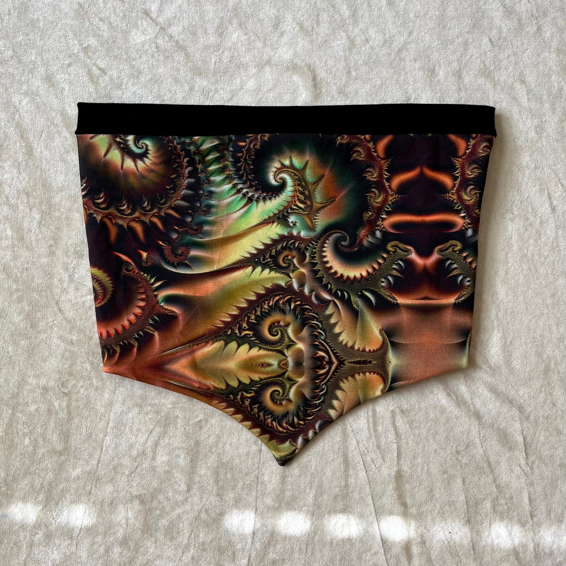 Mostly all patterned fabric is 93% Cotton 7% Spandex - It’s a 4 way stretch that’s very comfortable and allows for movement & breathability while also holding you in just right, contents of solid fabrics vary because I tend to switch them up, but I normally stick with natural fibers. 99% of everything I make is fire safe and can confidently be worn while flowing with fire props. Feel free to email me if you have questions about a specific one :)