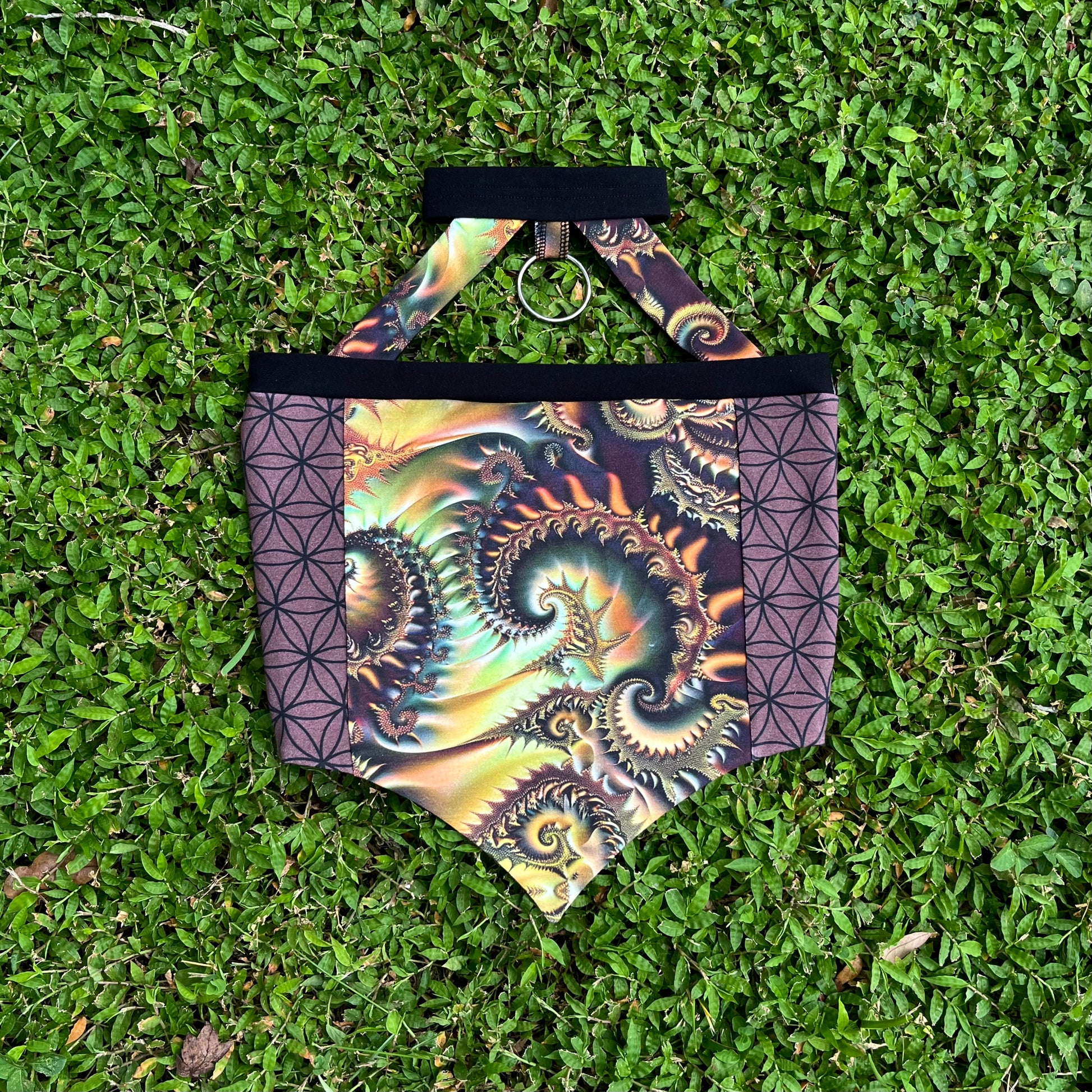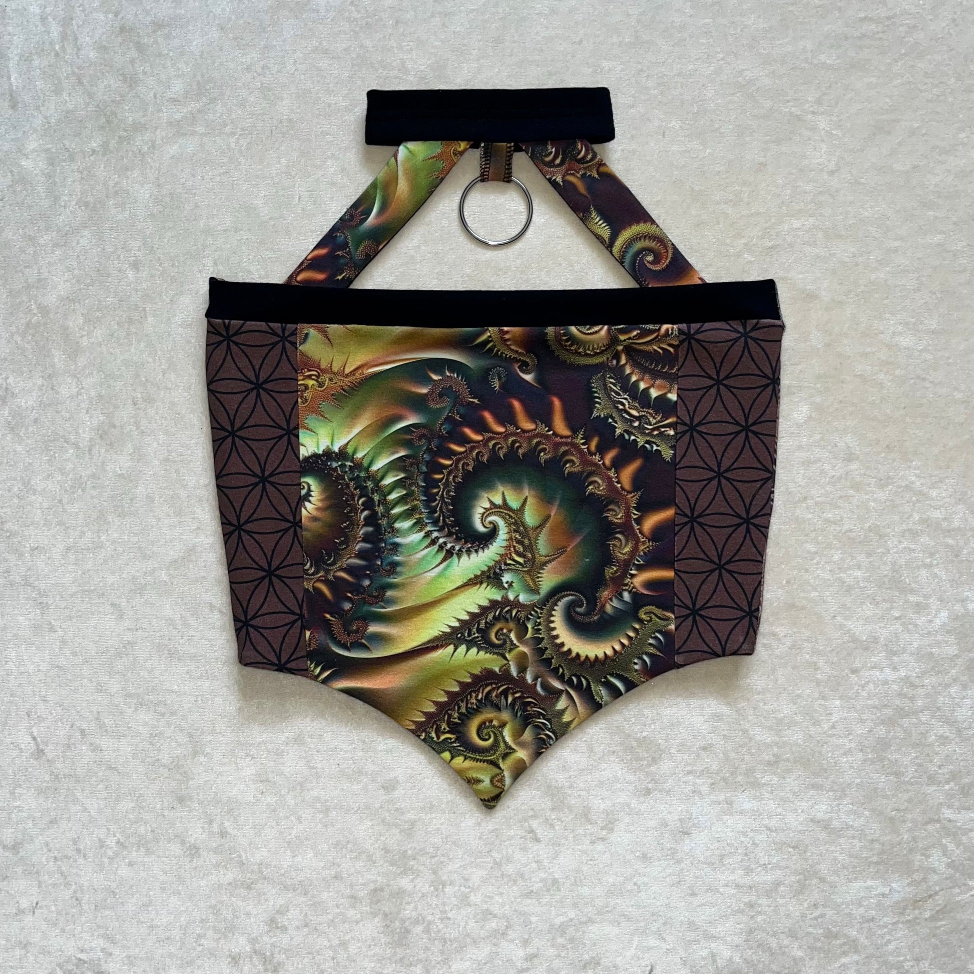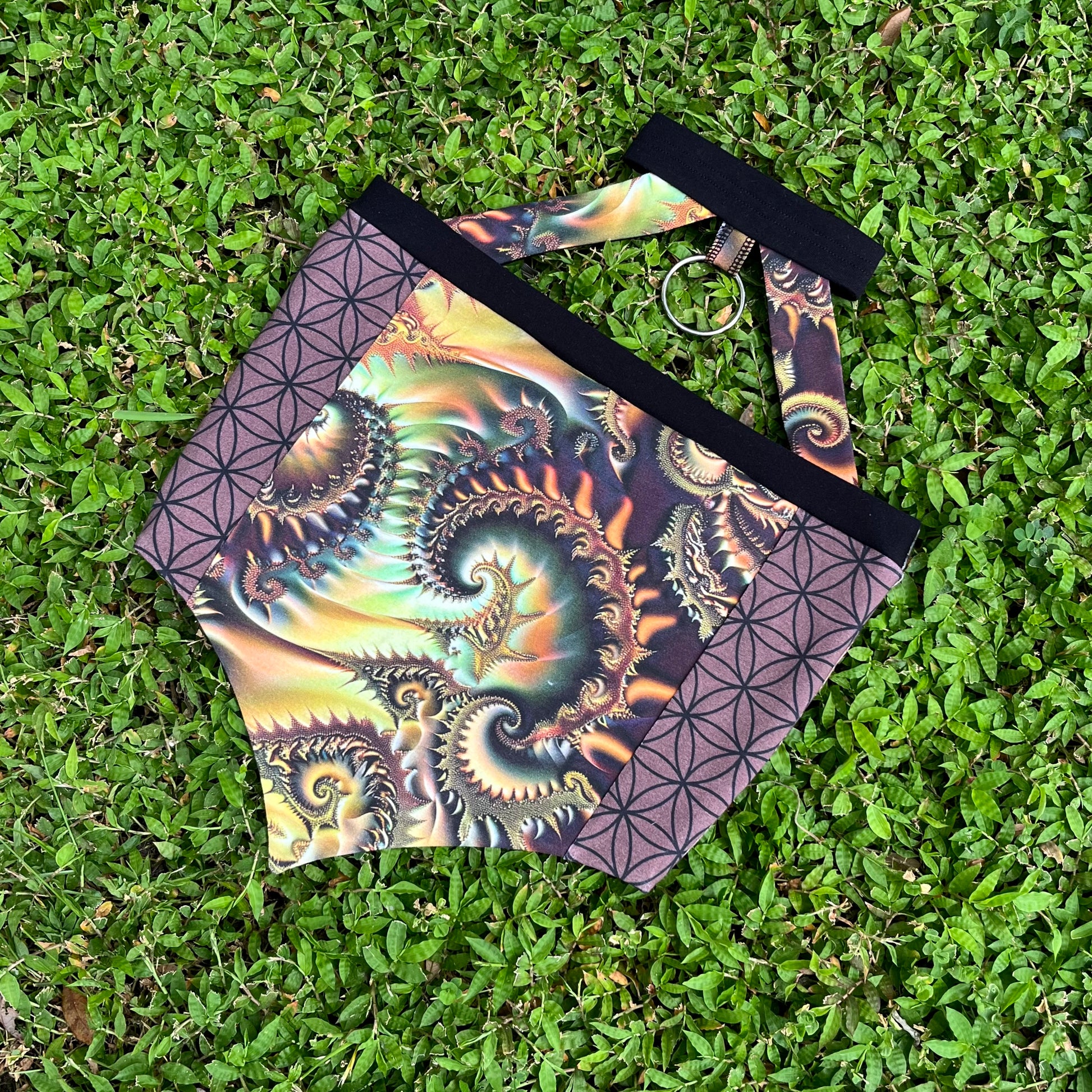 Mostly all patterned fabric is 93% Cotton 7% Spandex - It’s a 4 way stretch that’s very comfortable and allows for movement & breathability while also holding you in just right, contents of solid fabrics vary because I tend to switch them up, but I normally stick with natural fibers. 99% of everything I make is fire safe and can confidently be worn while flowing with fire props. Feel free to email me if you have questions about a specific one :)