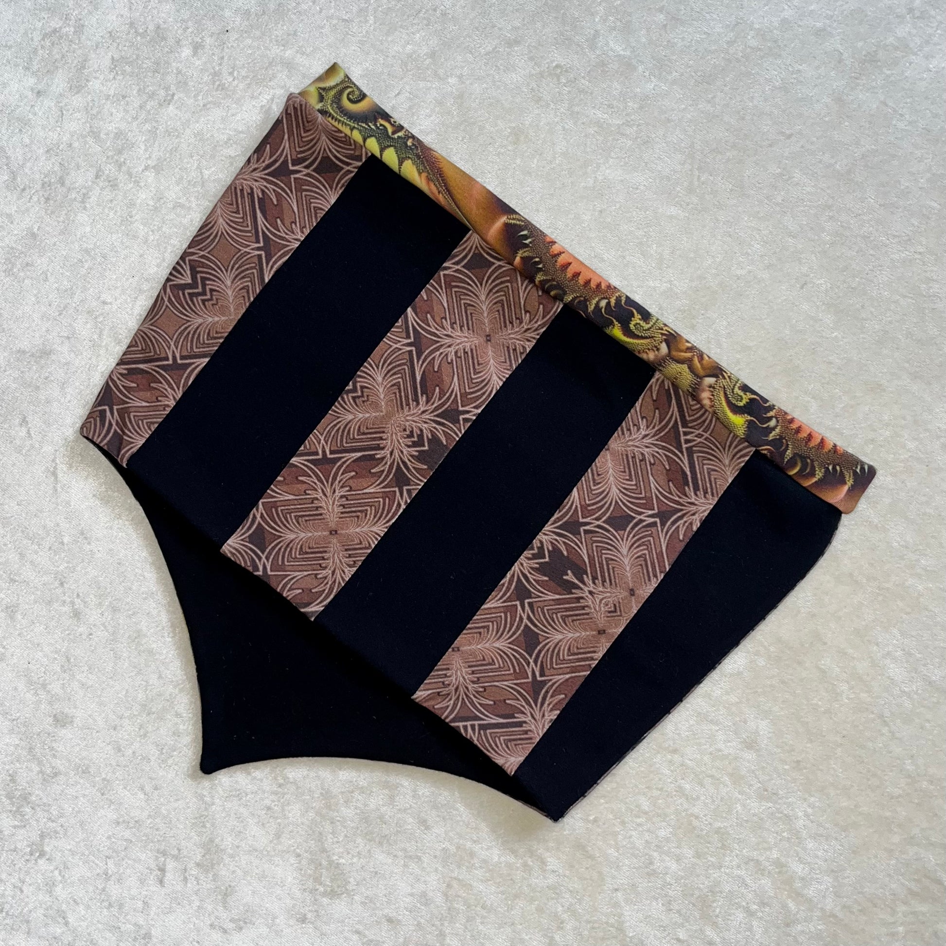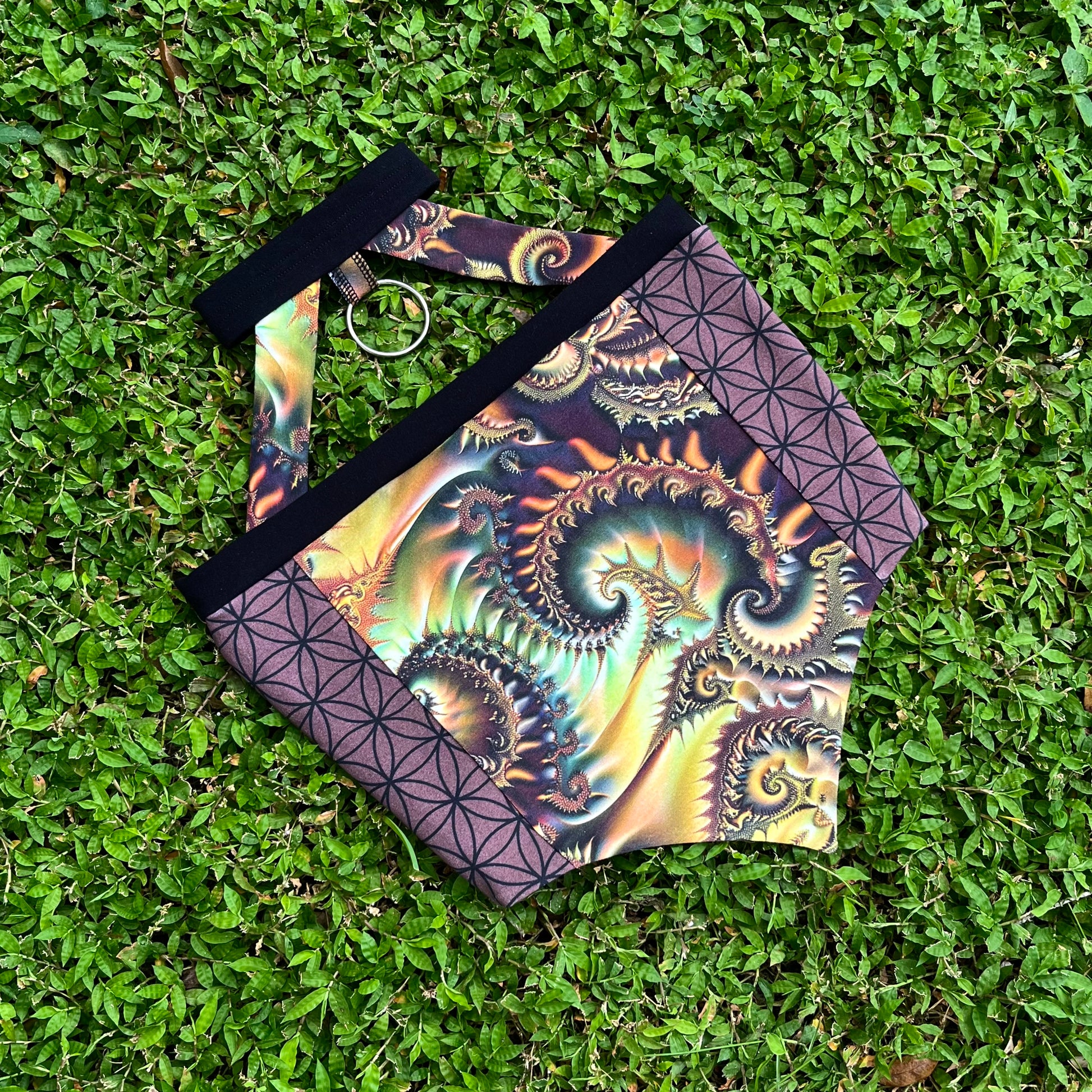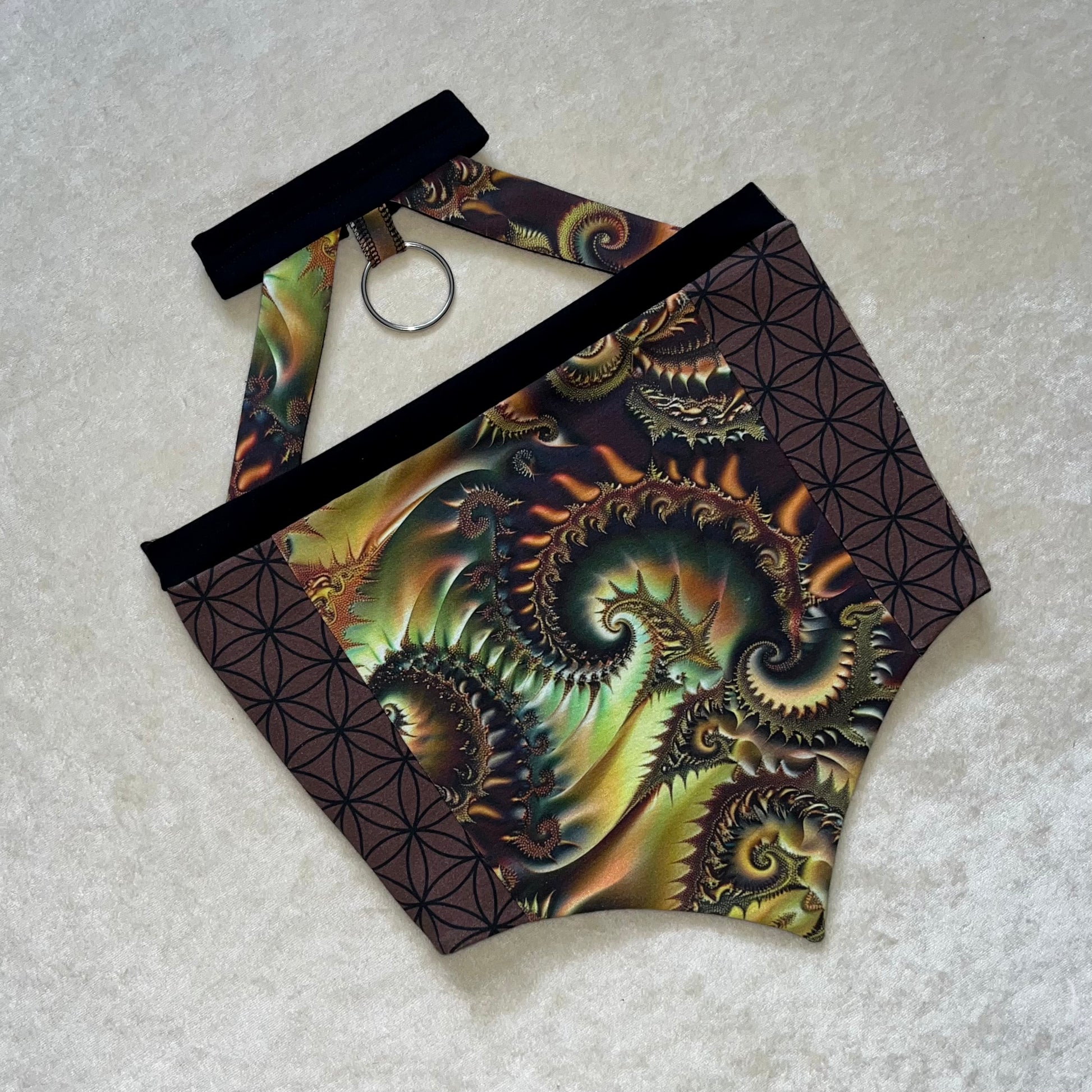 Mostly all patterned fabric is 93% Cotton 7% Spandex - It’s a 4 way stretch that’s very comfortable and allows for movement & breathability while also holding you in just right, contents of solid fabrics vary because I tend to switch them up, but I normally stick with natural fibers. 99% of everything I make is fire safe and can confidently be worn while flowing with fire props. Feel free to email me if you have questions about a specific one :)