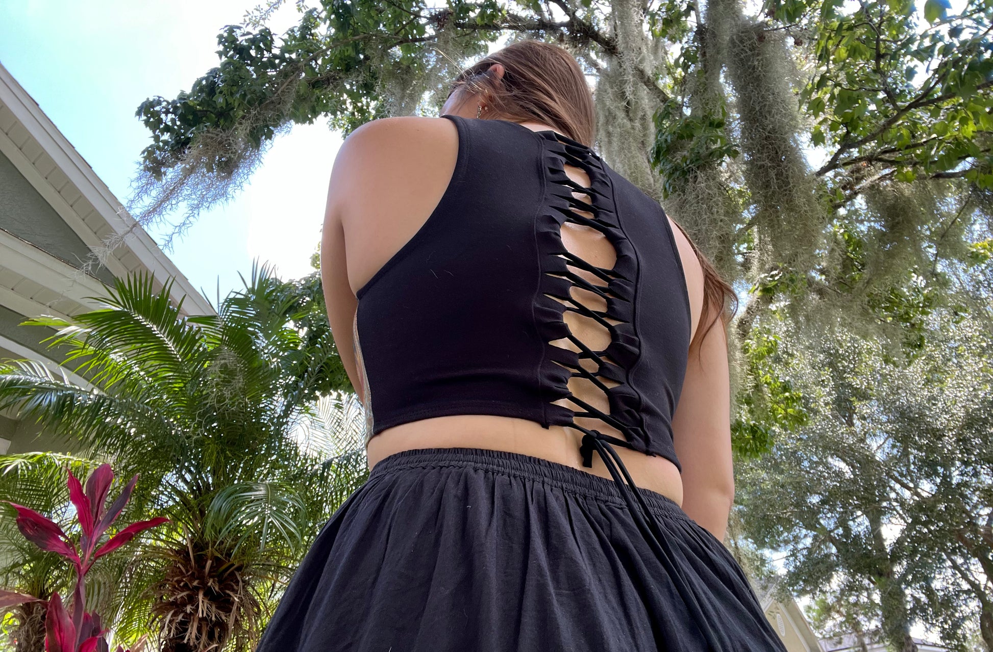 Love the type of cut where I was afraid my brests would fall out under but this Top makes it so u can cover up more or and hold s the breasts up so they won't fall down. Perfectly!! I love the look . So ty to the maker sooooo MUCH 5 STARS ALL DAY .FAST SHIPING TOO!