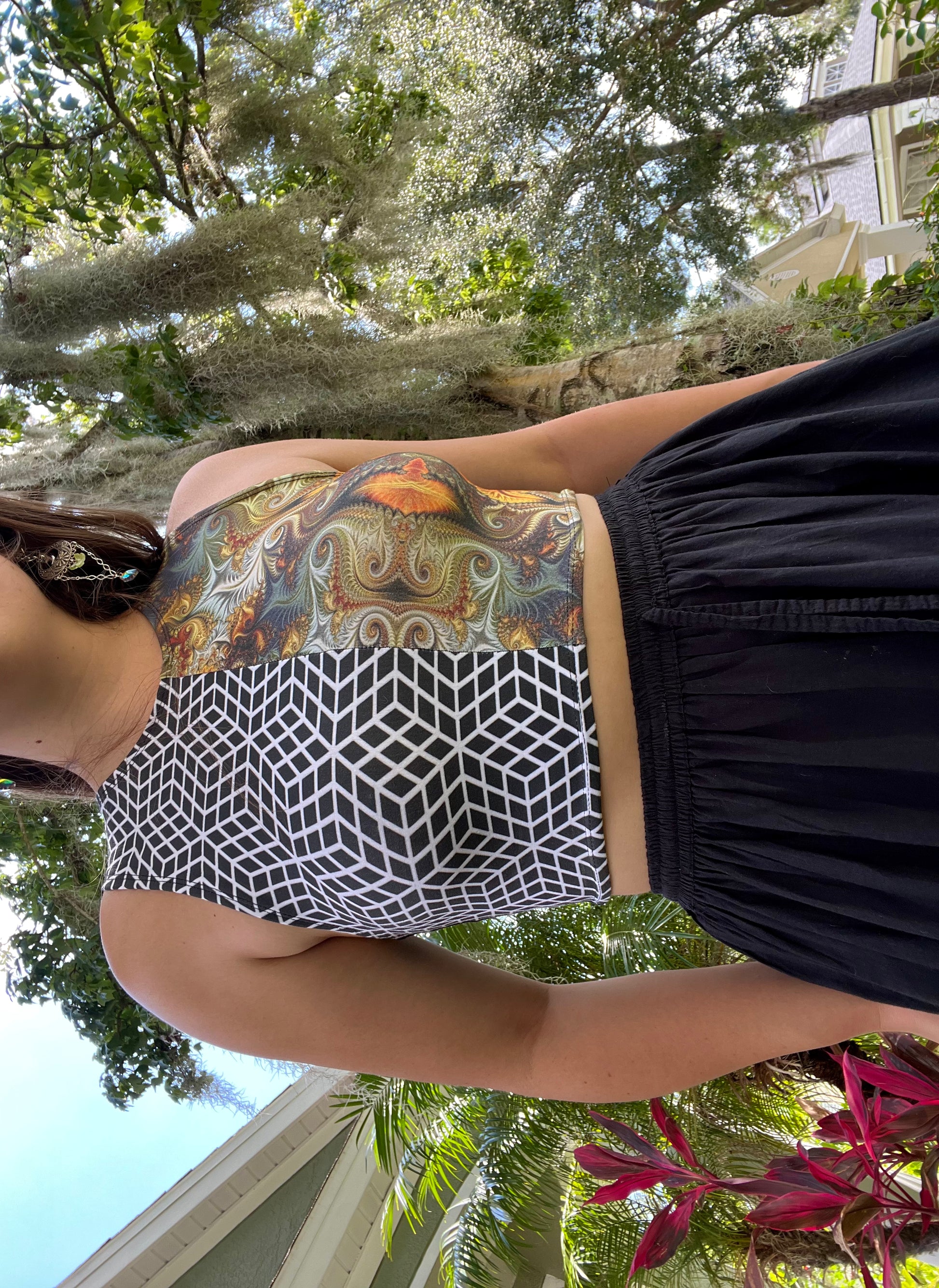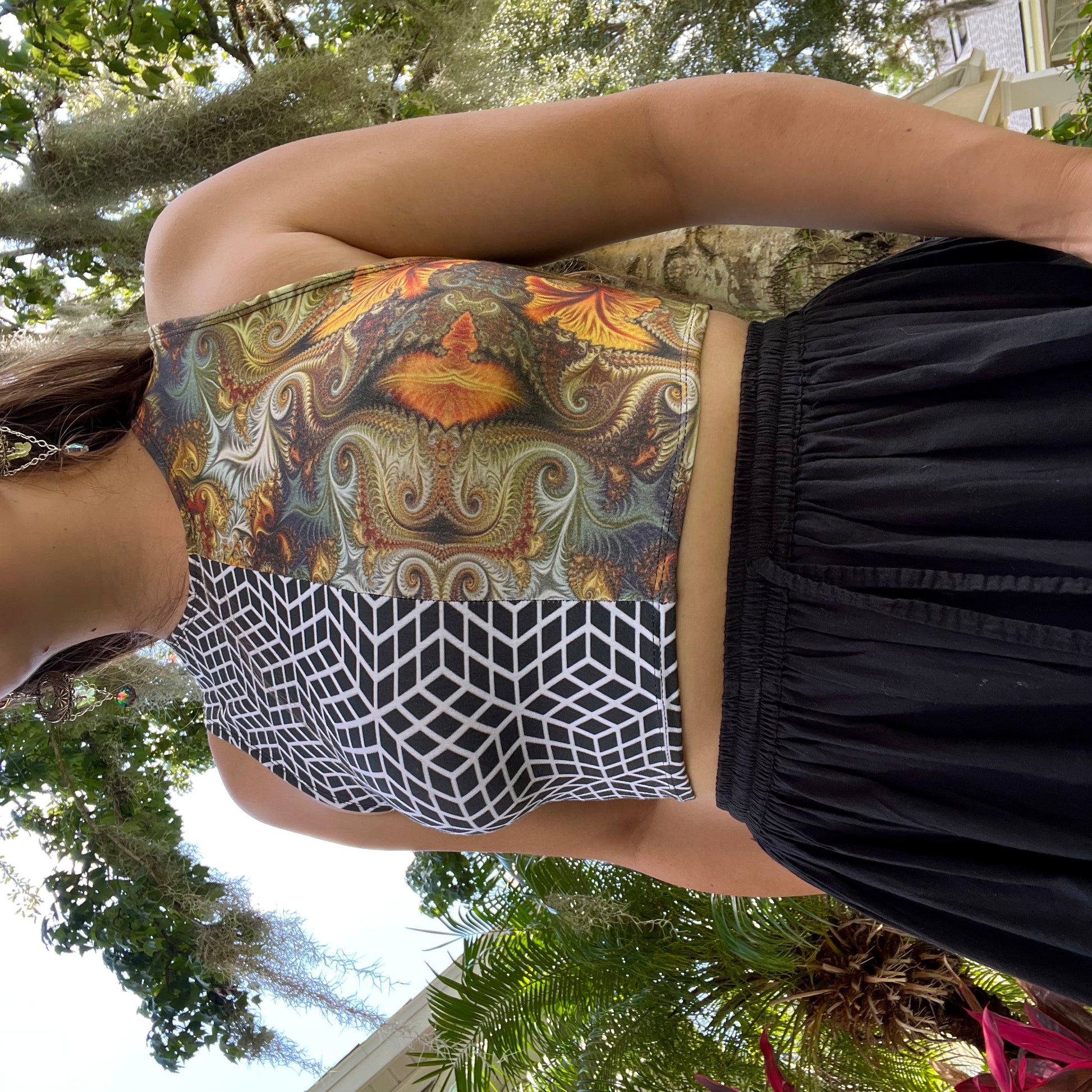 Mostly all patterned fabric is 93% Cotton 7% Spandex - It’s a 4 way stretch that’s very comfortable and allows for movement & breathability while also holding you in just right, contents of solid fabrics vary because I tend to switch them up, but I normally stick with natural fibers. 99% of everything I make is fire safe and can confidently be worn while flowing with fire props. Feel free to email me if you have questions about a specific one :)