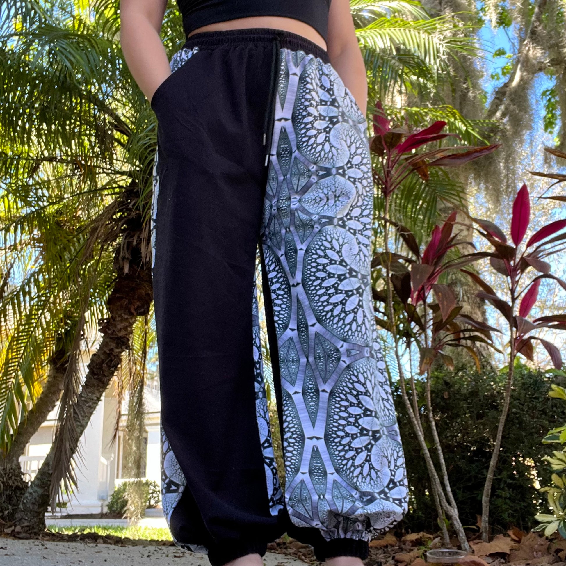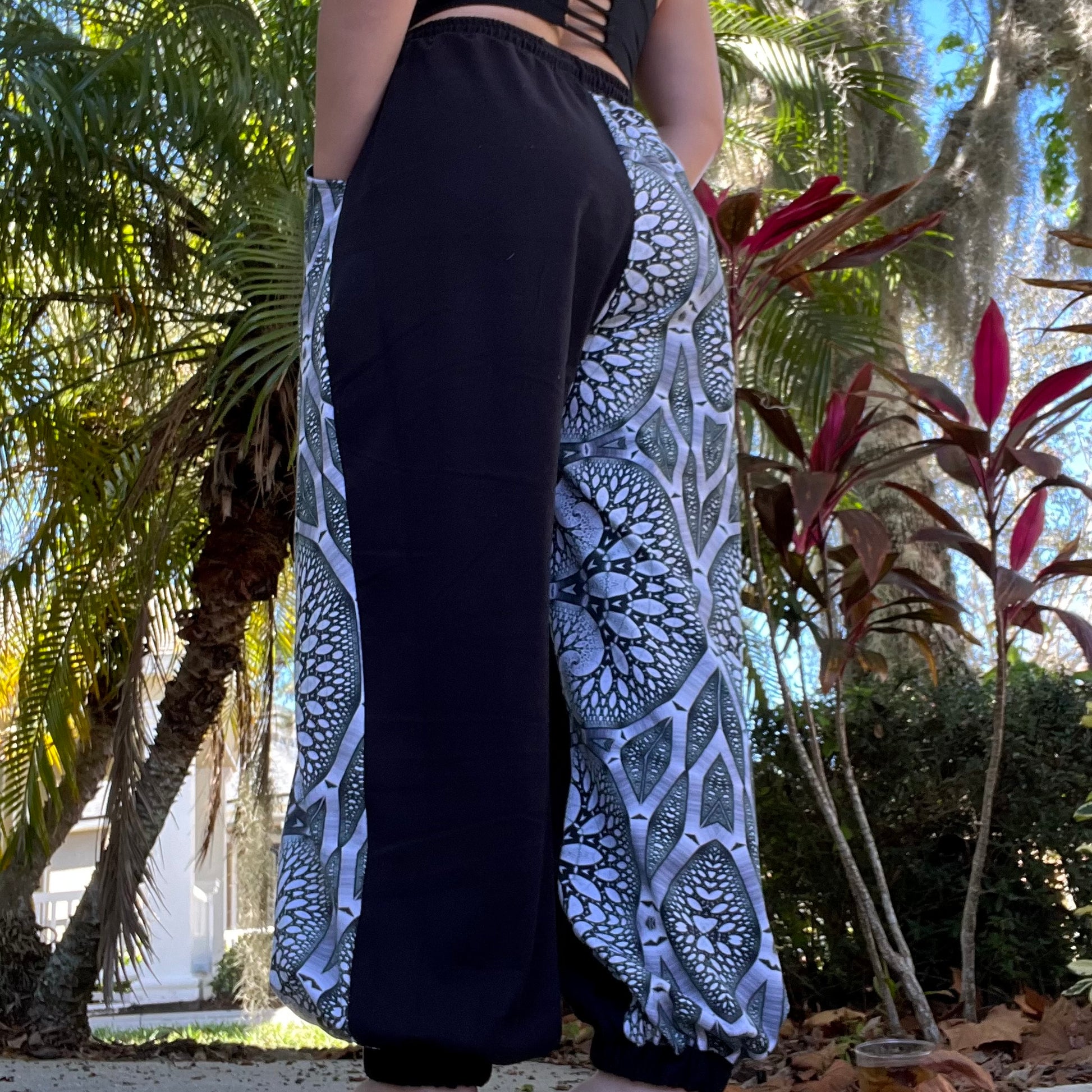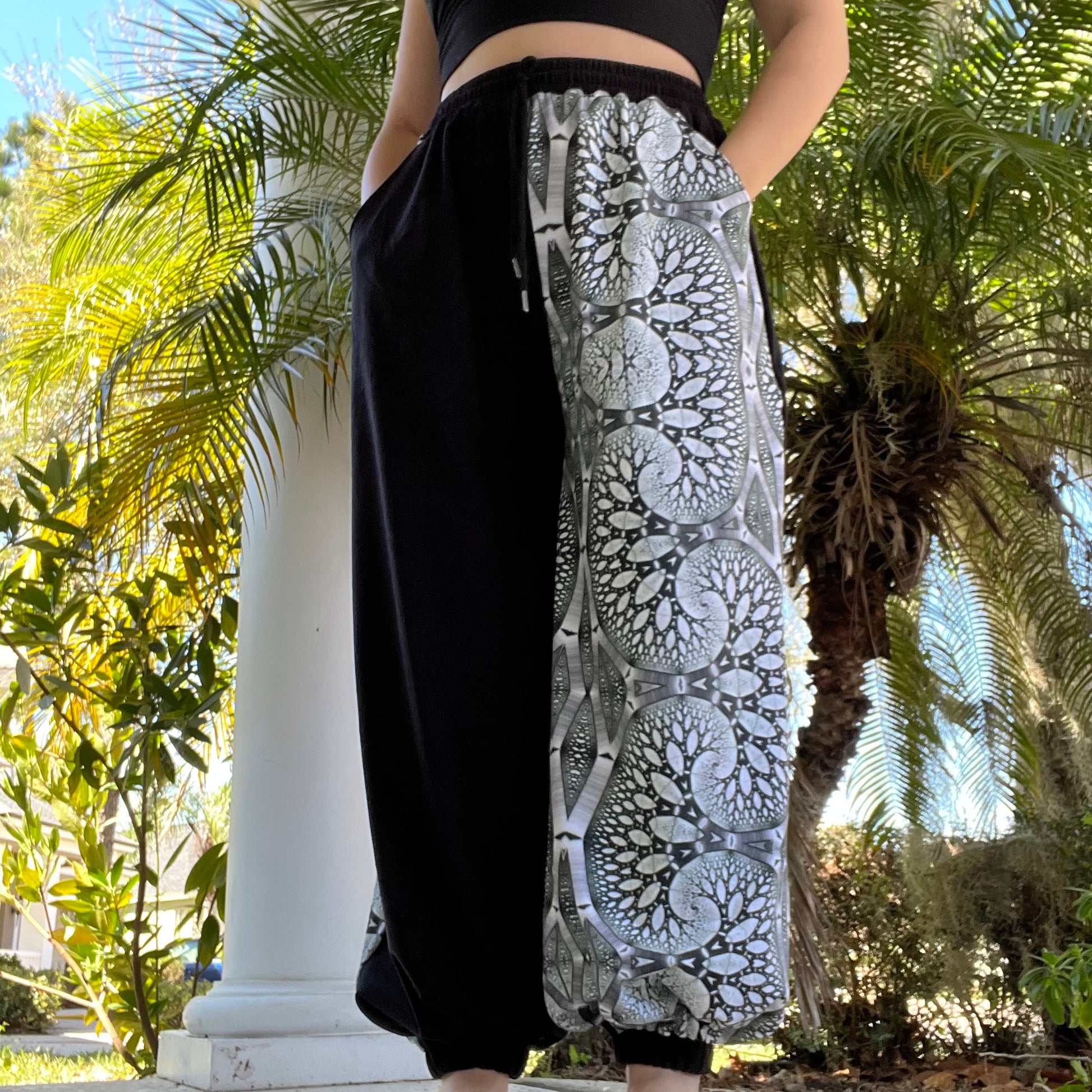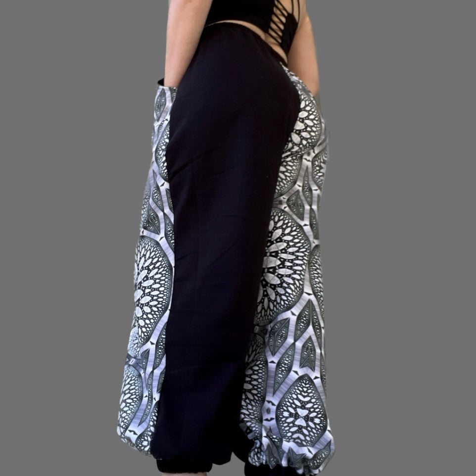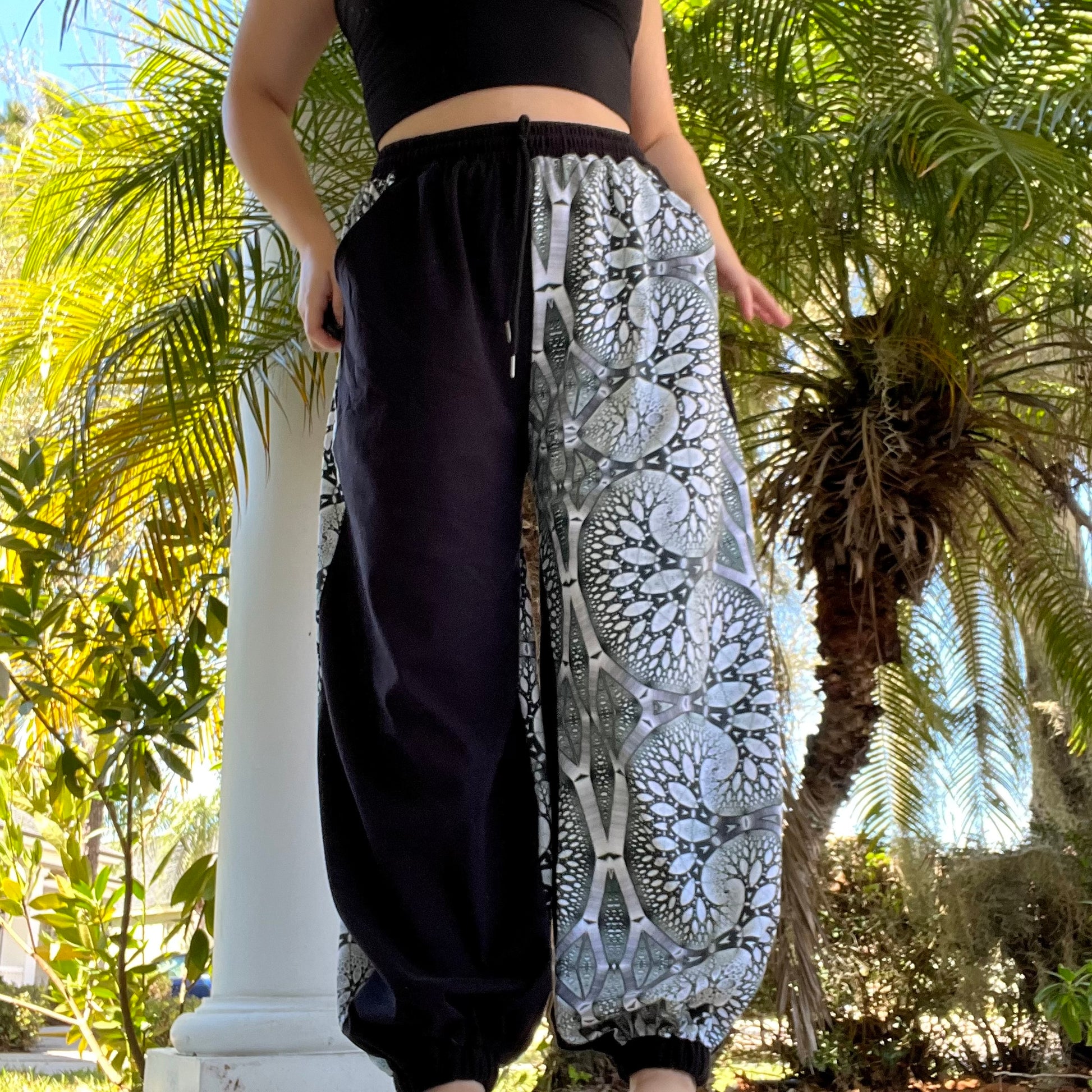 Mostly all patterned fabric is 93% Cotton 7% Spandex - Itās a 4 way stretch thatās very comfortable and allows for movement & breathability while also holding you in just right, contents of solid fabrics vary because I tend to switch them up, but I normally stick with natural fibers. 99% of everything I make is fire safe and can confidently be worn while flowing with fire props. Feel free to email me if you have questions about a specific one :)