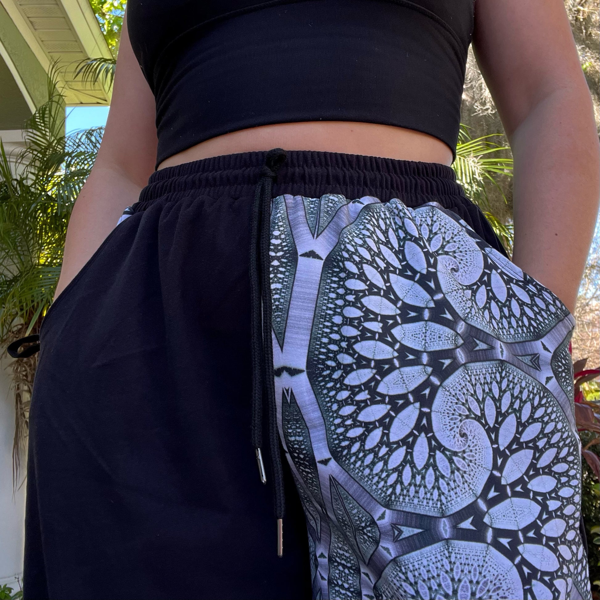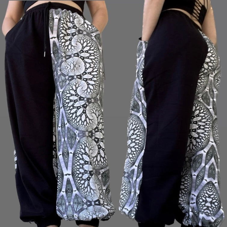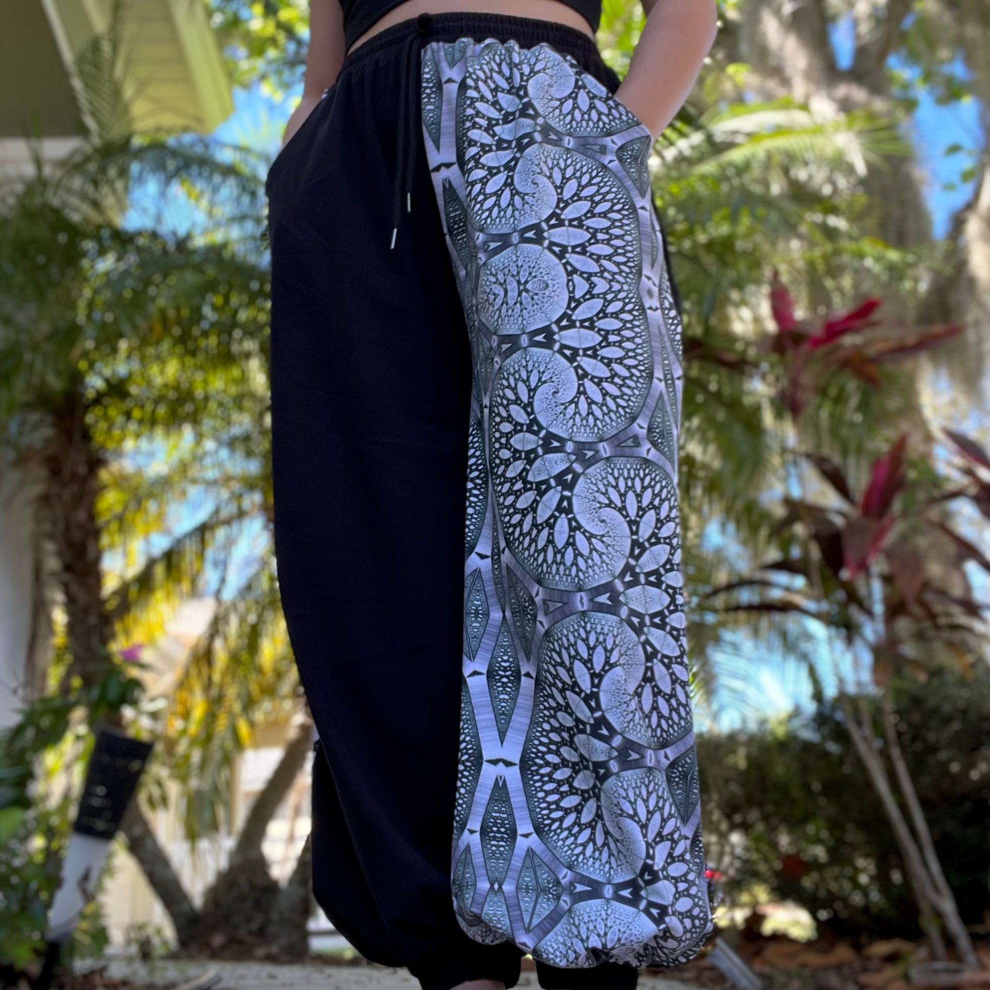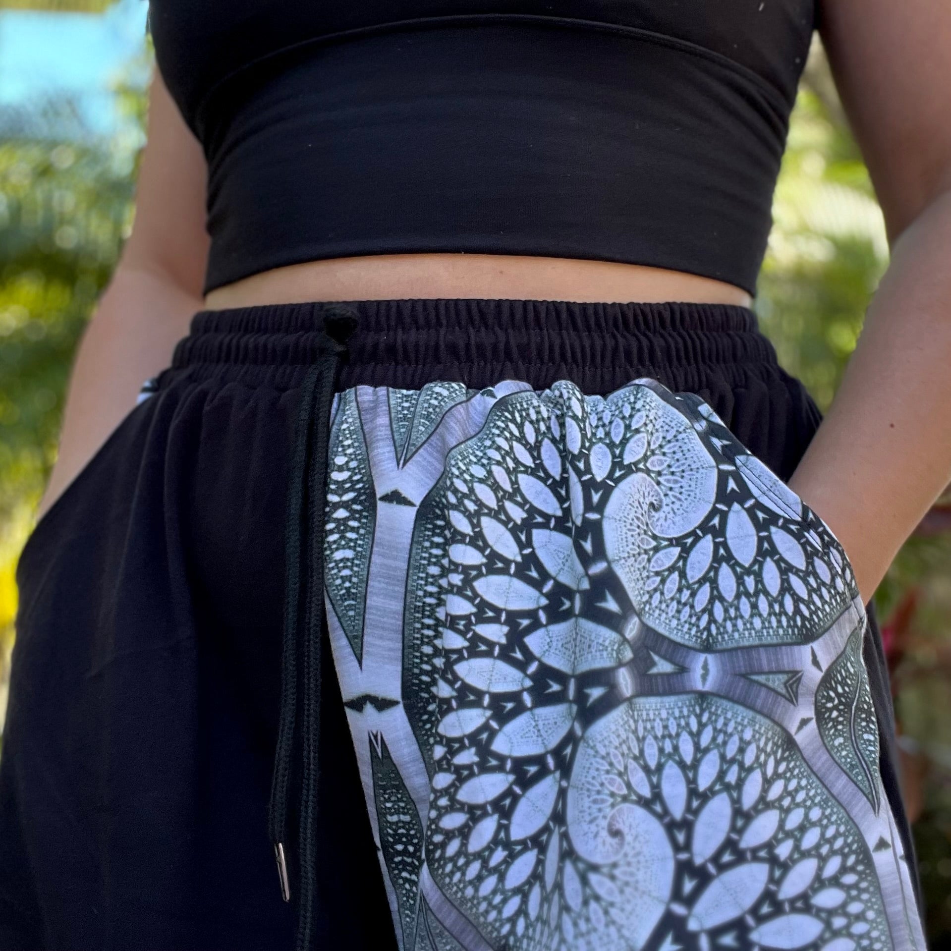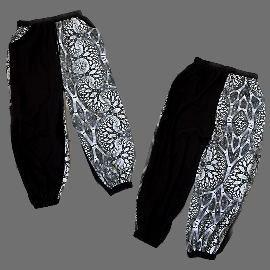 Mostly all patterned fabric is 93% Cotton 7% Spandex - Itās a 4 way stretch thatās very comfortable and allows for movement & breathability while also holding you in just right, contents of solid fabrics vary because I tend to switch them up, but I normally stick with natural fibers. 99% of everything I make is fire safe and can confidently be worn while flowing with fire props. Feel free to email me if you have questions about a specific one :)