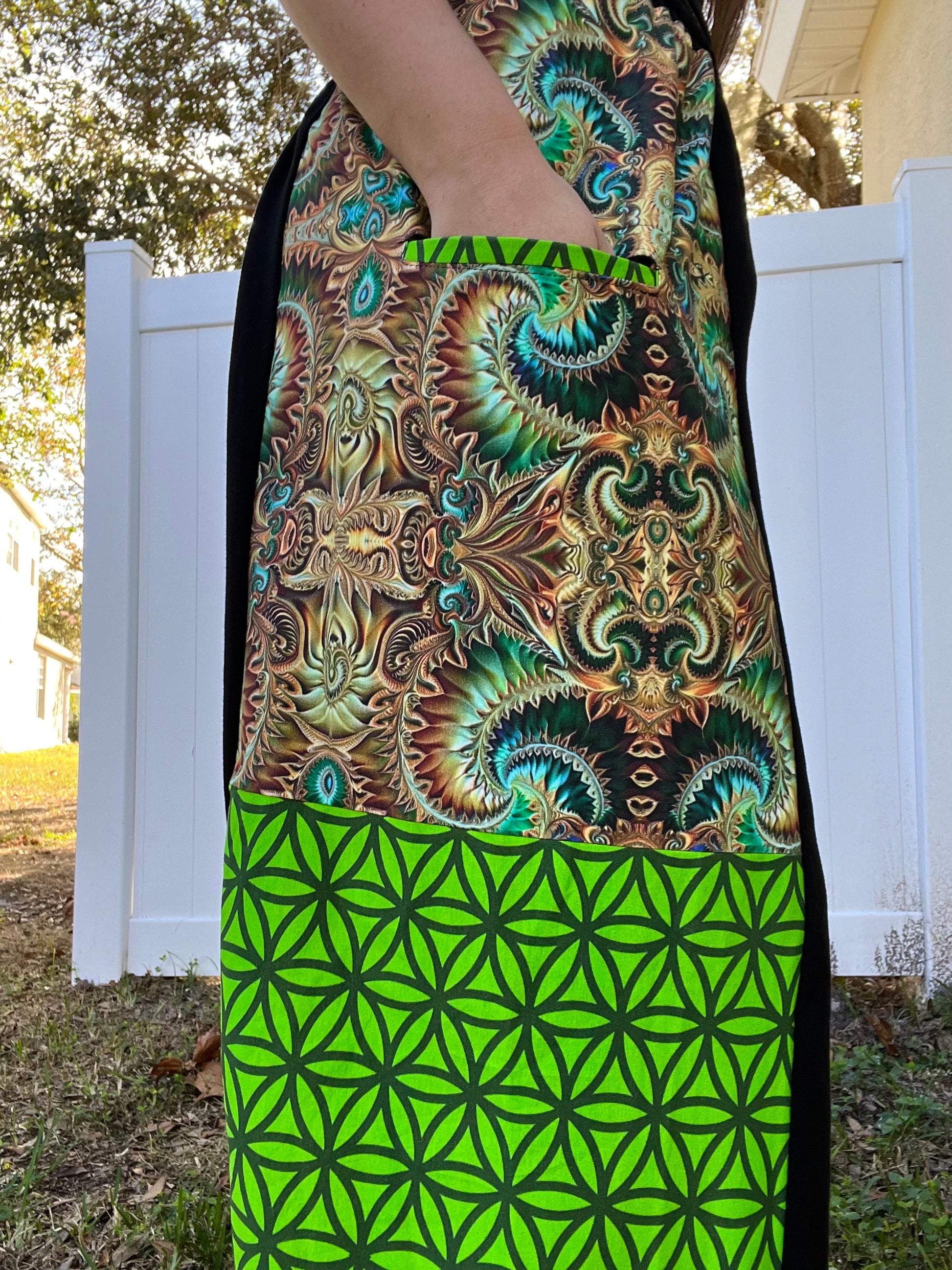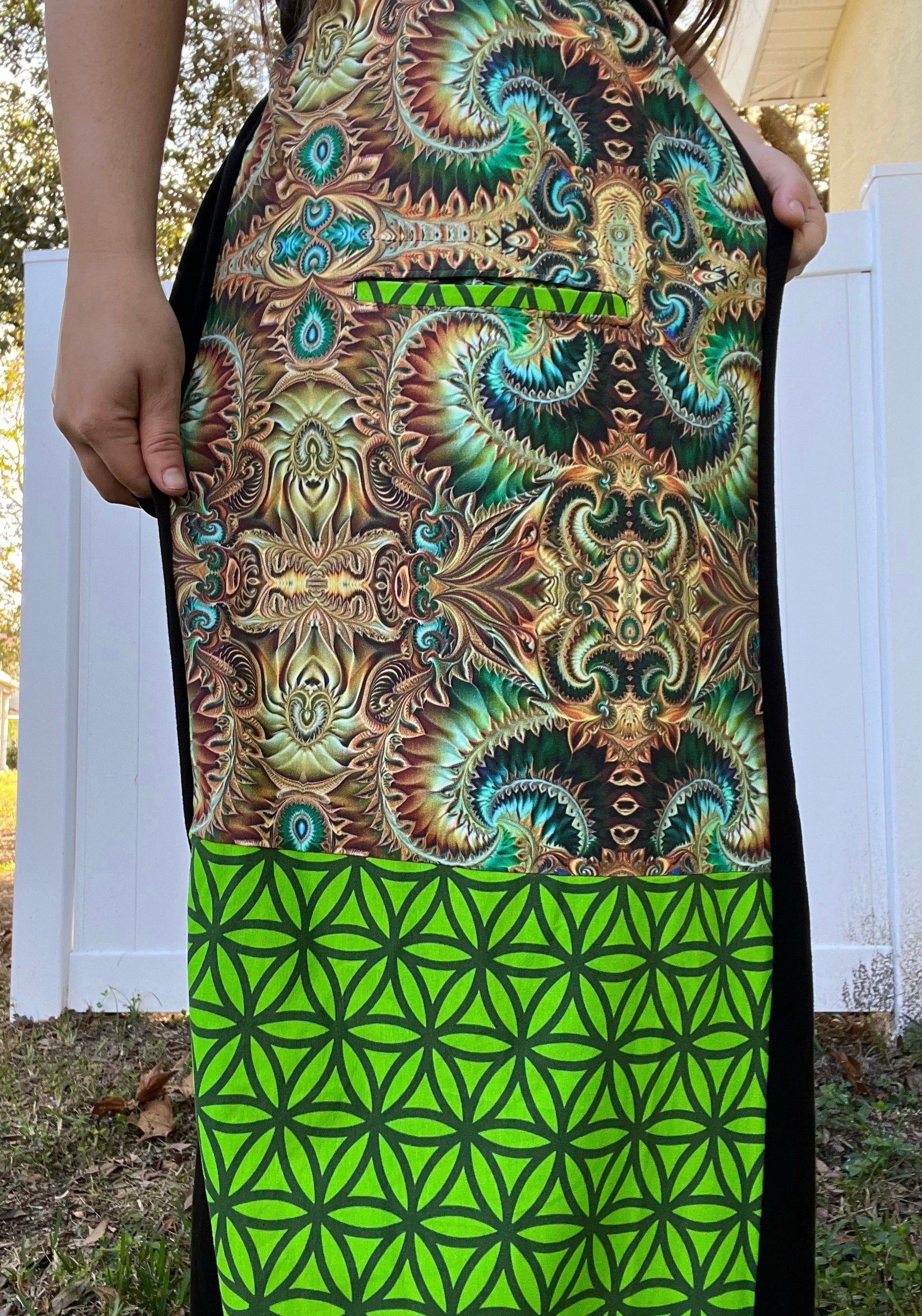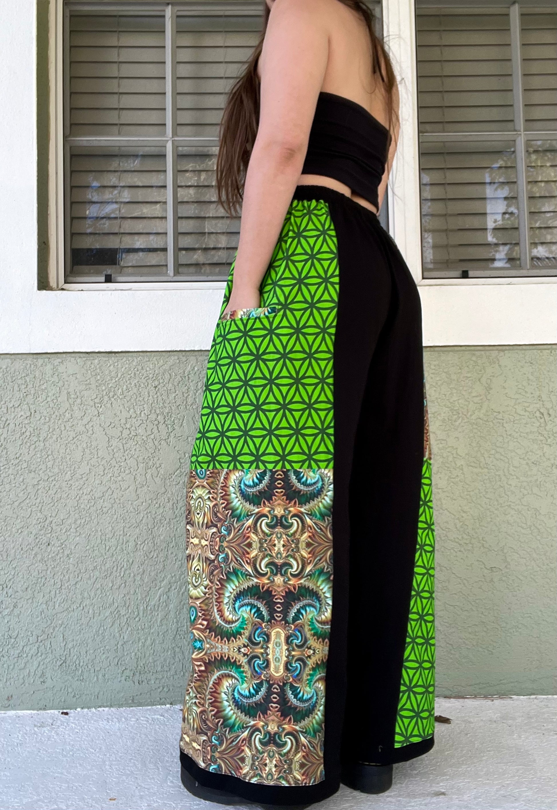 Mostly all patterned fabric is 93% Cotton 7% Spandex - It’s a 4 way stretch that’s very comfortable and allows for movement & breathability while also holding you in just right, contents of solid fabrics vary because I tend to switch them up, but I normally stick with natural fibers. 99% of everything I make is fire safe and can confidently be worn while flowing with fire props. Feel free to email me if you have questions about a specific one :)