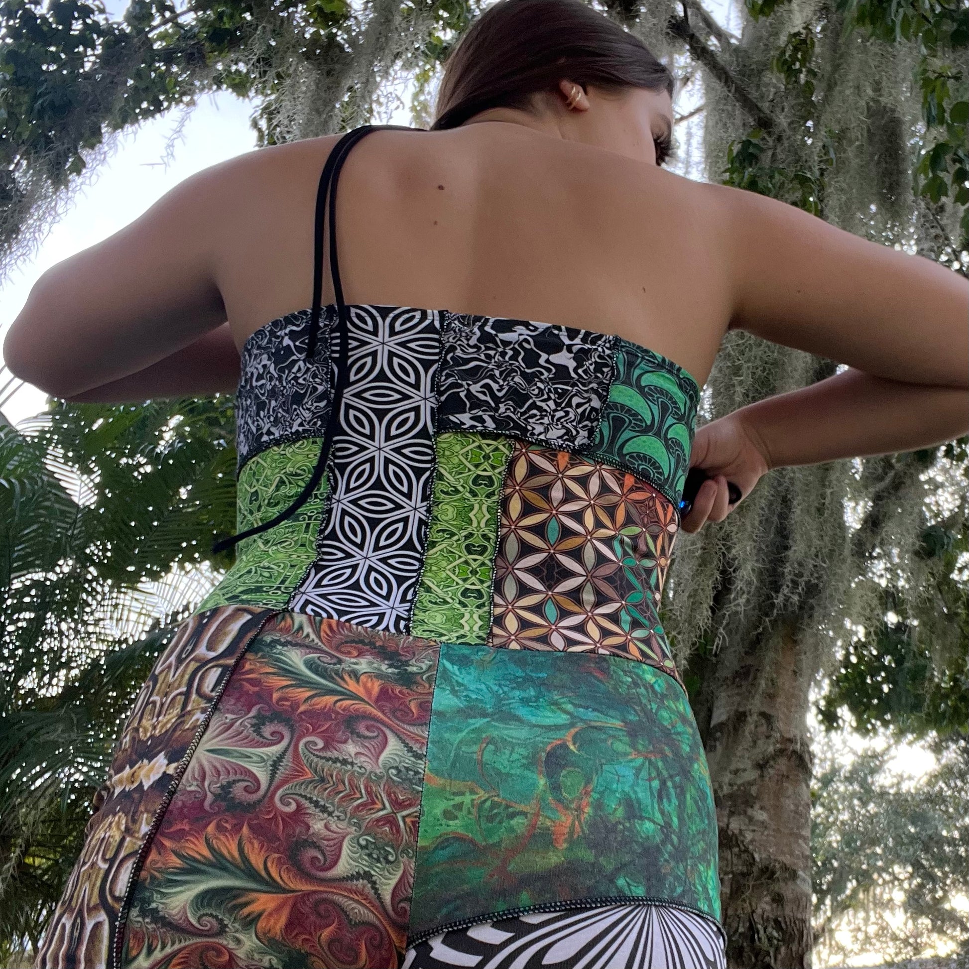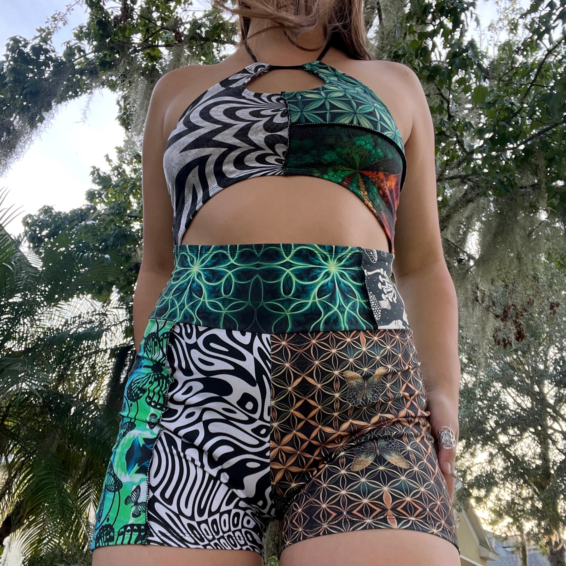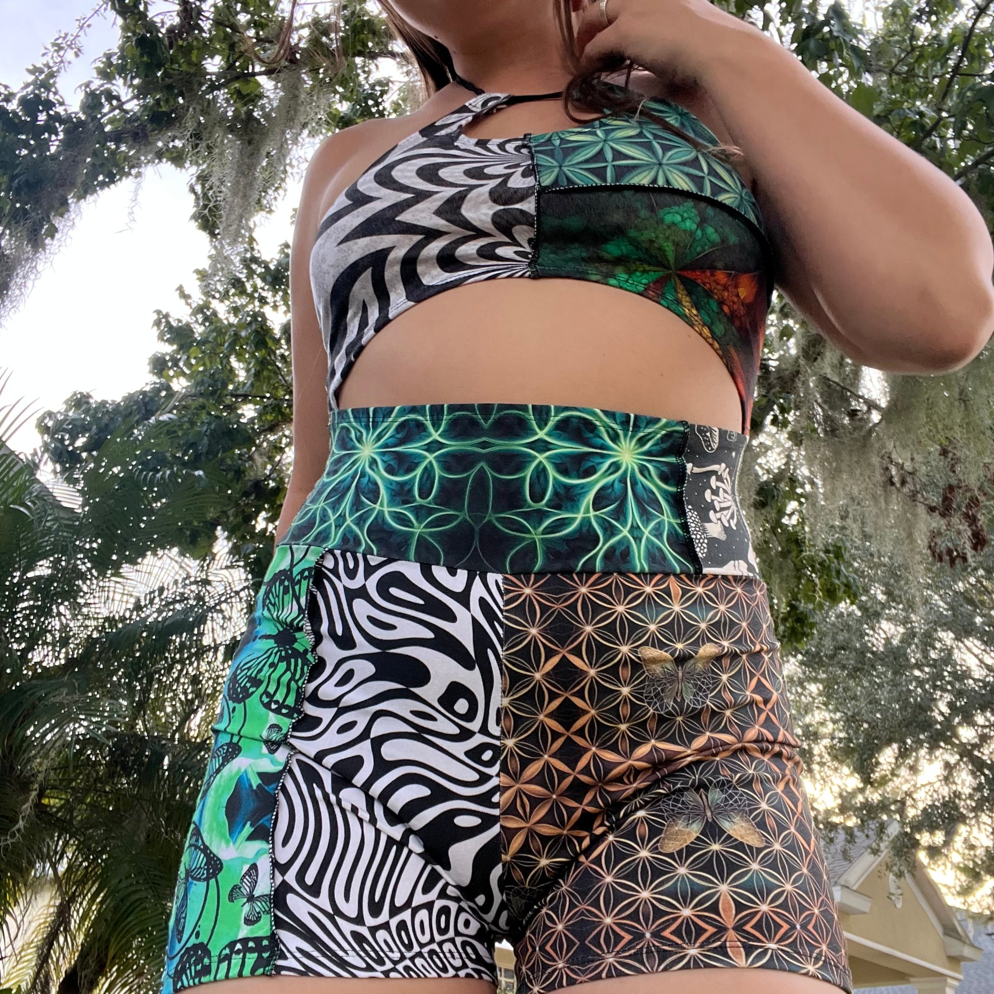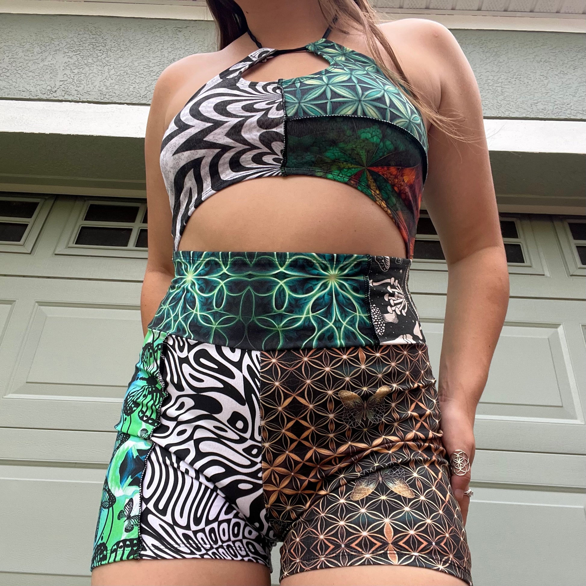 Mostly all patterned fabric is 93% Cotton 7% Spandex - It’s a 4 way stretch that’s very comfortable and allows for movement & breathability while also holding you in just right, contents of solid fabrics vary because I tend to switch them up, but I normally stick with natural fibers. 99% of everything I make is fire safe and can confidently be worn while flowing with fire props. Feel free to email me if you have questions about a specific one :)