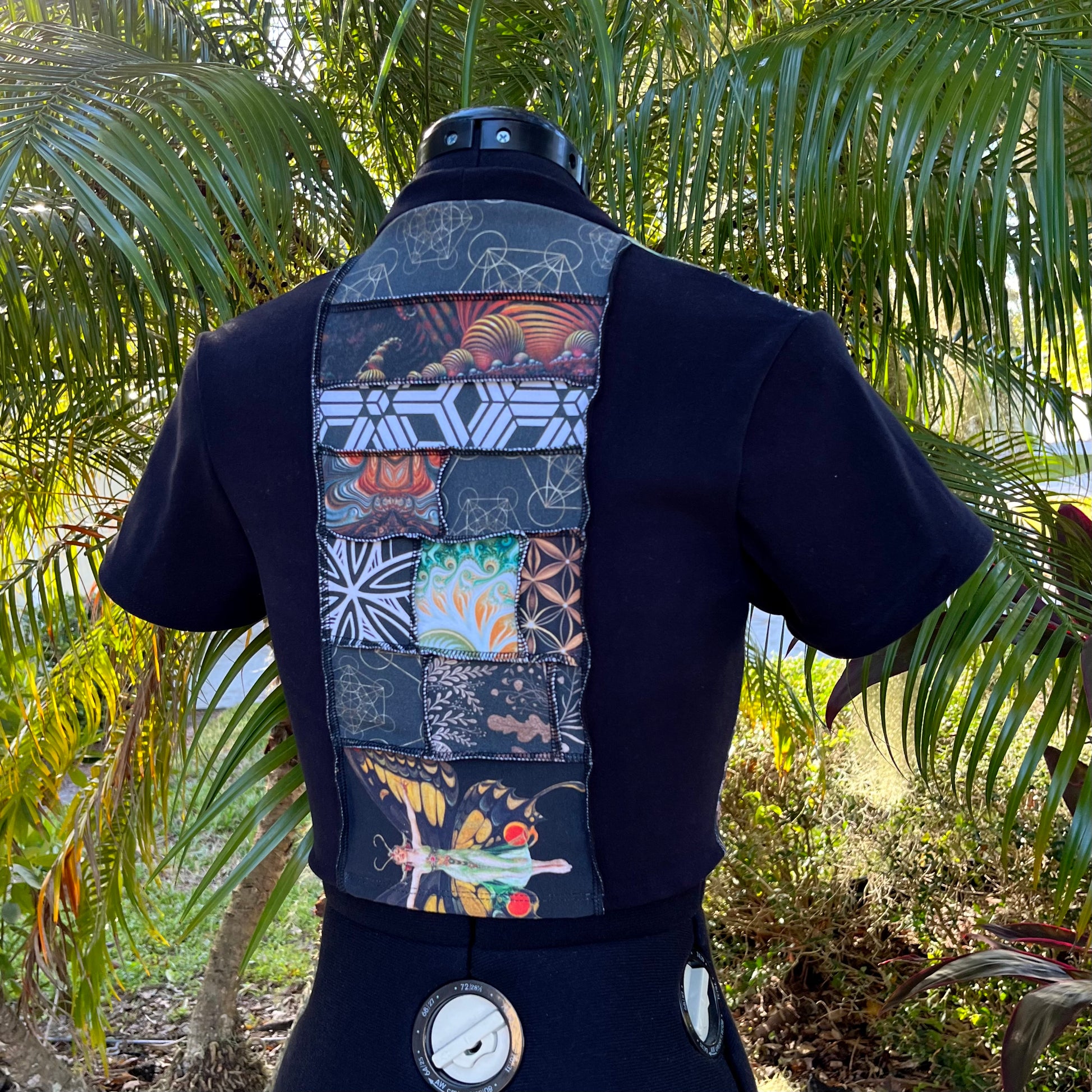 Mostly all patterned fabric is 93% Cotton 7% Spandex - It’s a 4 way stretch that’s very comfortable and allows for movement & breathability while also holding you in just right, contents of solid fabrics vary because I tend to switch them up, but I normally stick with natural fibers. 99% of everything I make is fire safe and can confidently be worn while flowing with fire props. Feel free to email me if you have questions about a specific one :)