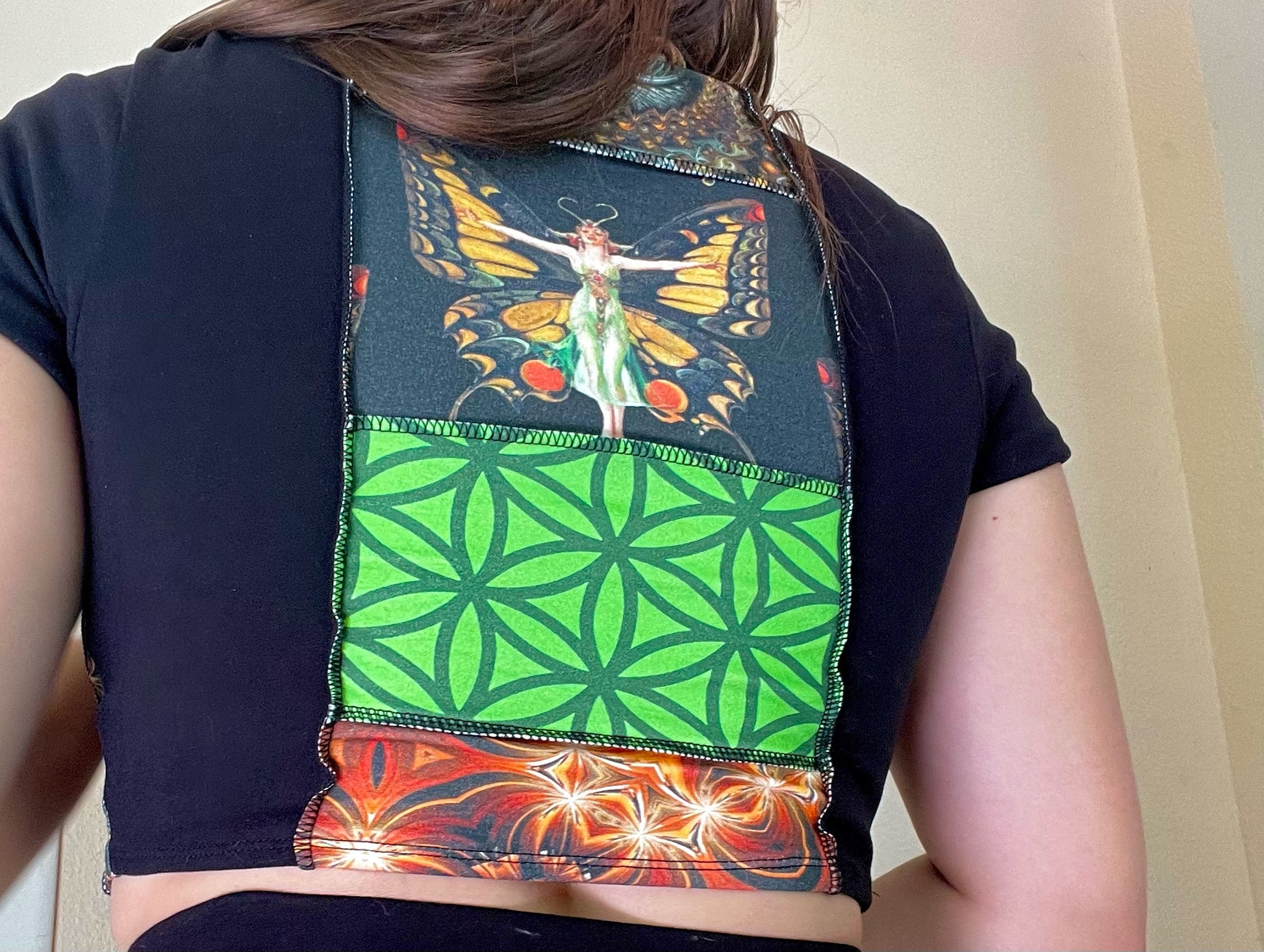 Mostly all patterned fabric is 93% Cotton 7% Spandex - It’s a 4 way stretch that’s very comfortable and allows for movement & breathability while also holding you in just right, contents of solid fabrics vary because I tend to switch them up, but I normally stick with natural fibers. 99% of everything I make is fire safe and can confidently be worn while flowing with fire props. Feel free to email me if you have questions about a specific one :)