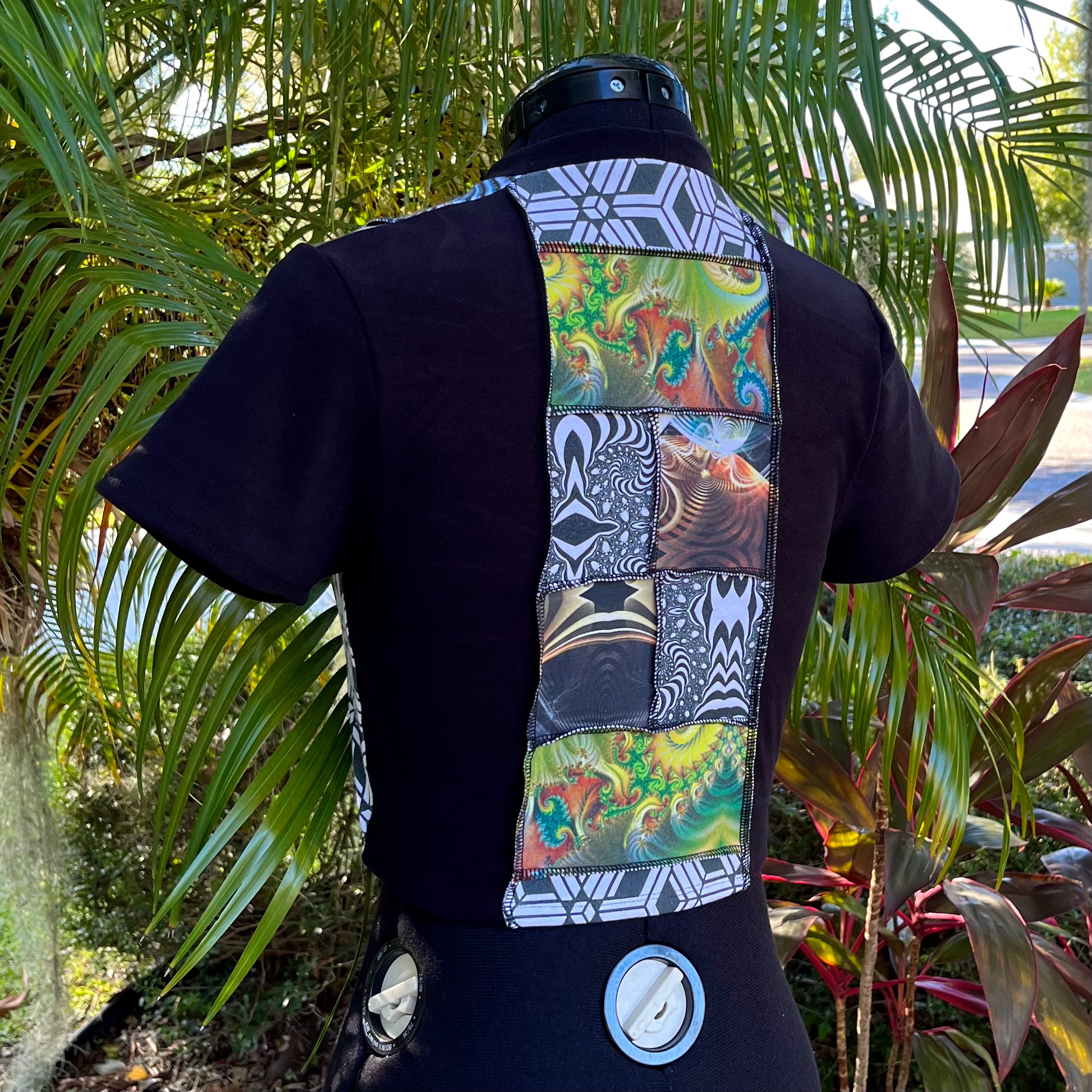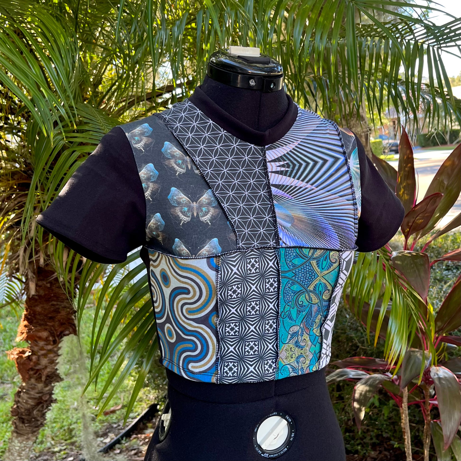 Mostly all patterned fabric is 93% Cotton 7% Spandex - It’s a 4 way stretch that’s very comfortable and allows for movement & breathability while also holding you in just right, contents of solid fabrics vary because I tend to switch them up, but I normally stick with natural fibers. 99% of everything I make is fire safe and can confidently be worn while flowing with fire props. Feel free to email me if you have questions about a specific one :)