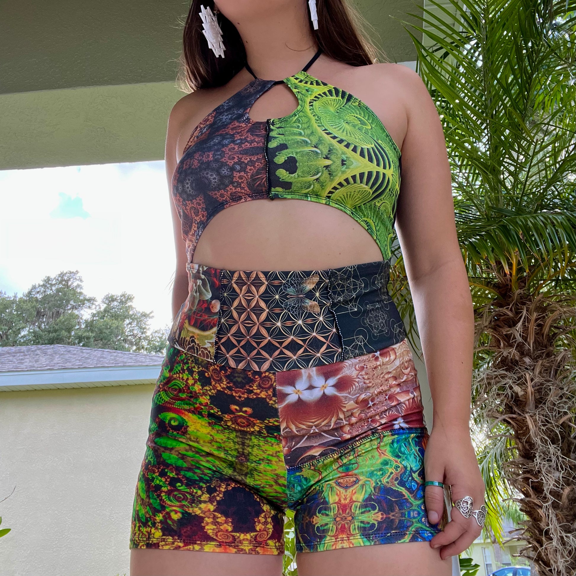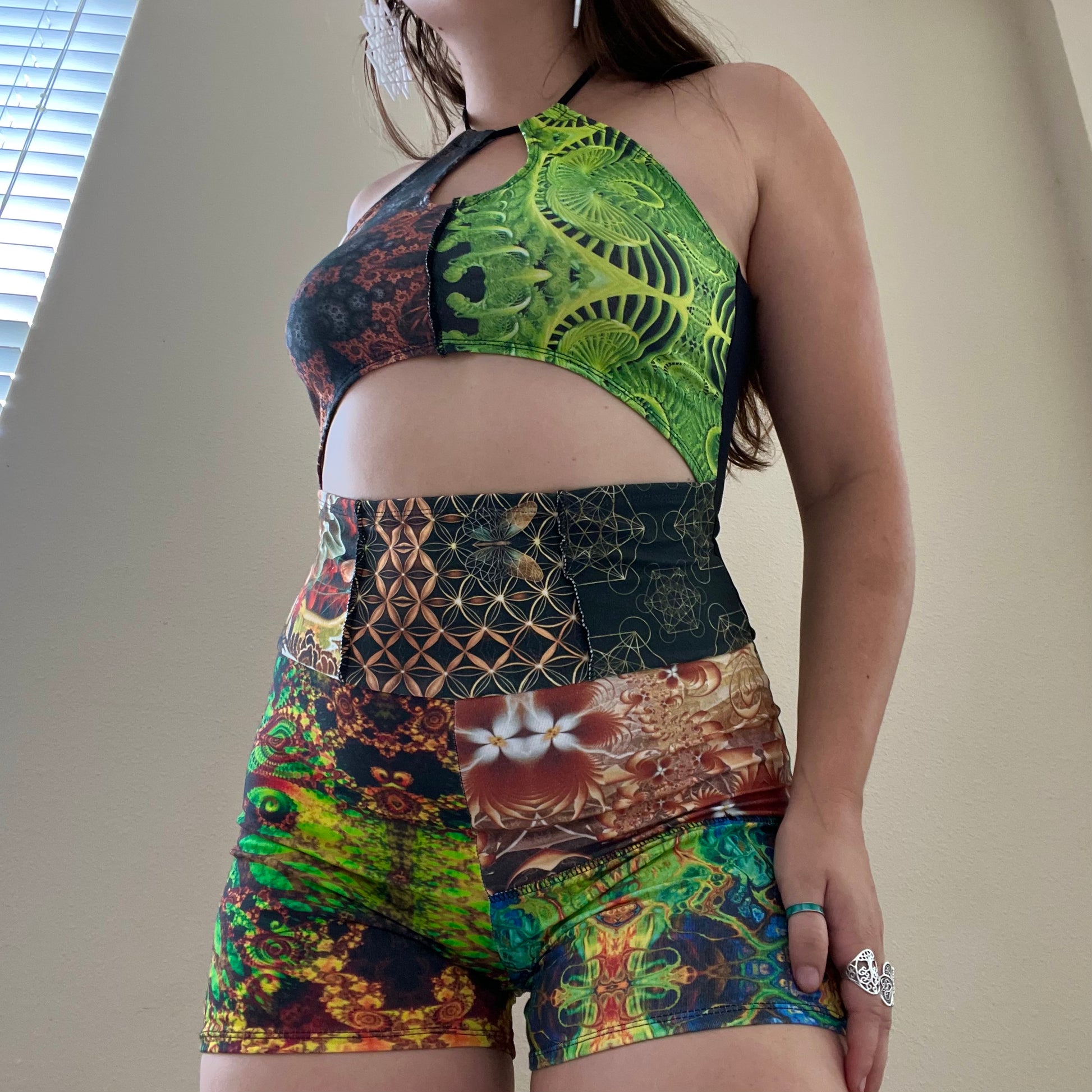 Mostly all patterned fabric is 93% Cotton 7% Spandex - It’s a 4 way stretch that’s very comfortable and allows for movement & breathability while also holding you in just right, contents of solid fabrics vary because I tend to switch them up, but I normally stick with natural fibers. 99% of everything I make is fire safe and can confidently be worn while flowing with fire props. Feel free to email me if you have questions about a specific one :)