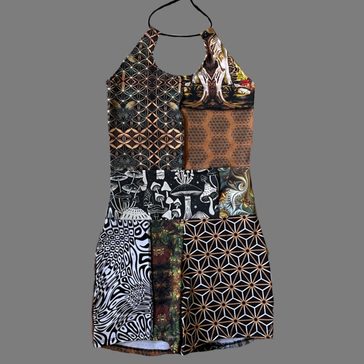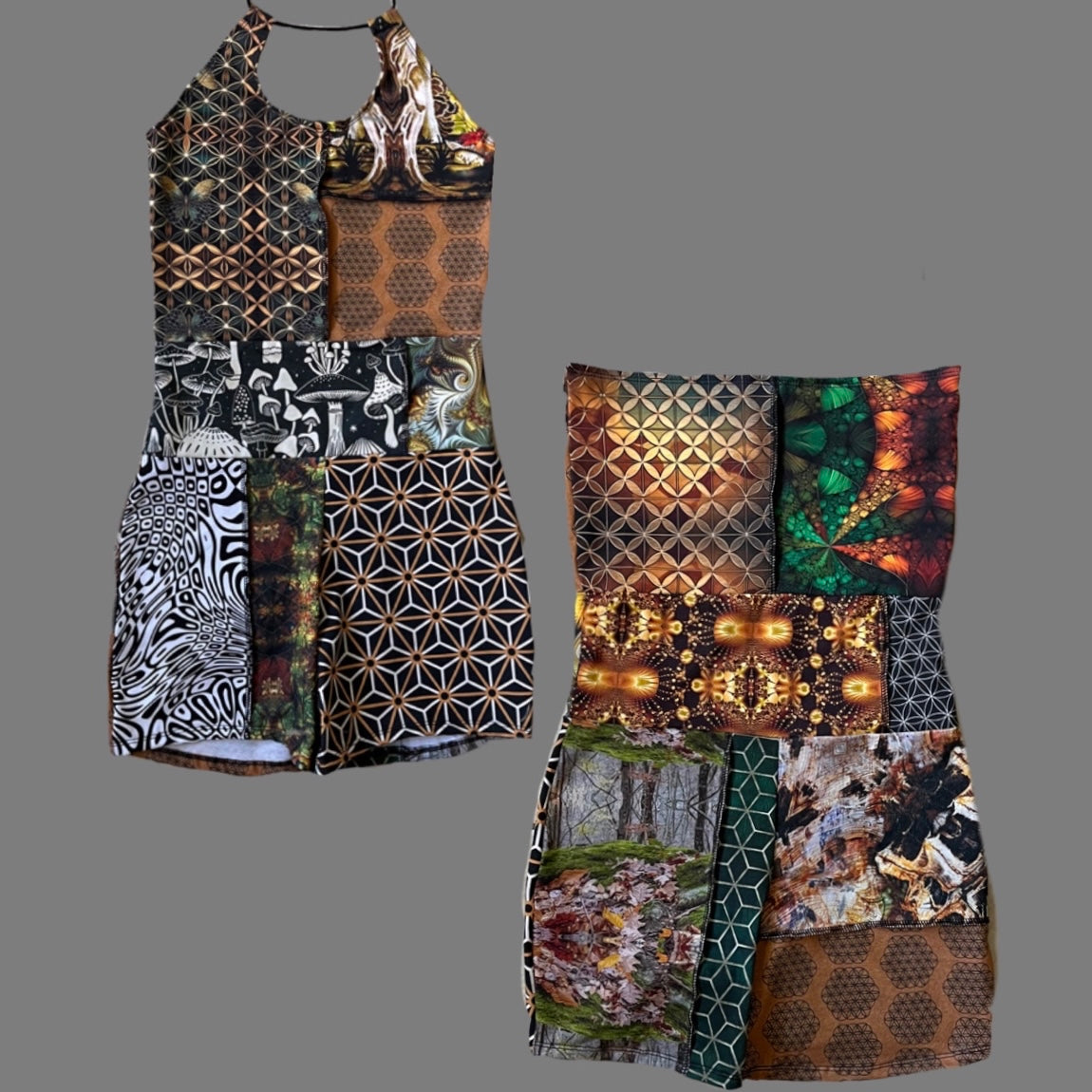 Mostly all patterned fabric is 93% Cotton 7% Spandex - It’s a 4 way stretch that’s very comfortable and allows for movement & breathability while also holding you in just right, contents of solid fabrics vary because I tend to switch them up, but I normally stick with natural fibers. 99% of everything I make is fire safe and can confidently be worn while flowing with fire props. Feel free to email me if you have questions about a specific one :)