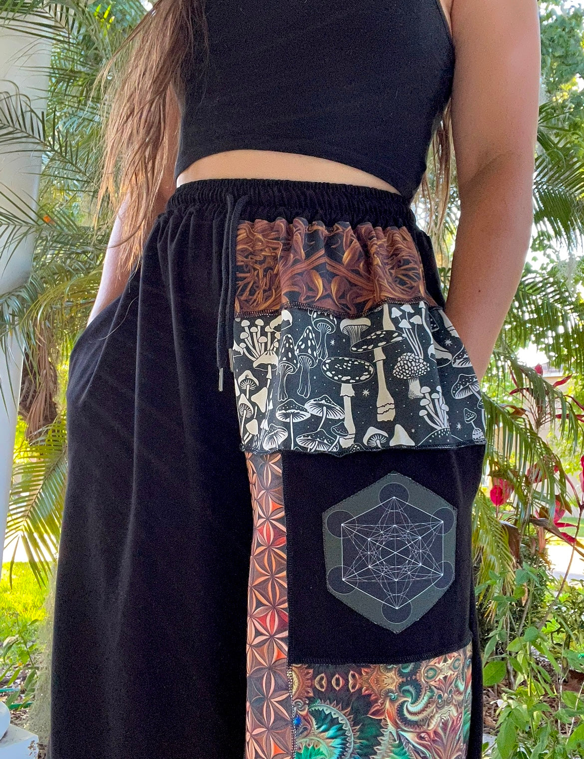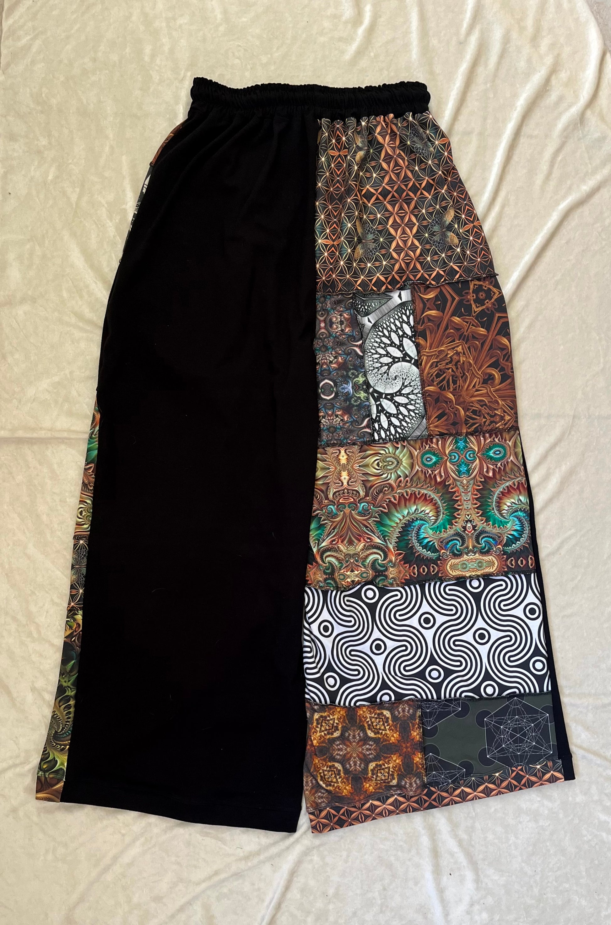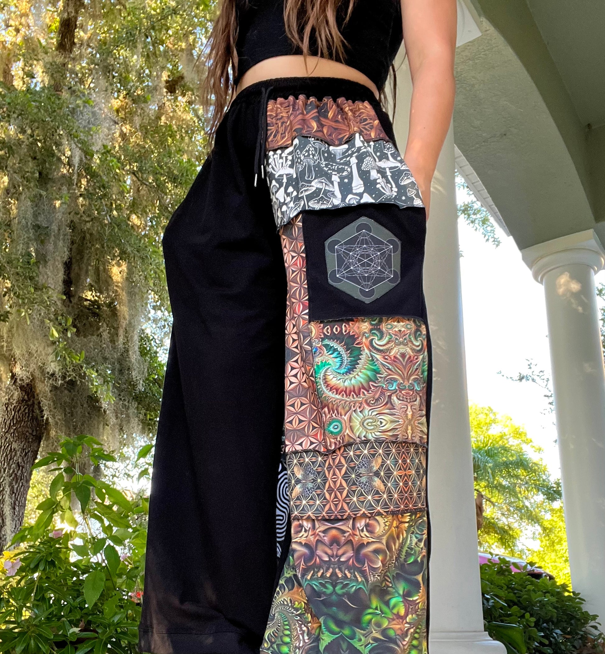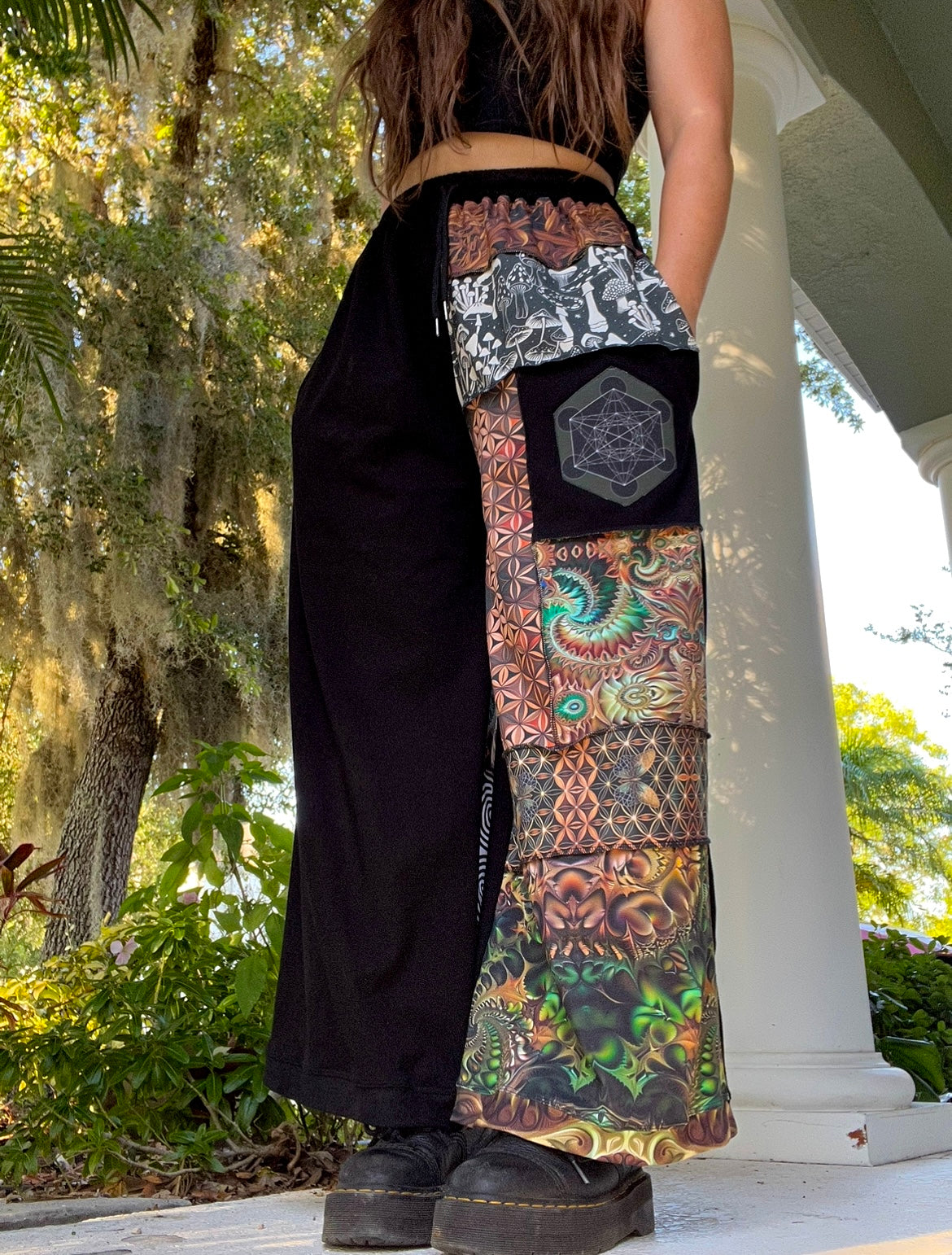 Mostly all patterned fabric is 93% Cotton 7% Spandex - It’s a 4 way stretch that’s very comfortable and allows for movement & breathability while also holding you in just right, contents of solid fabrics vary because I tend to switch them up, but I normally stick with natural fibers. 99% of everything I make is fire safe and can confidently be worn while flowing with fire props. Feel free to email me if you have questions about a specific one :)