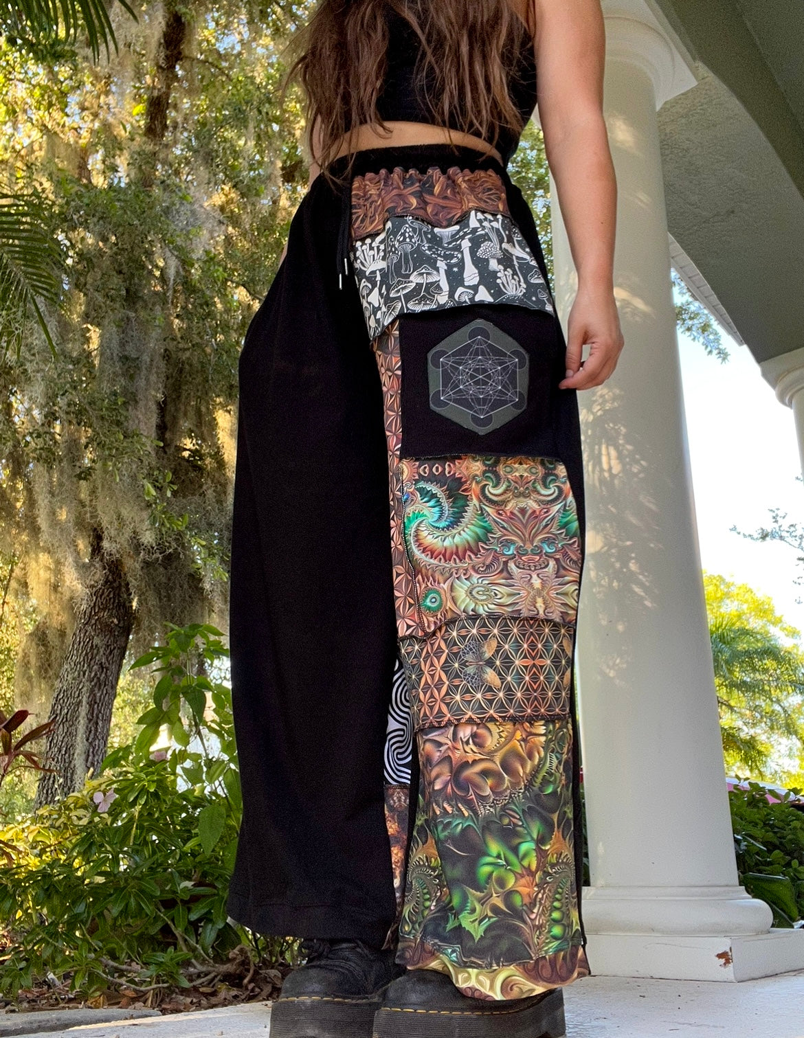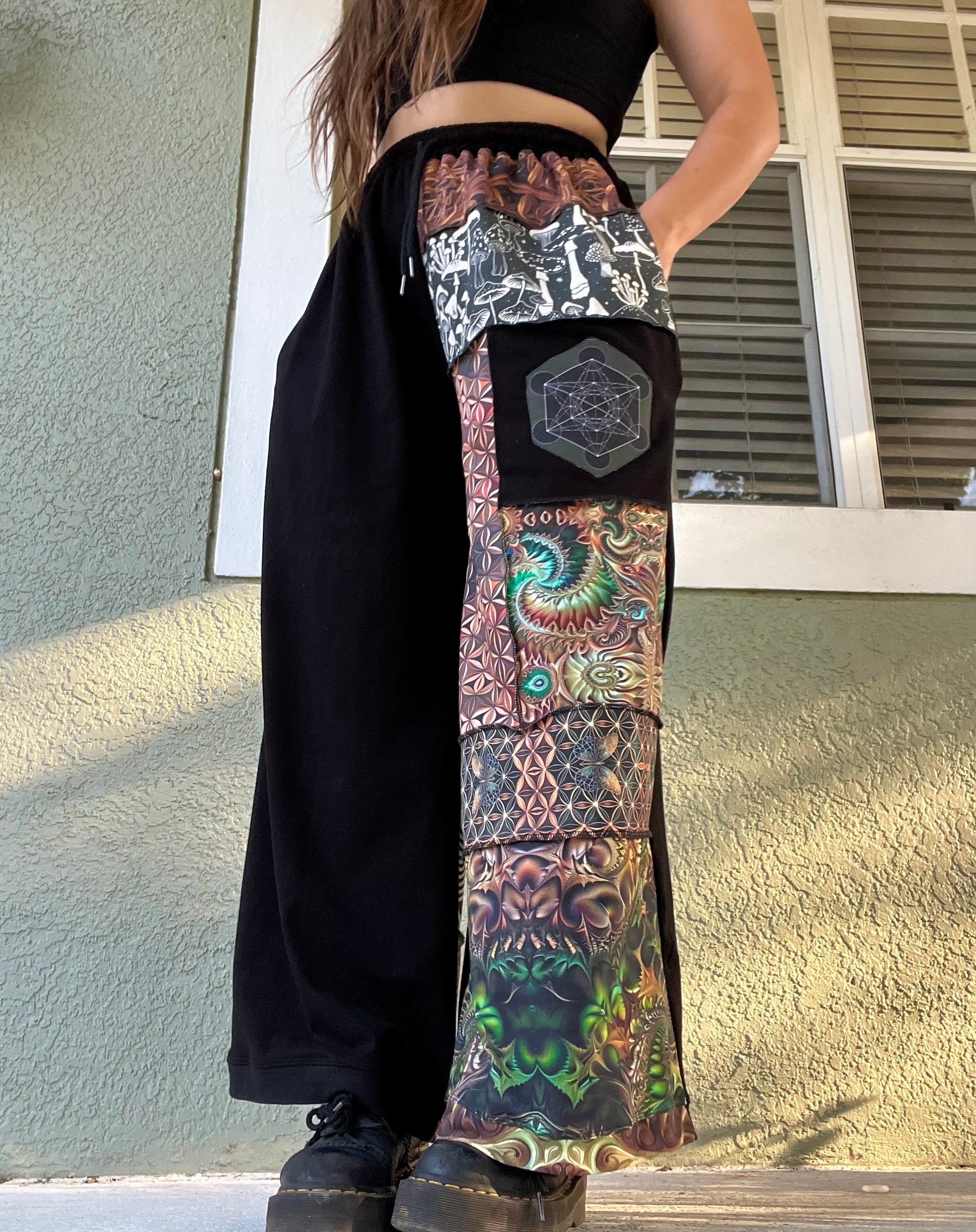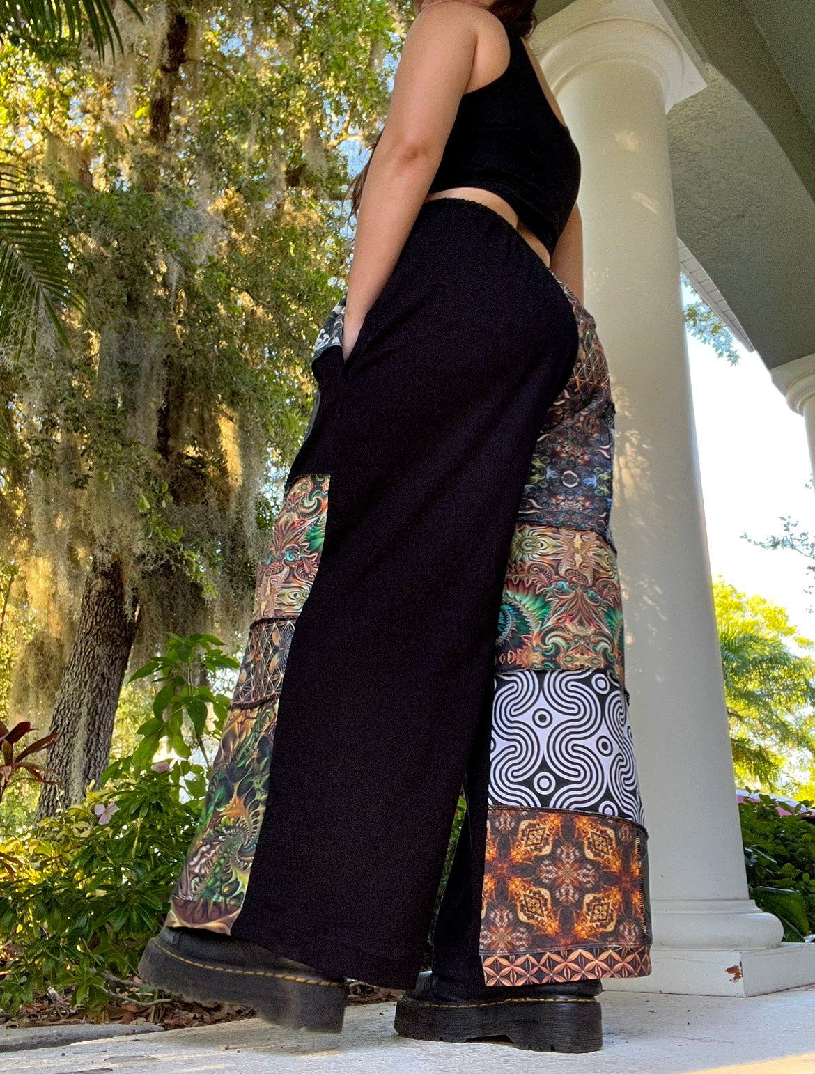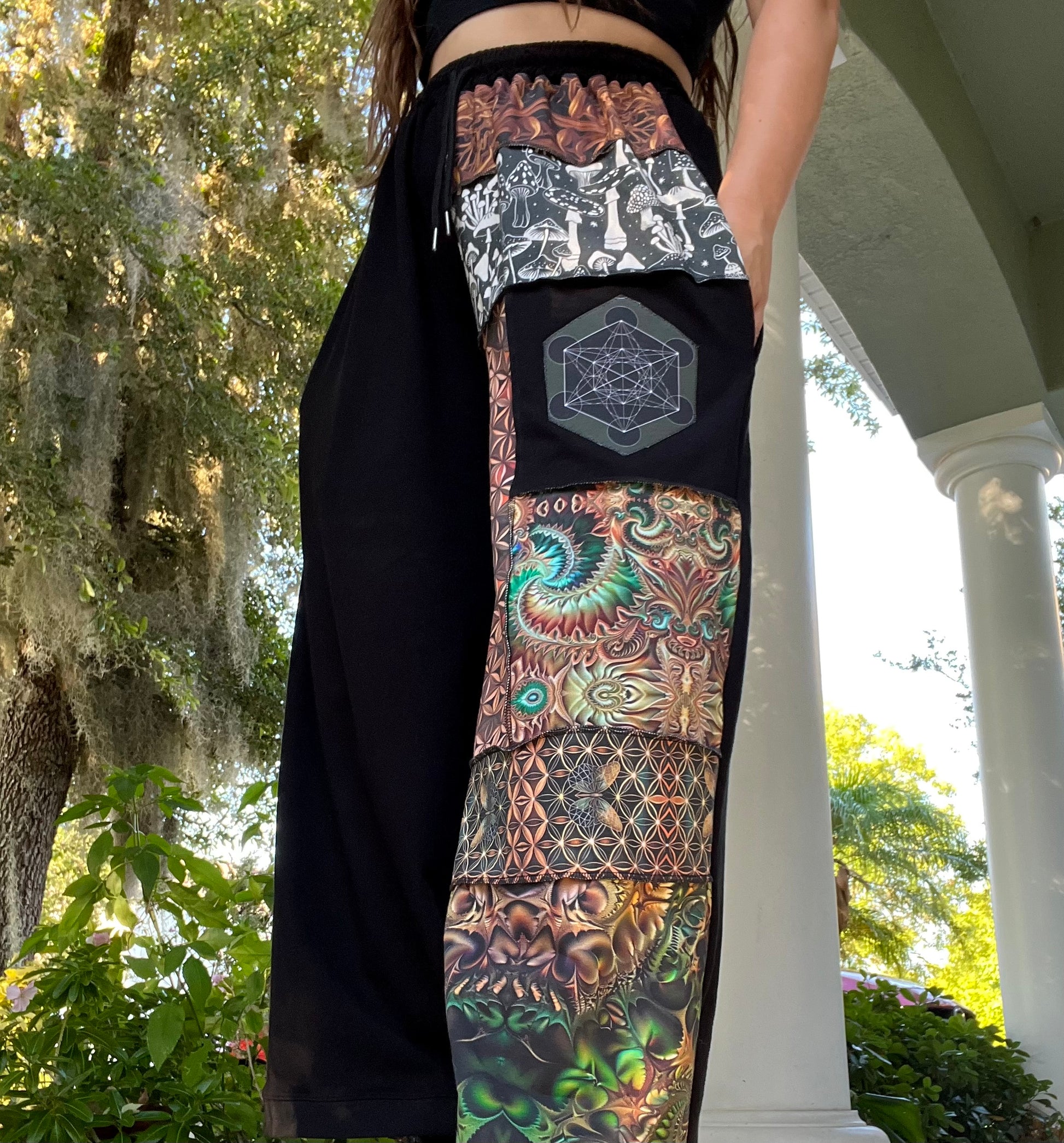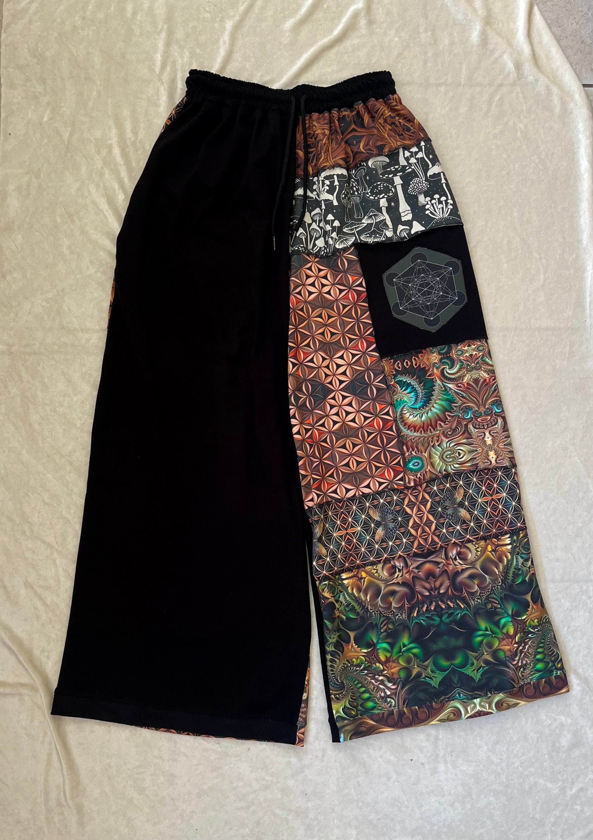 Mostly all patterned fabric is 93% Cotton 7% Spandex - It’s a 4 way stretch that’s very comfortable and allows for movement & breathability while also holding you in just right, contents of solid fabrics vary because I tend to switch them up, but I normally stick with natural fibers. 99% of everything I make is fire safe and can confidently be worn while flowing with fire props. Feel free to email me if you have questions about a specific one :)