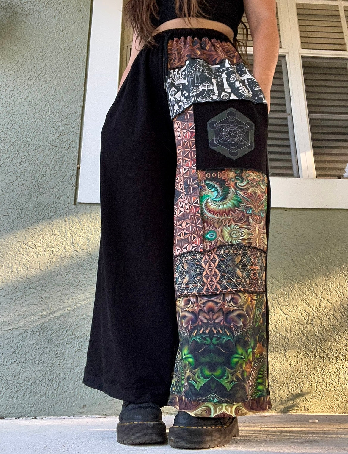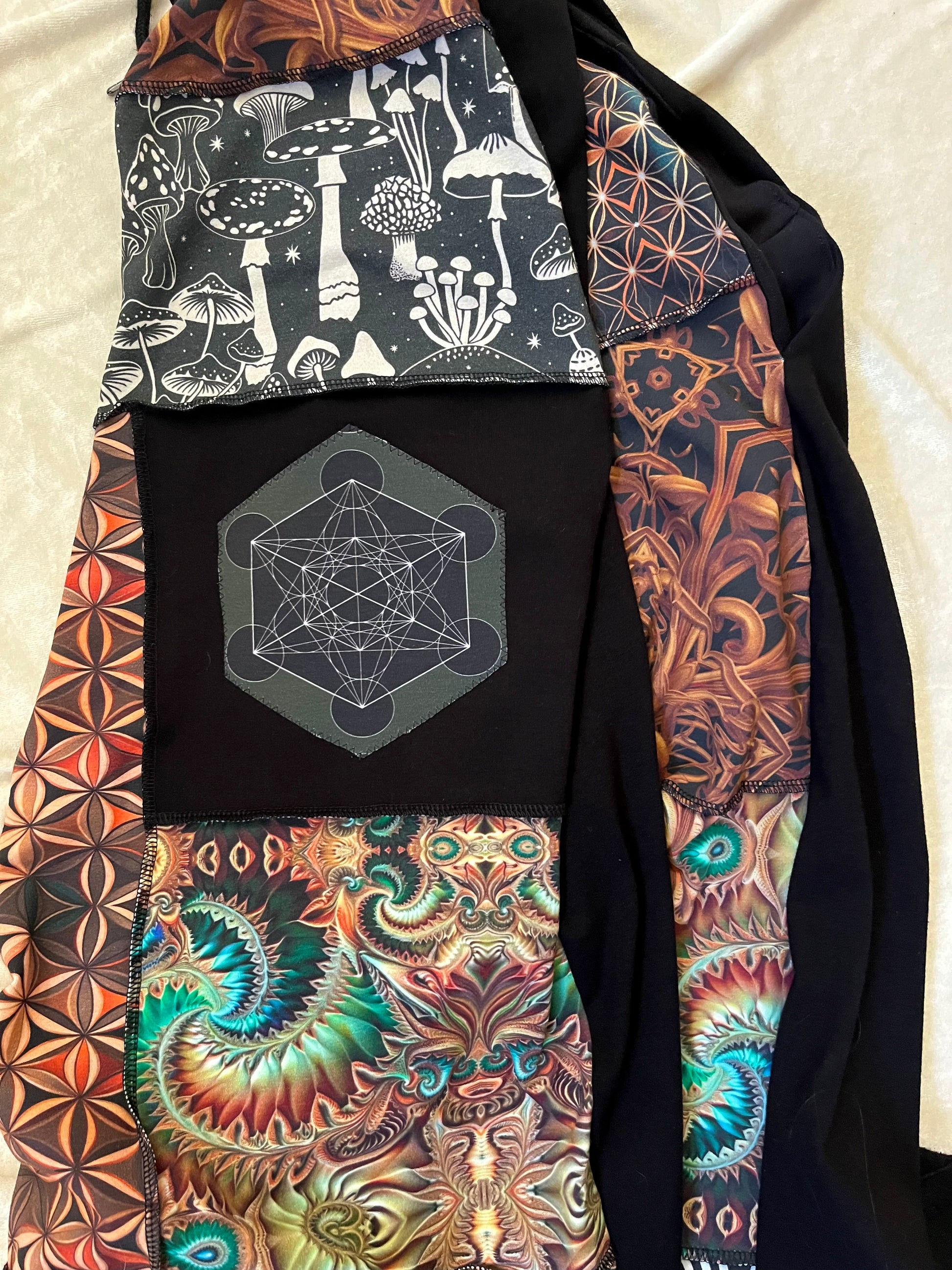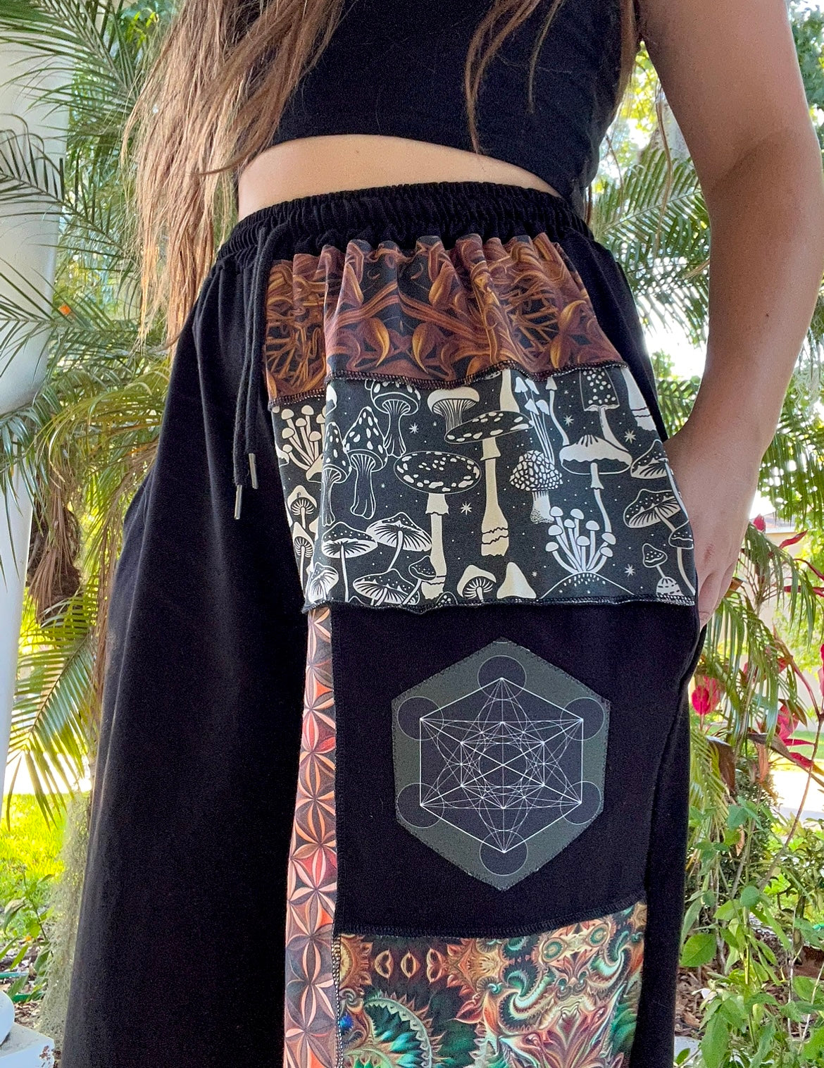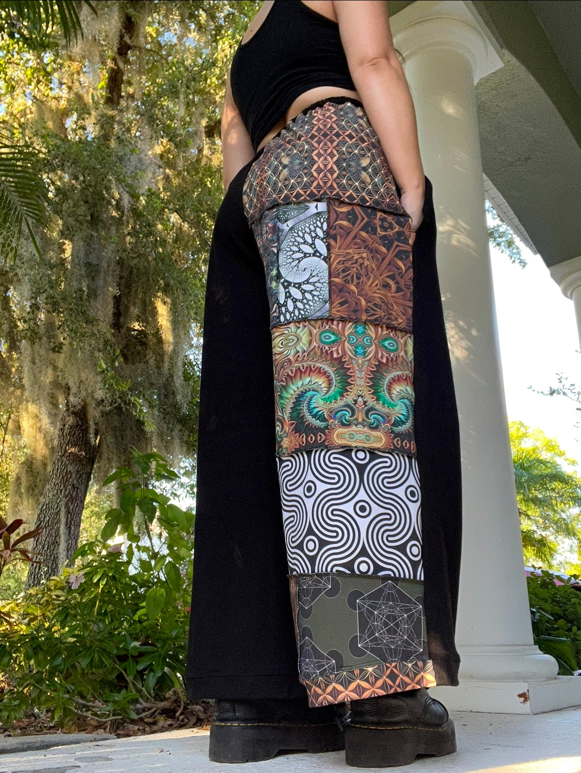 Mostly all patterned fabric is 93% Cotton 7% Spandex - It’s a 4 way stretch that’s very comfortable and allows for movement & breathability while also holding you in just right, contents of solid fabrics vary because I tend to switch them up, but I normally stick with natural fibers. 99% of everything I make is fire safe and can confidently be worn while flowing with fire props. Feel free to email me if you have questions about a specific one :)