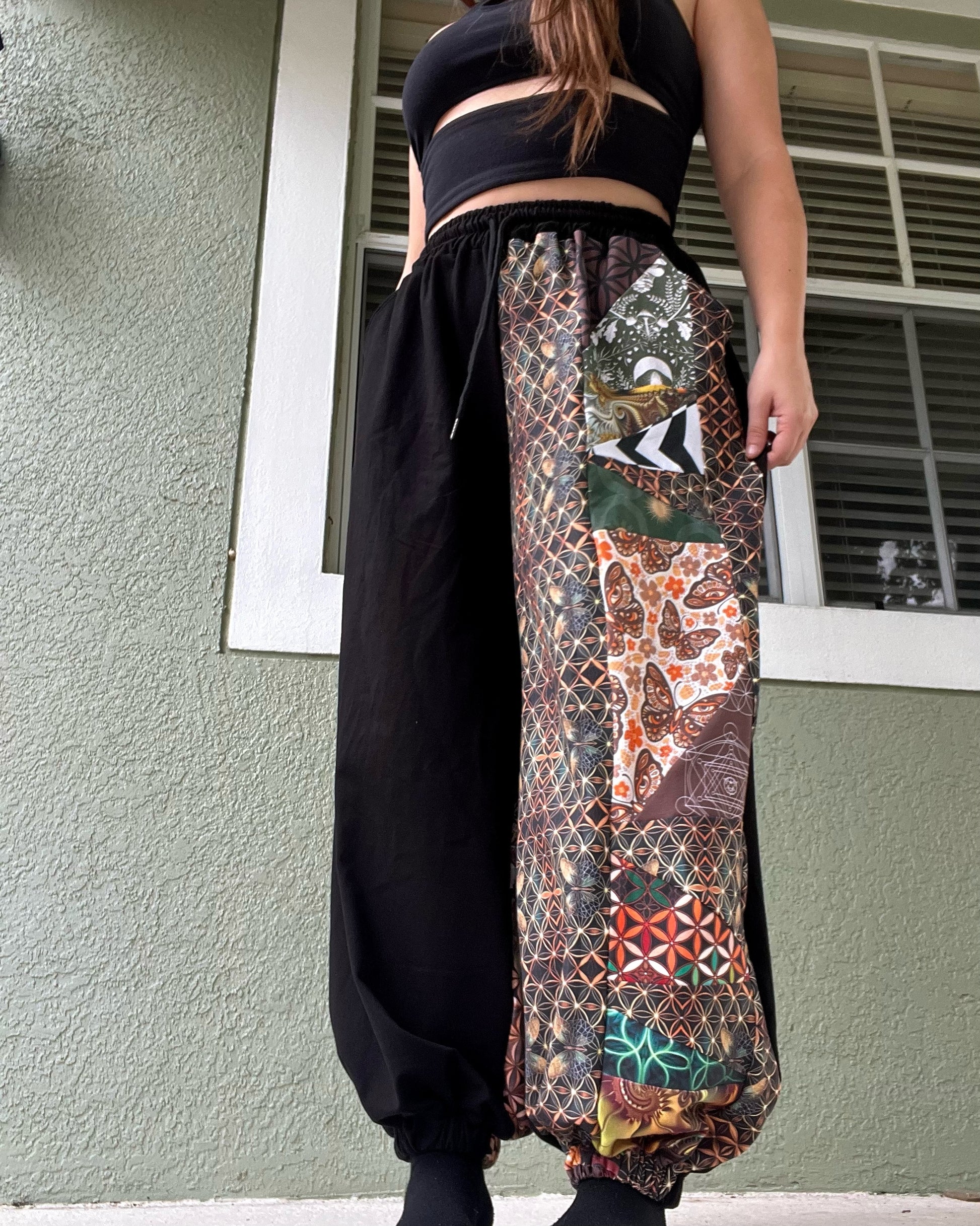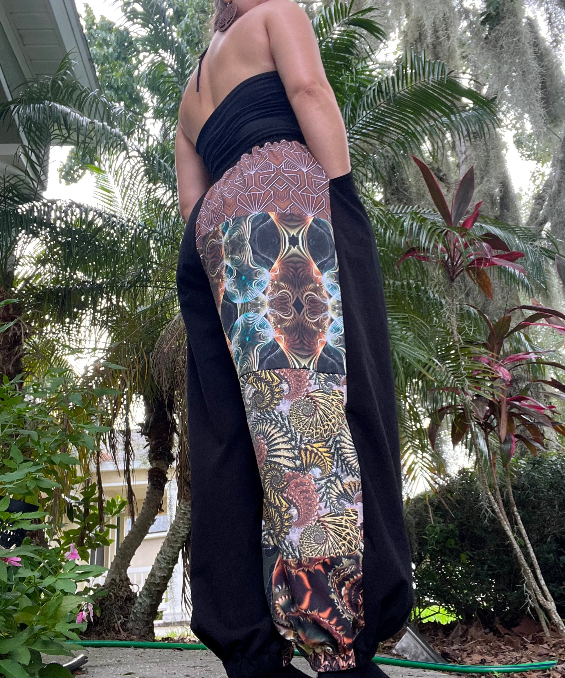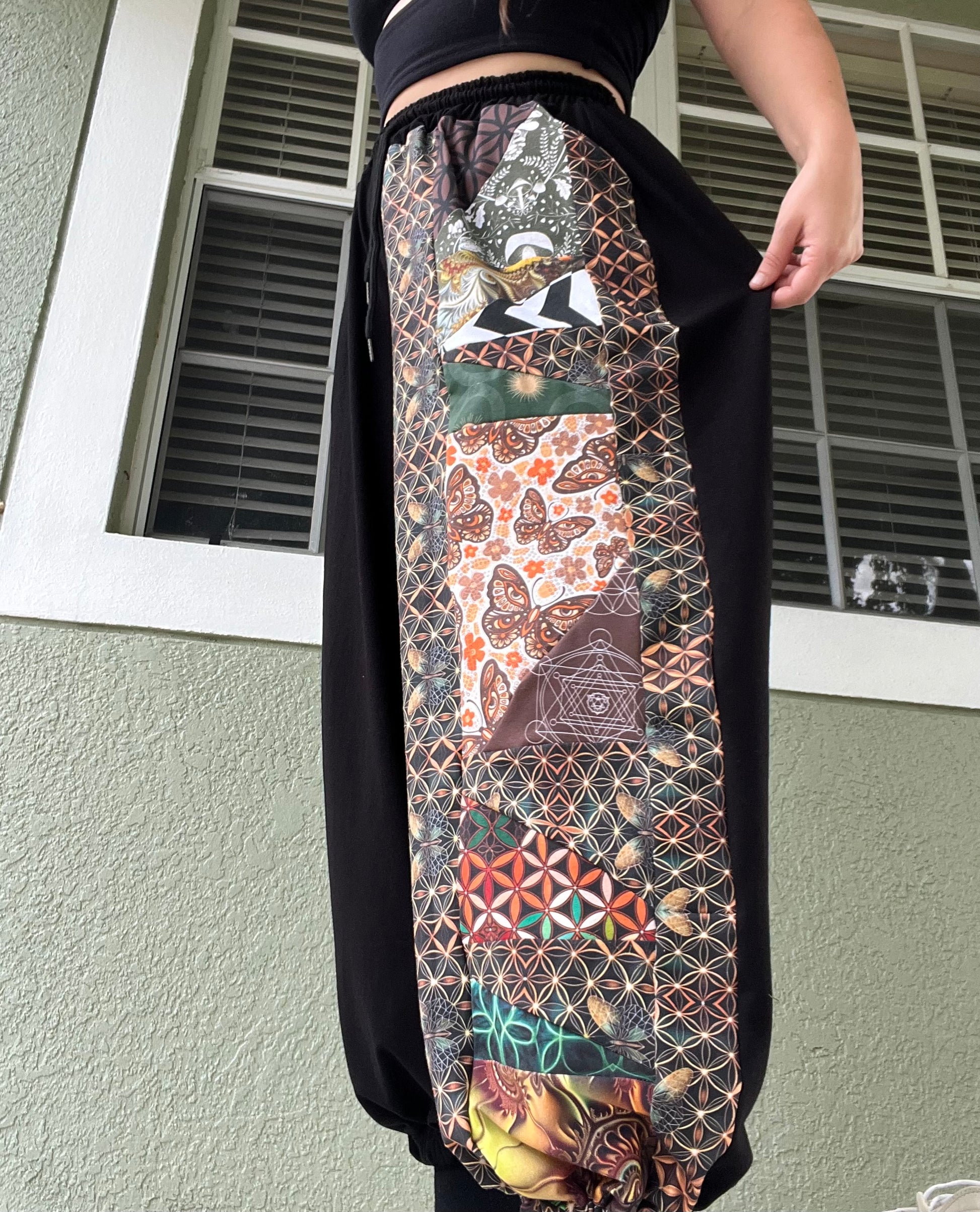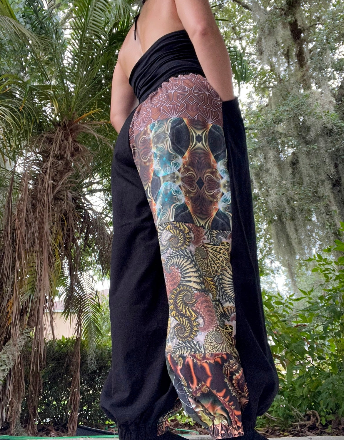 Mostly all patterned fabric is 93% Cotton 7% Spandex - It’s a 4 way stretch that’s very comfortable and allows for movement & breathability while also holding you in just right, contents of solid fabrics vary because I tend to switch them up, but I normally stick with natural fibers. 99% of everything I make is fire safe and can confidently be worn while flowing with fire props. Feel free to email me if you have questions about a specific one :)