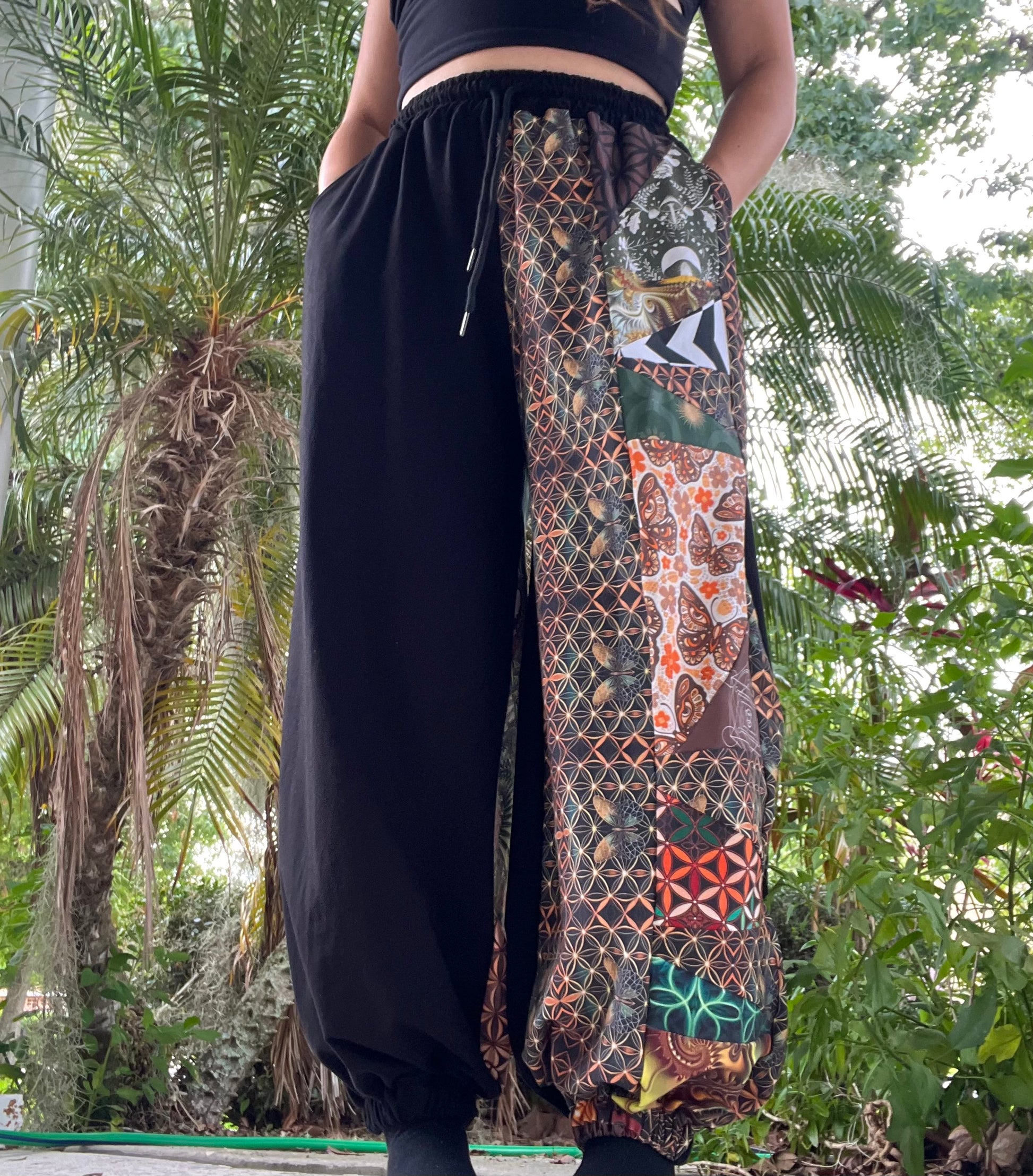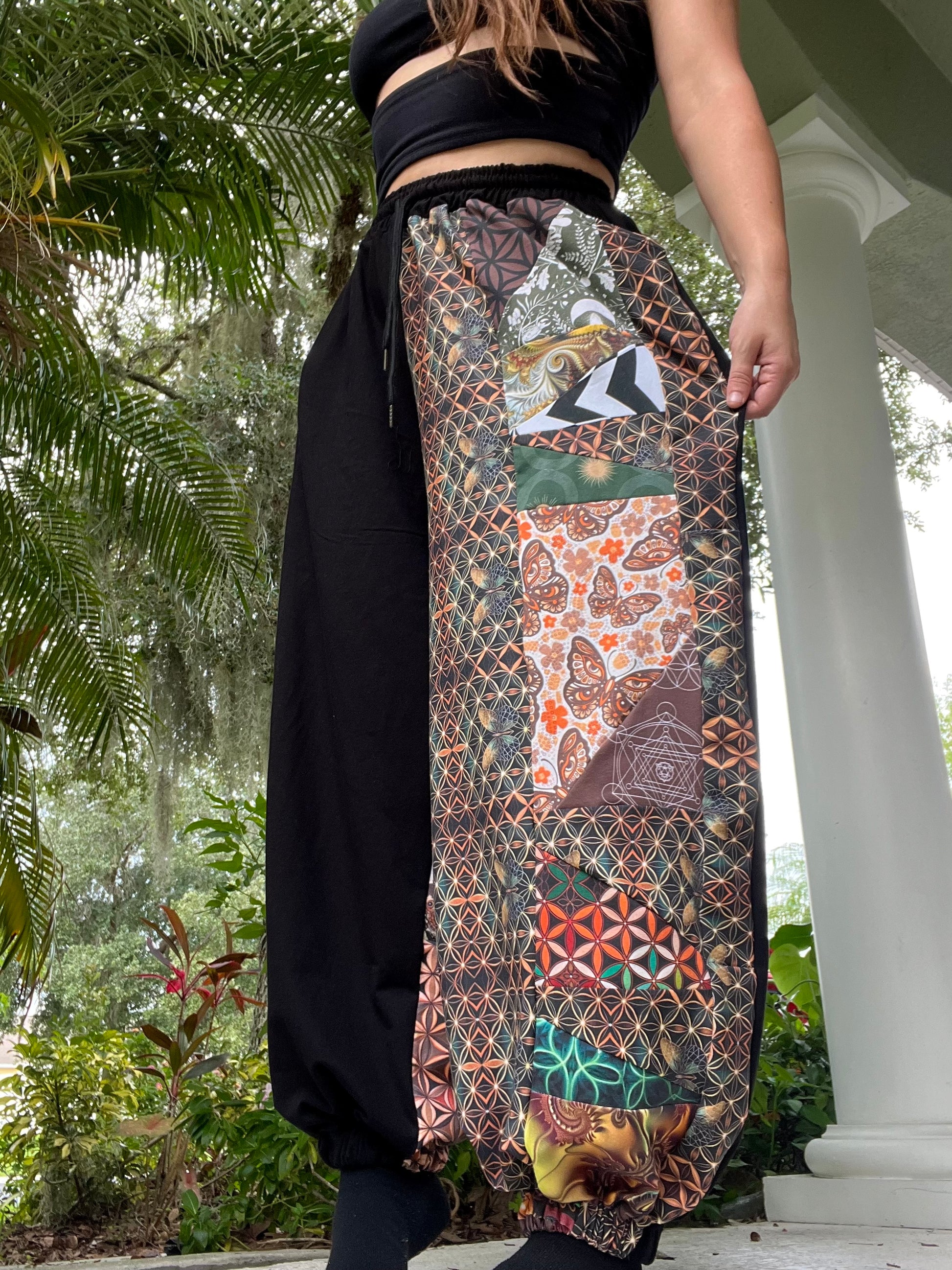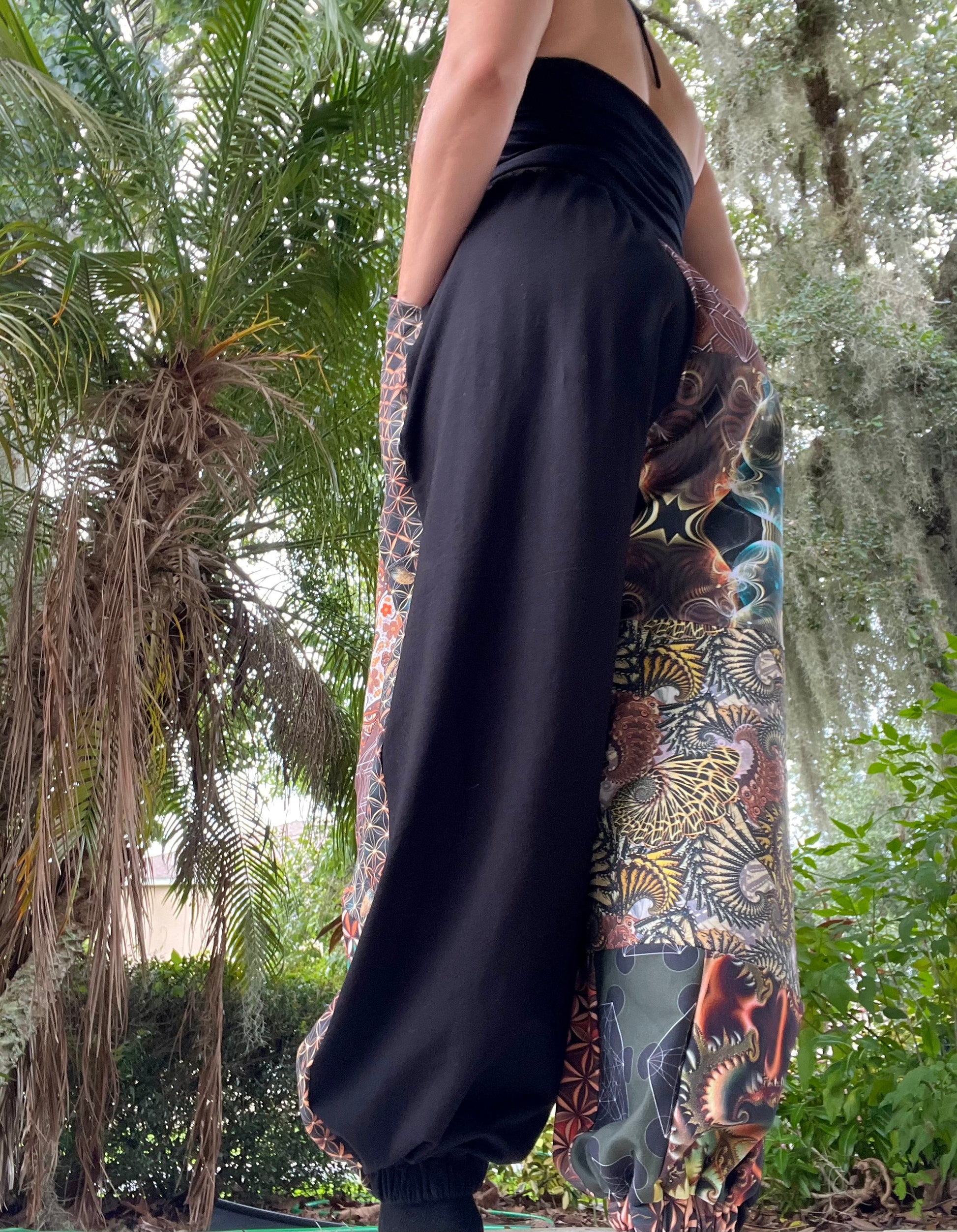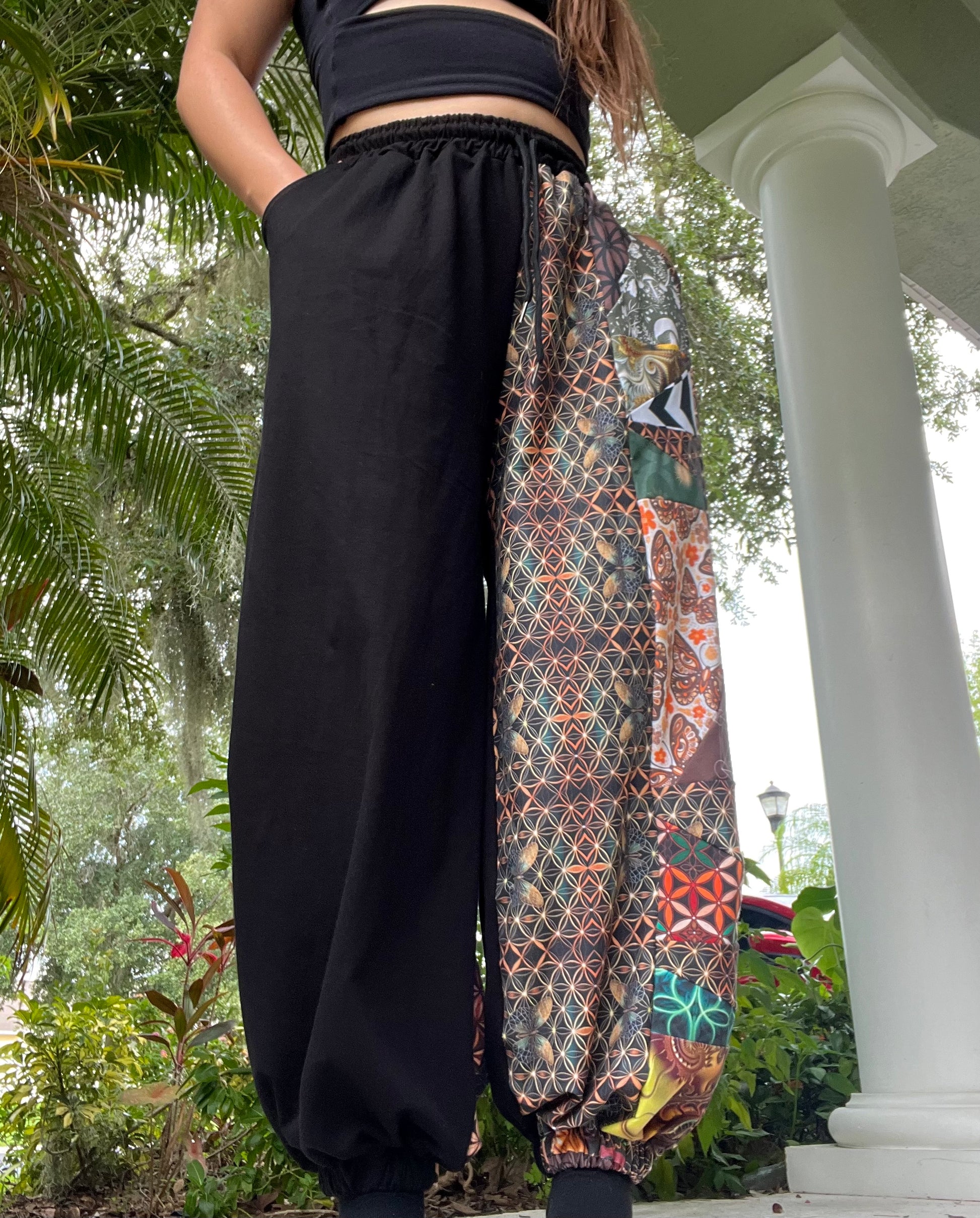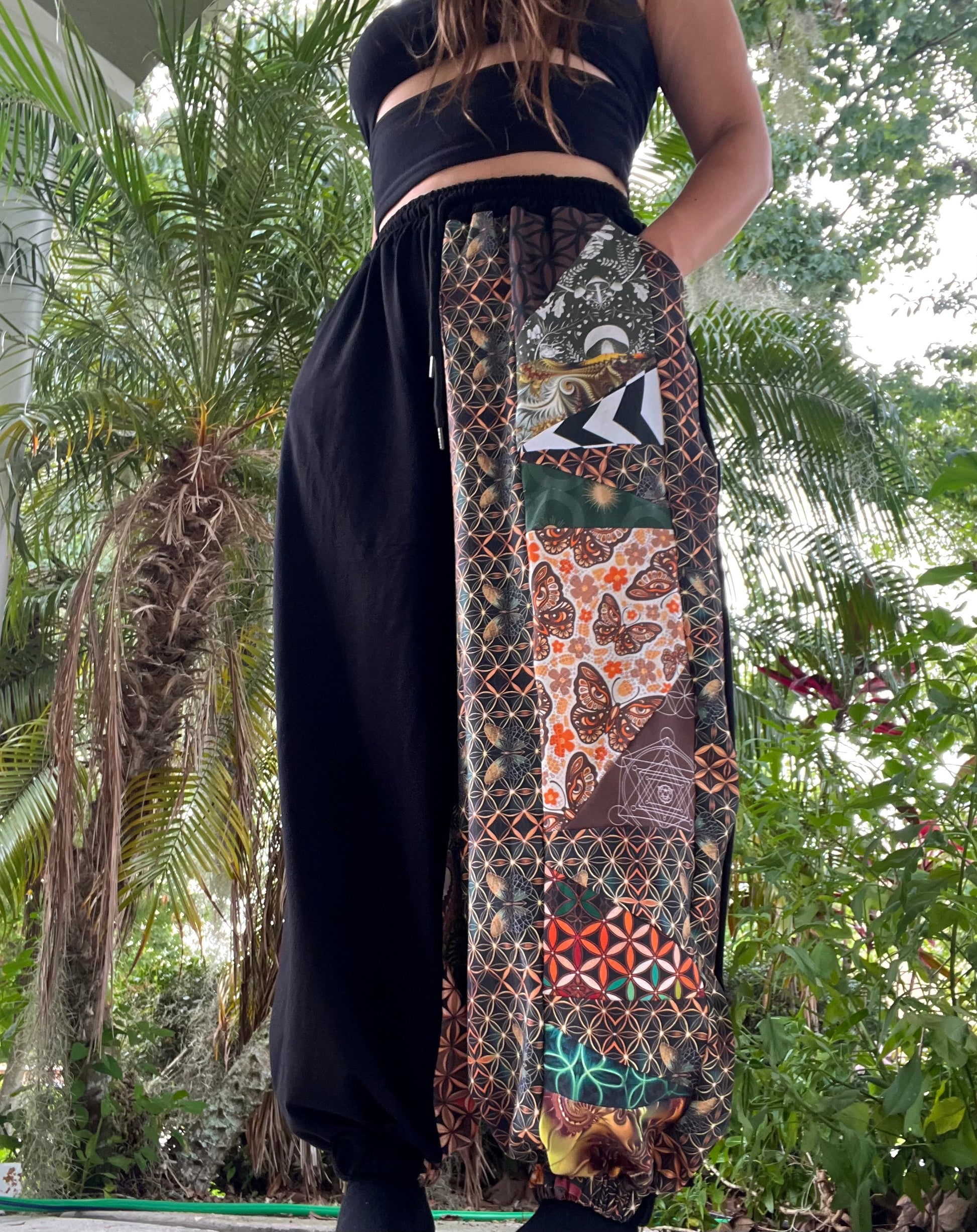 Mostly all patterned fabric is 93% Cotton 7% Spandex - It’s a 4 way stretch that’s very comfortable and allows for movement & breathability while also holding you in just right, contents of solid fabrics vary because I tend to switch them up, but I normally stick with natural fibers. 99% of everything I make is fire safe and can confidently be worn while flowing with fire props. Feel free to email me if you have questions about a specific one :)