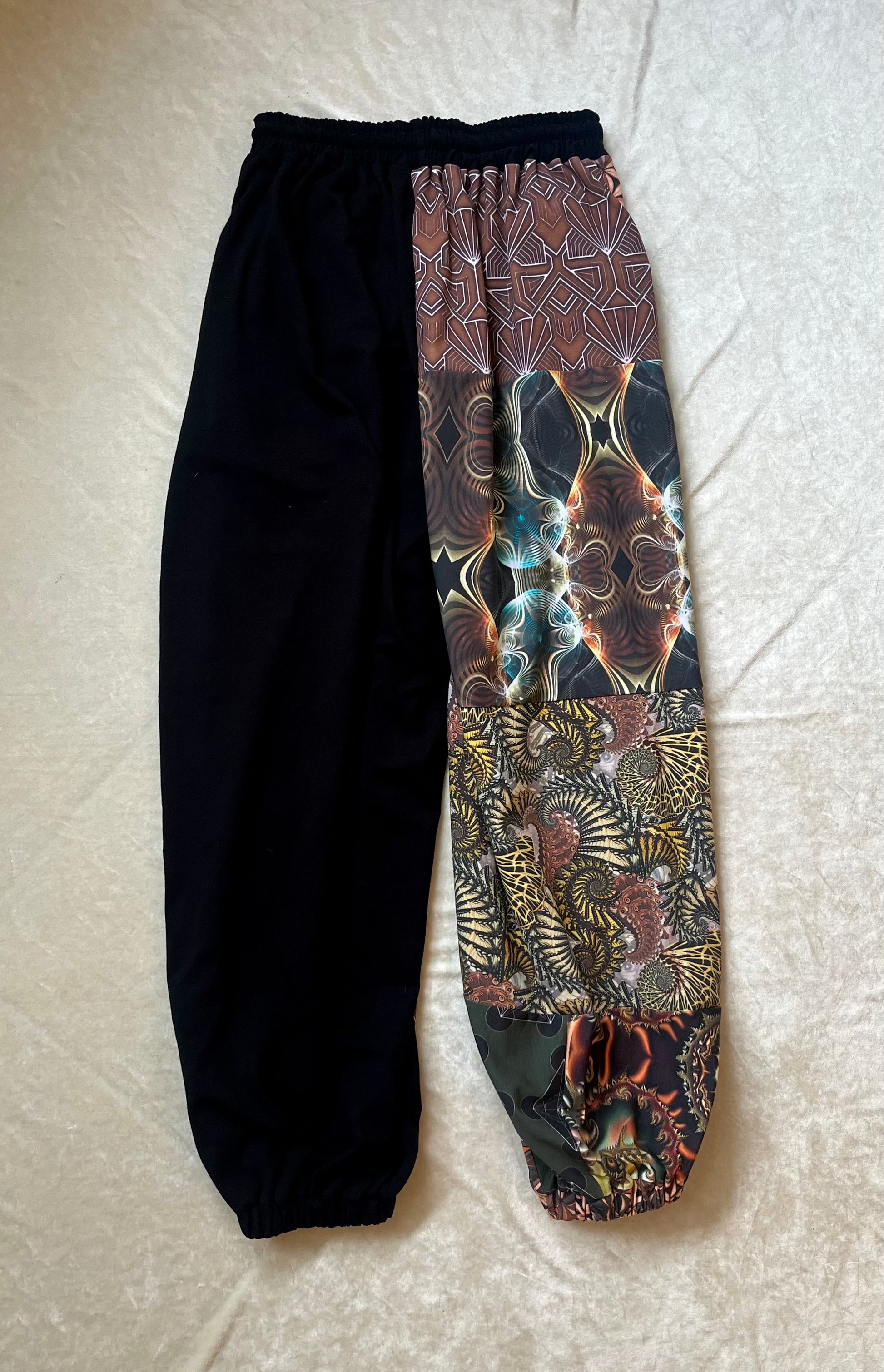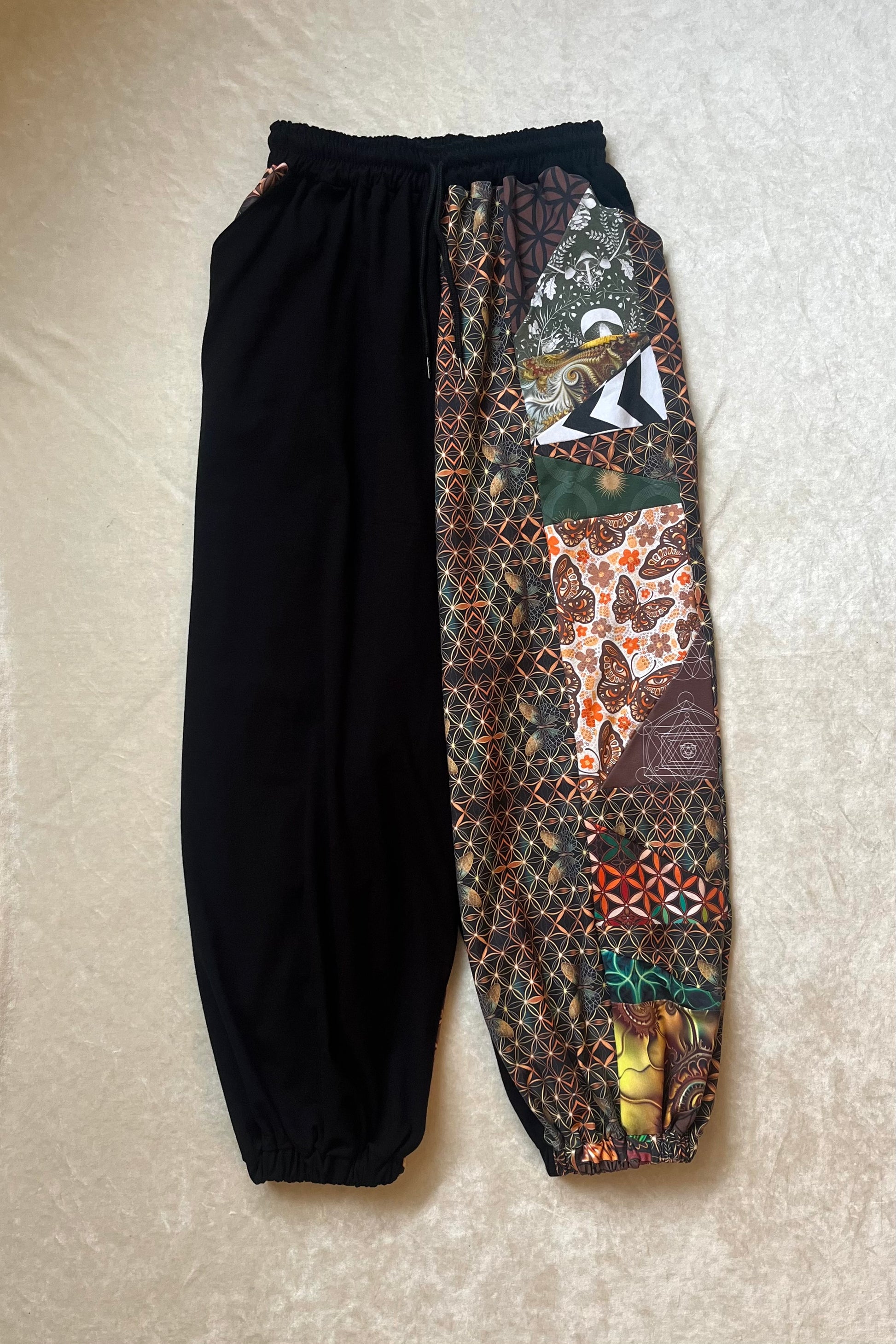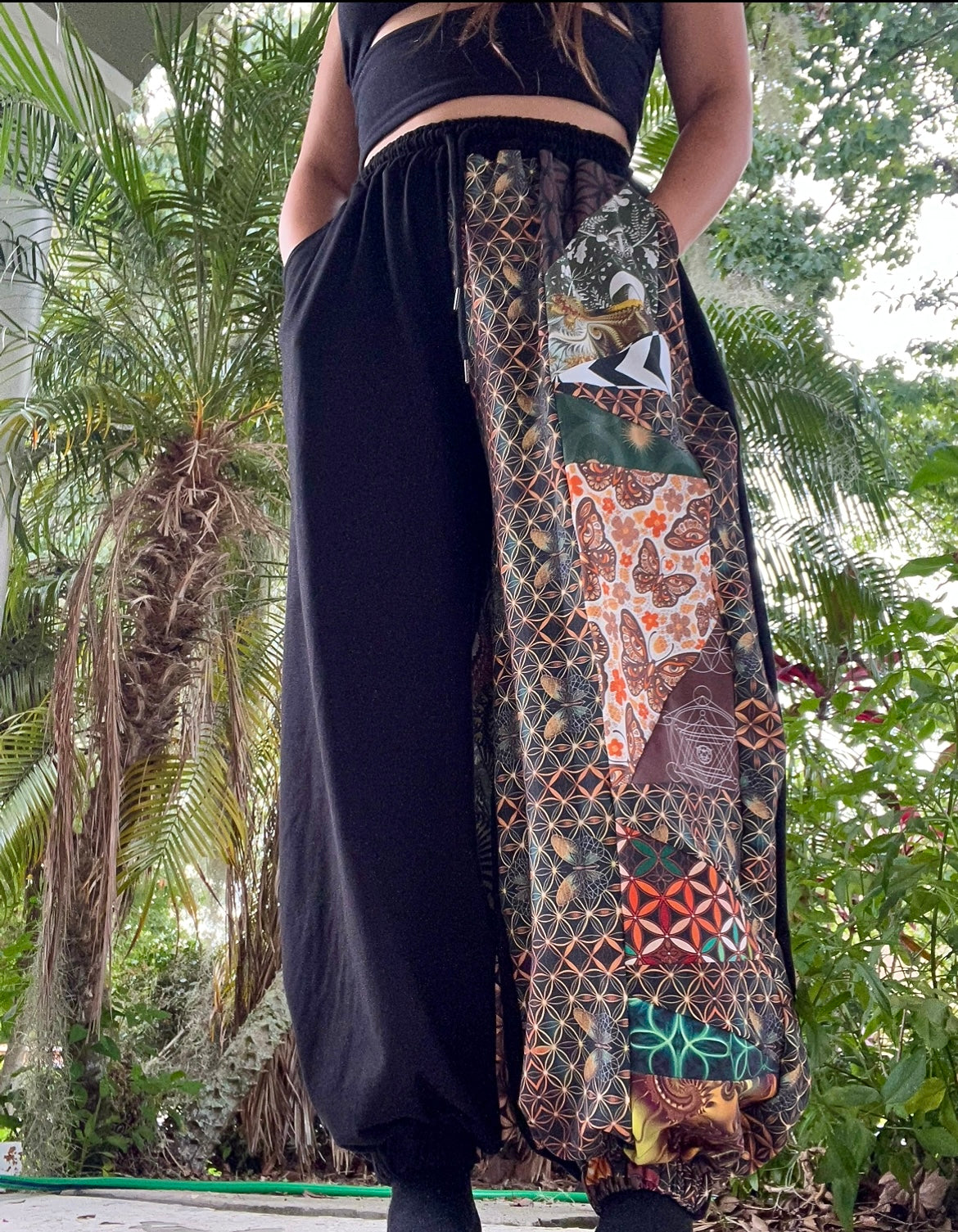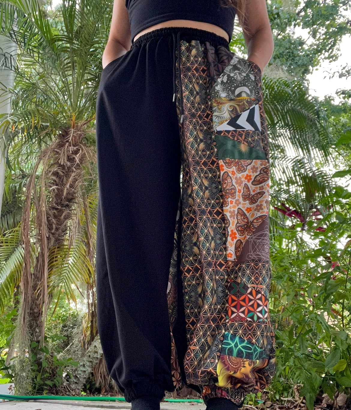Mostly all patterned fabric is 93% Cotton 7% Spandex - It’s a 4 way stretch that’s very comfortable and allows for movement & breathability while also holding you in just right, contents of solid fabrics vary because I tend to switch them up, but I normally stick with natural fibers. 99% of everything I make is fire safe and can confidently be worn while flowing with fire props. Feel free to email me if you have questions about a specific one :)