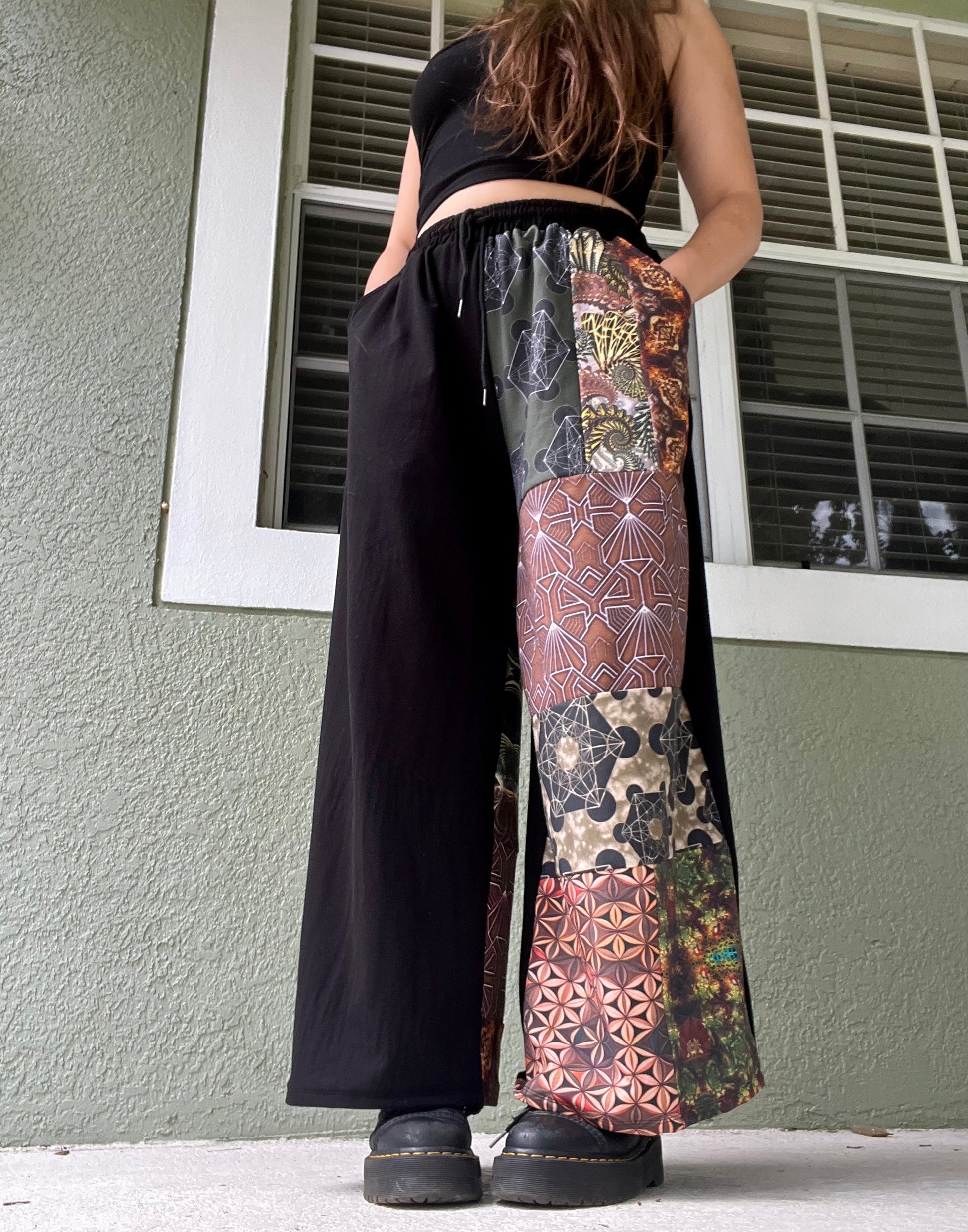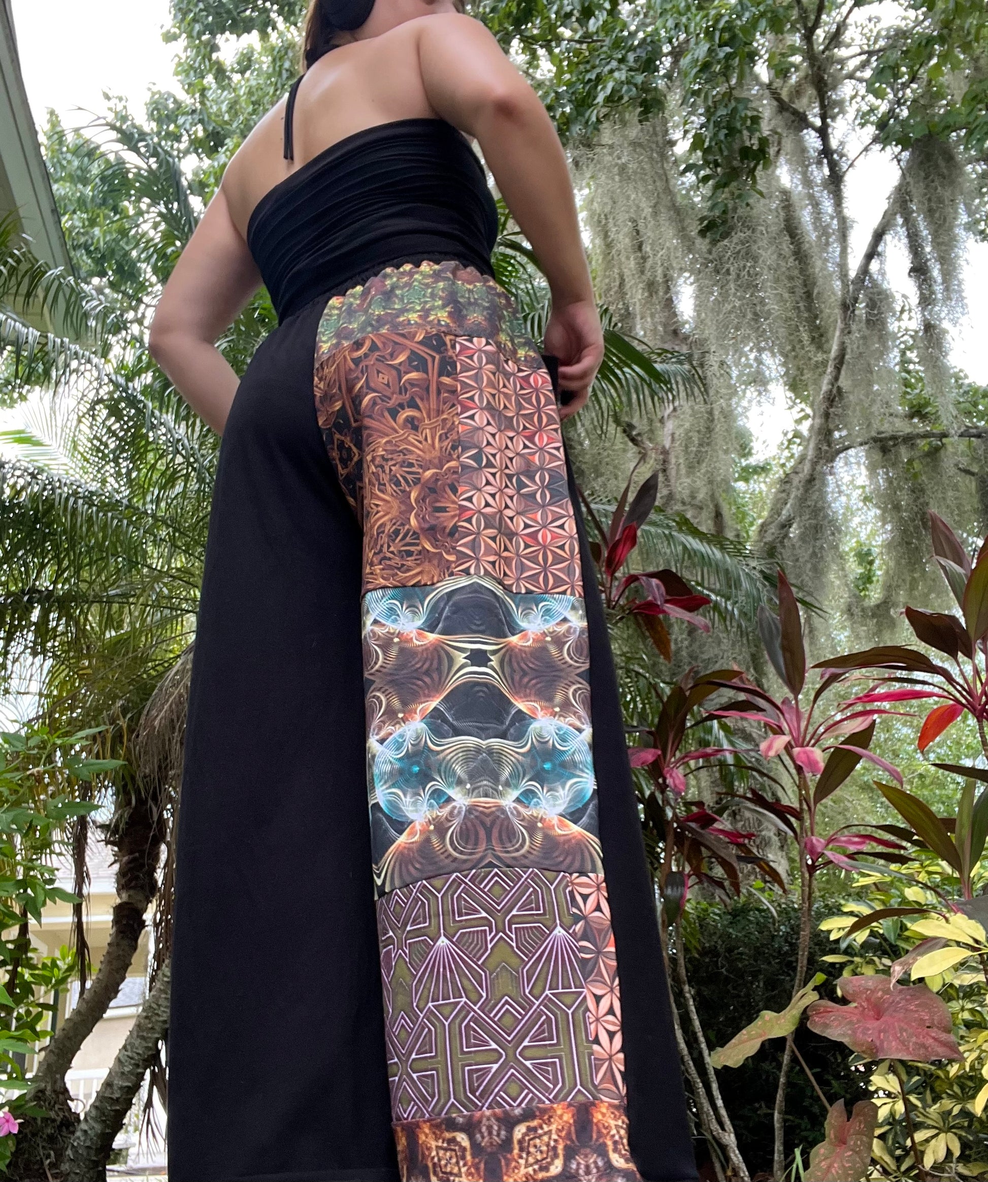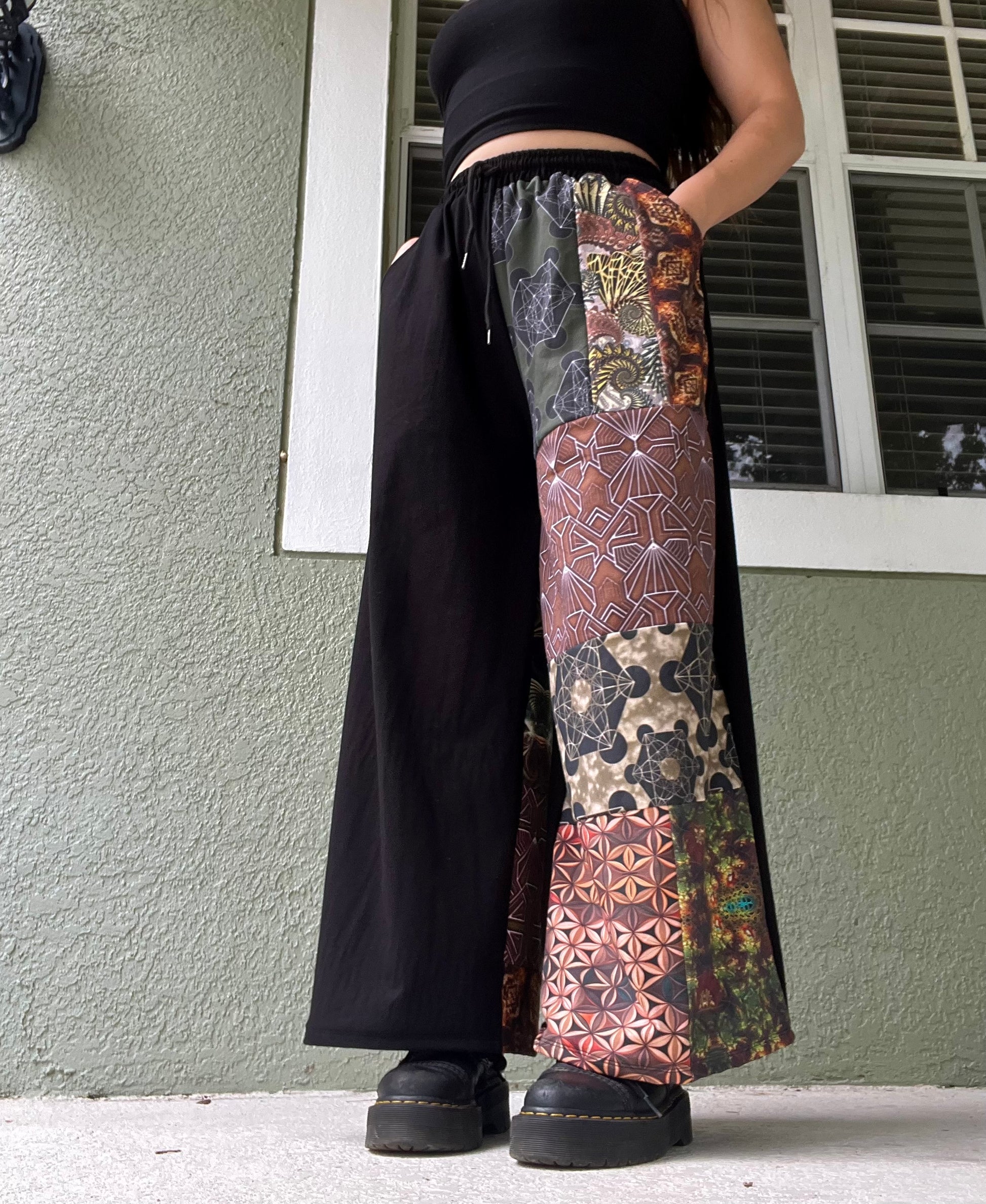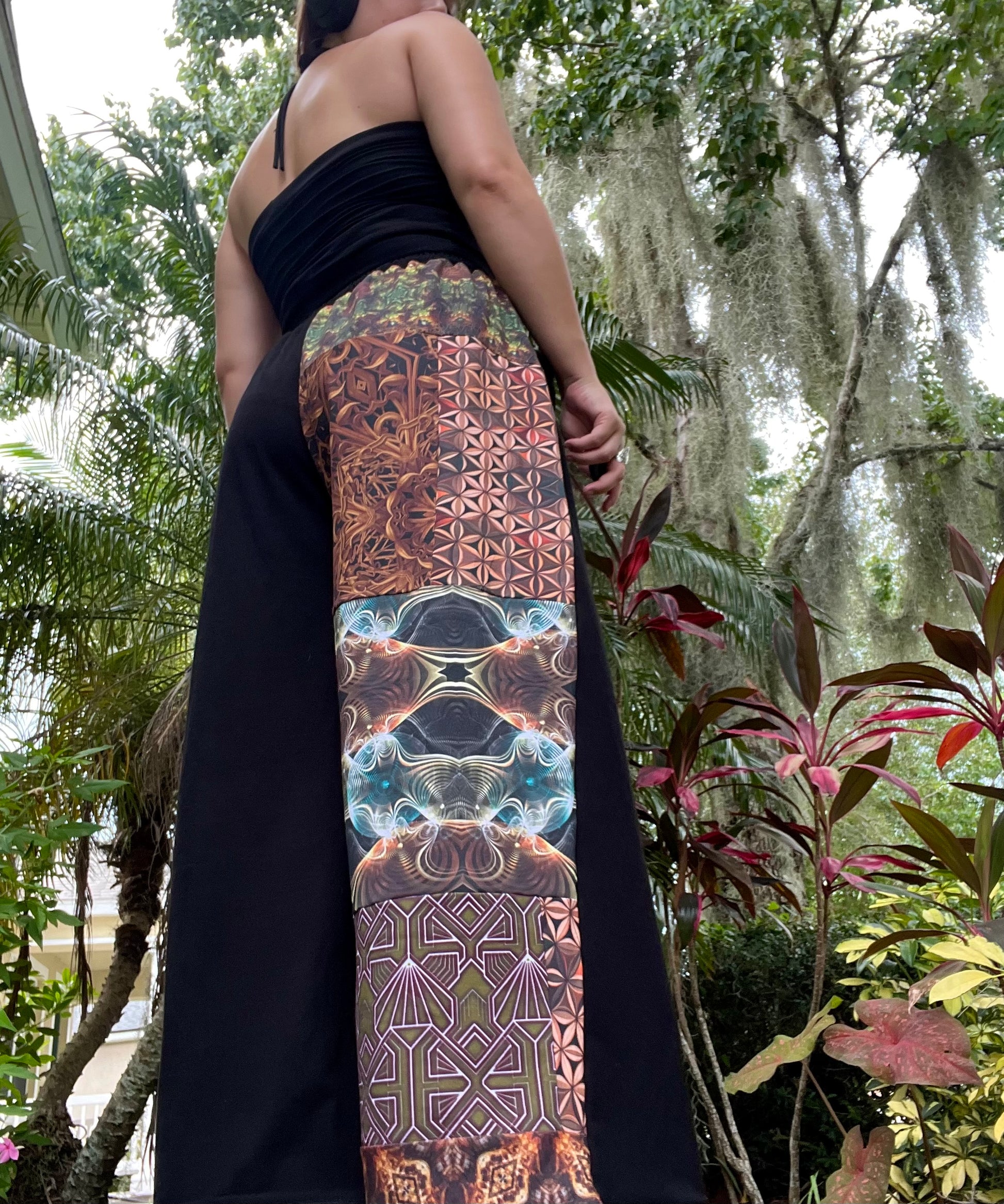 Mostly all patterned fabric is 93% Cotton 7% Spandex - It’s a 4 way stretch that’s very comfortable and allows for movement & breathability while also holding you in just right, contents of solid fabrics vary because I tend to switch them up, but I normally stick with natural fibers. 99% of everything I make is fire safe and can confidently be worn while flowing with fire props. Feel free to email me if you have questions about a specific one :)