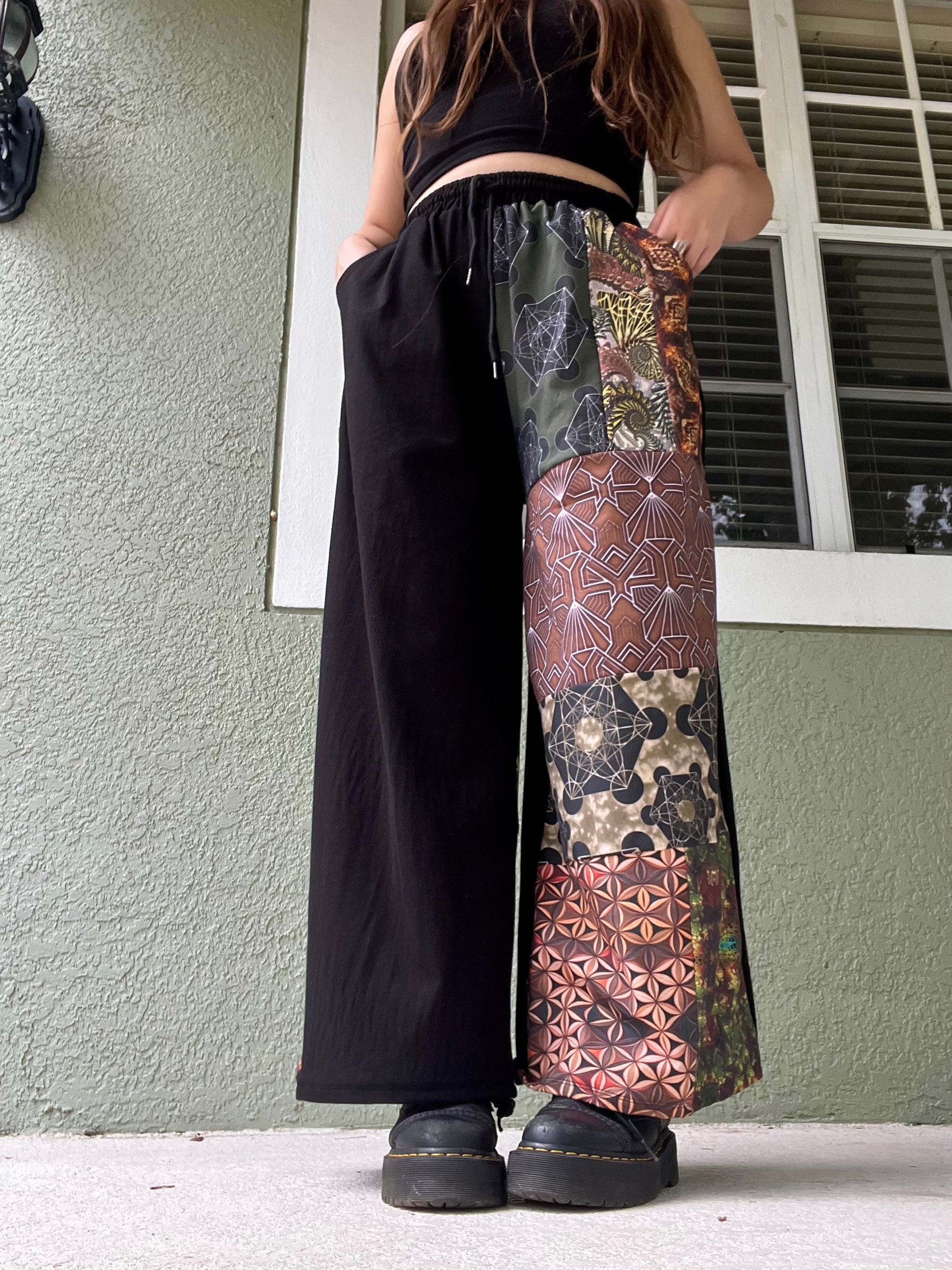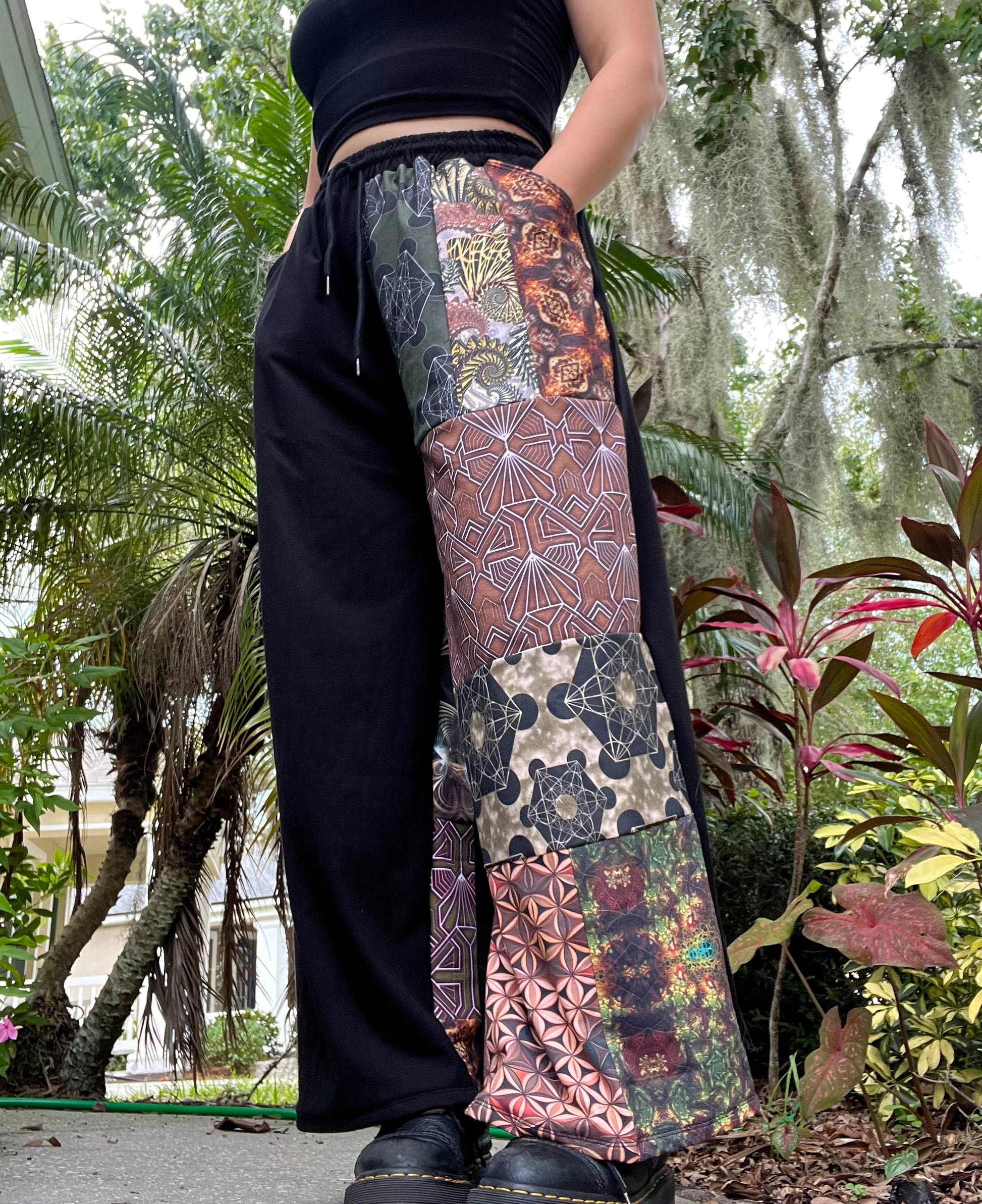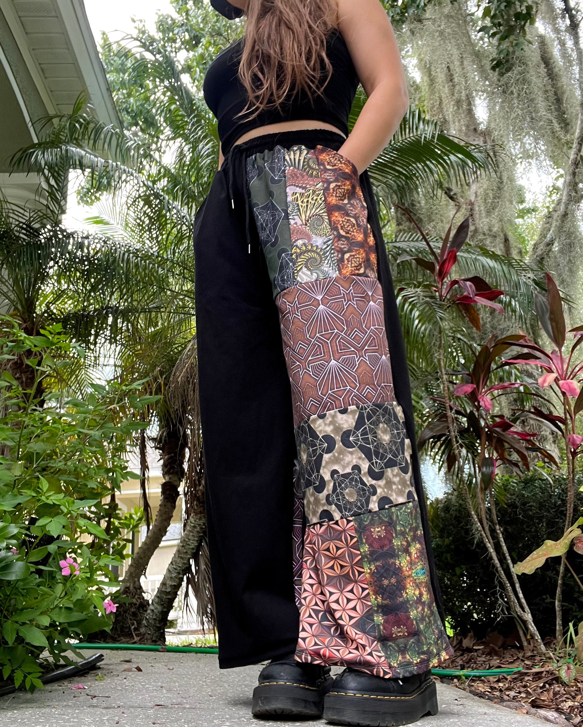 Mostly all patterned fabric is 93% Cotton 7% Spandex - It’s a 4 way stretch that’s very comfortable and allows for movement & breathability while also holding you in just right, contents of solid fabrics vary because I tend to switch them up, but I normally stick with natural fibers. 99% of everything I make is fire safe and can confidently be worn while flowing with fire props. Feel free to email me if you have questions about a specific one :)