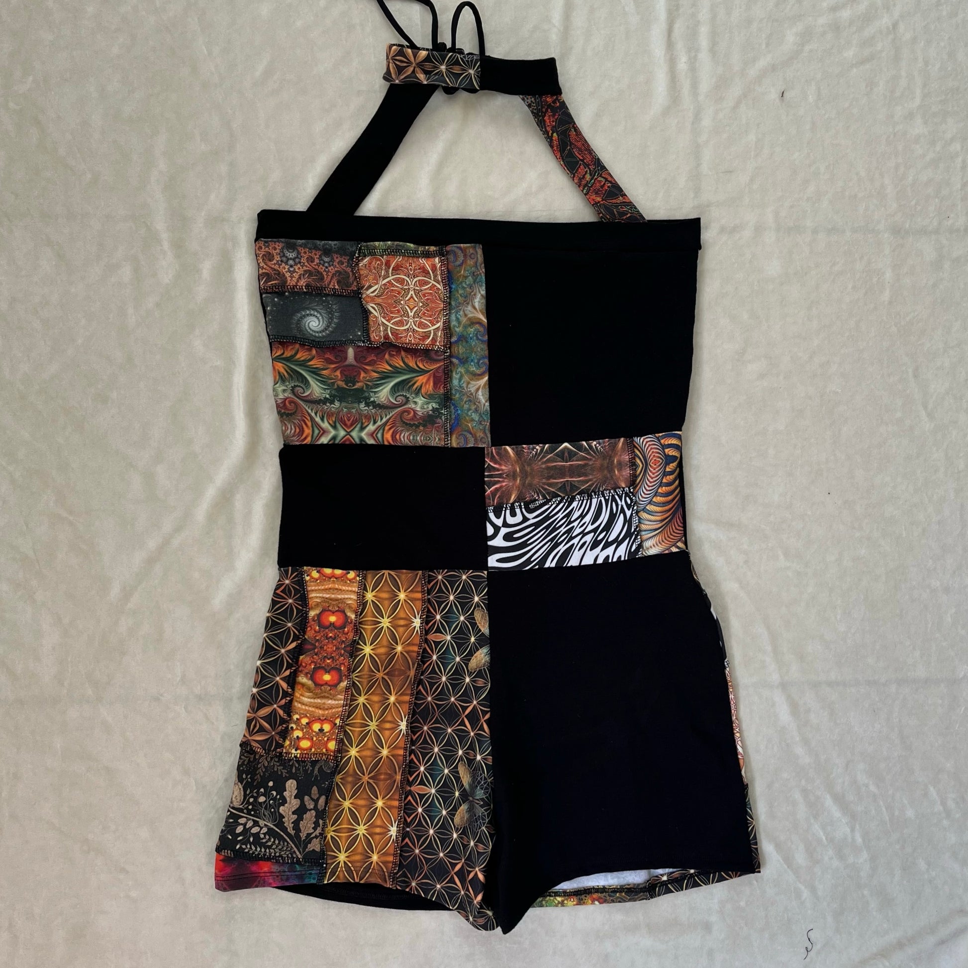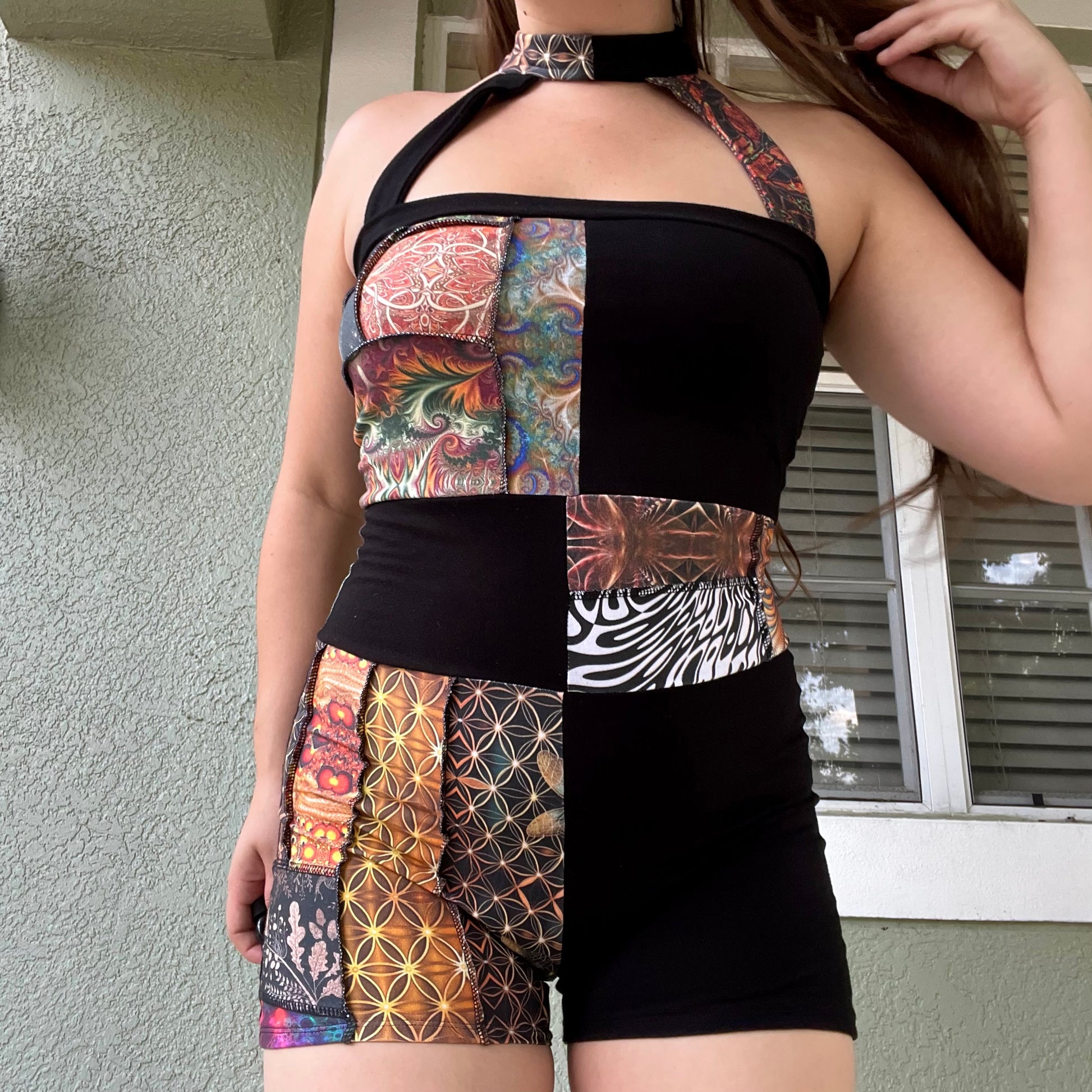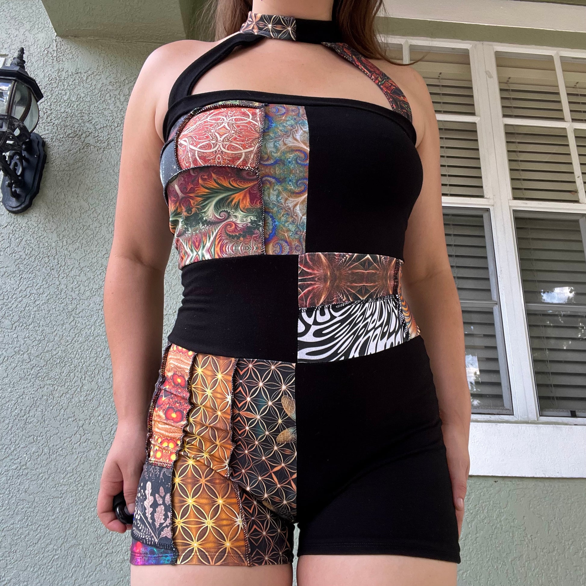 Mostly all patterned fabric is 93% Cotton 7% Spandex - It’s a 4 way stretch that’s very comfortable and allows for movement & breathability while also holding you in just right, contents of solid fabrics vary because I tend to switch them up, but I normally stick with natural fibers. 99% of everything I make is fire safe and can confidently be worn while flowing with fire props. Feel free to email me if you have questions about a specific one :)