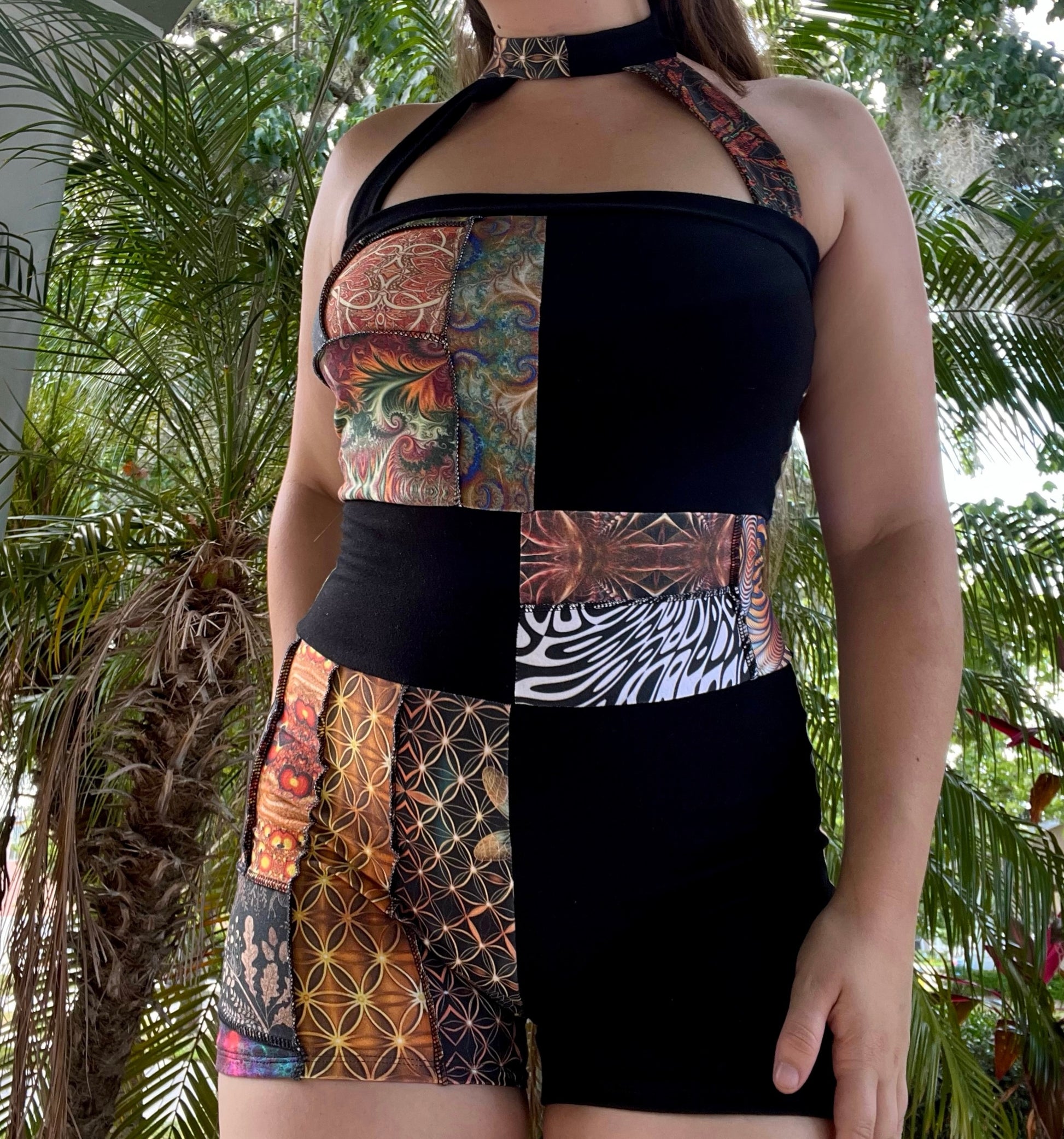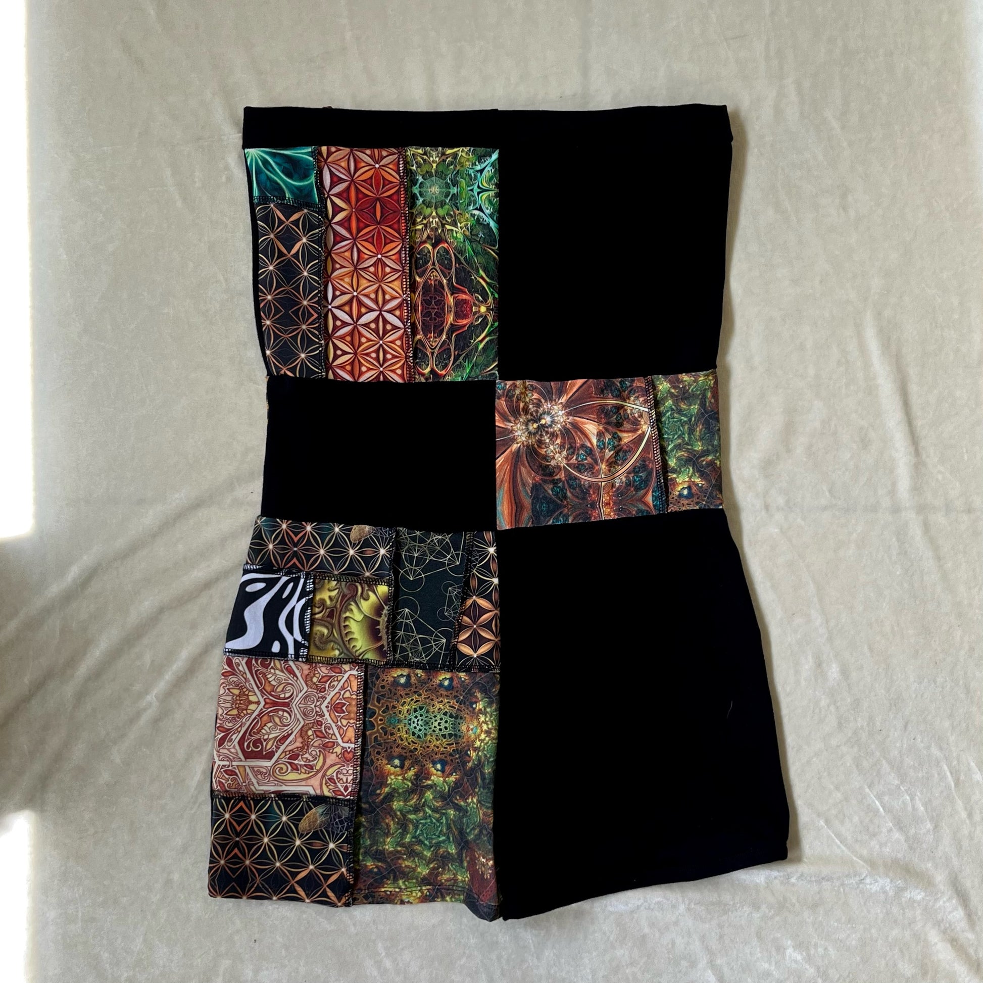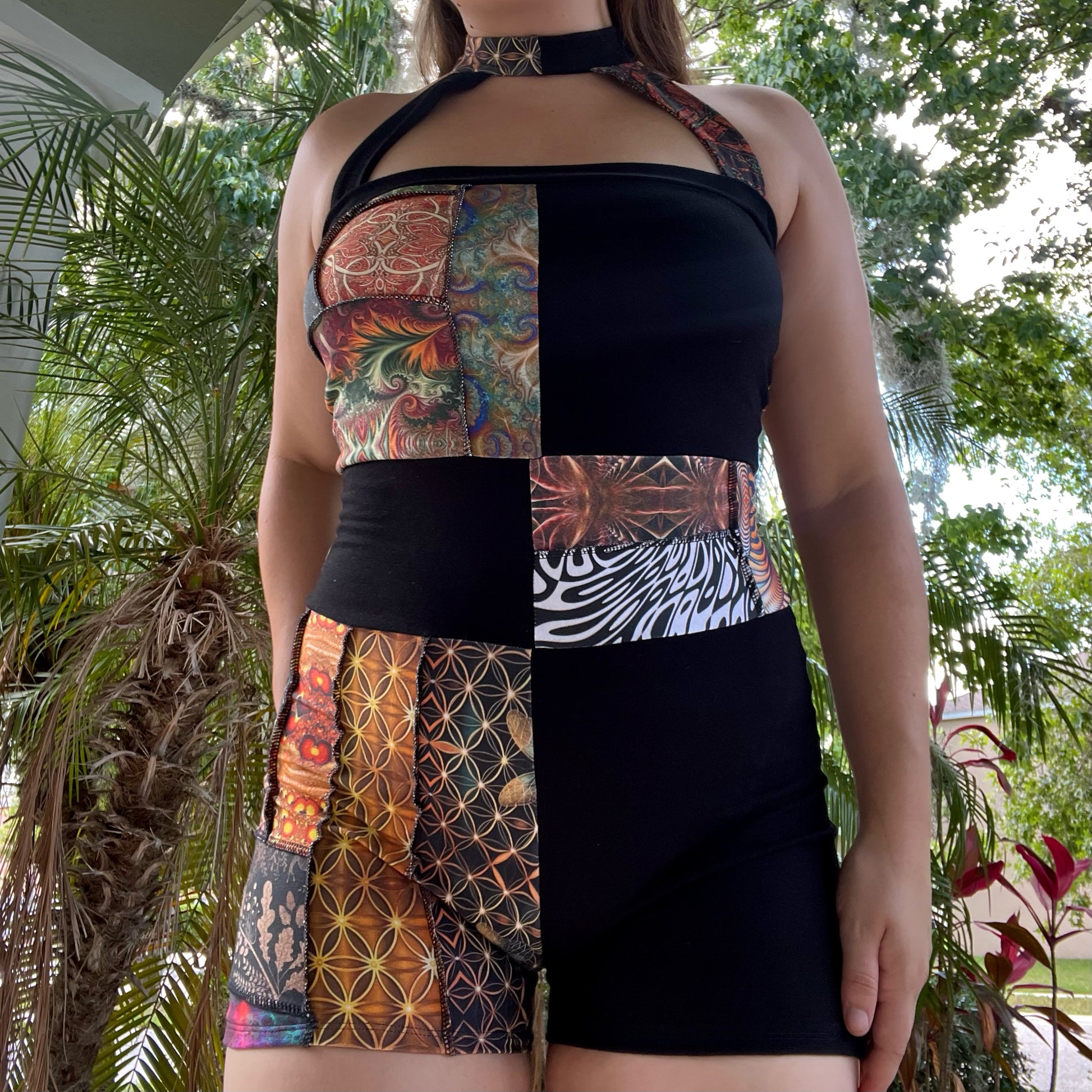 Mostly all patterned fabric is 93% Cotton 7% Spandex - It’s a 4 way stretch that’s very comfortable and allows for movement & breathability while also holding you in just right, contents of solid fabrics vary because I tend to switch them up, but I normally stick with natural fibers. 99% of everything I make is fire safe and can confidently be worn while flowing with fire props. Feel free to email me if you have questions about a specific one :)