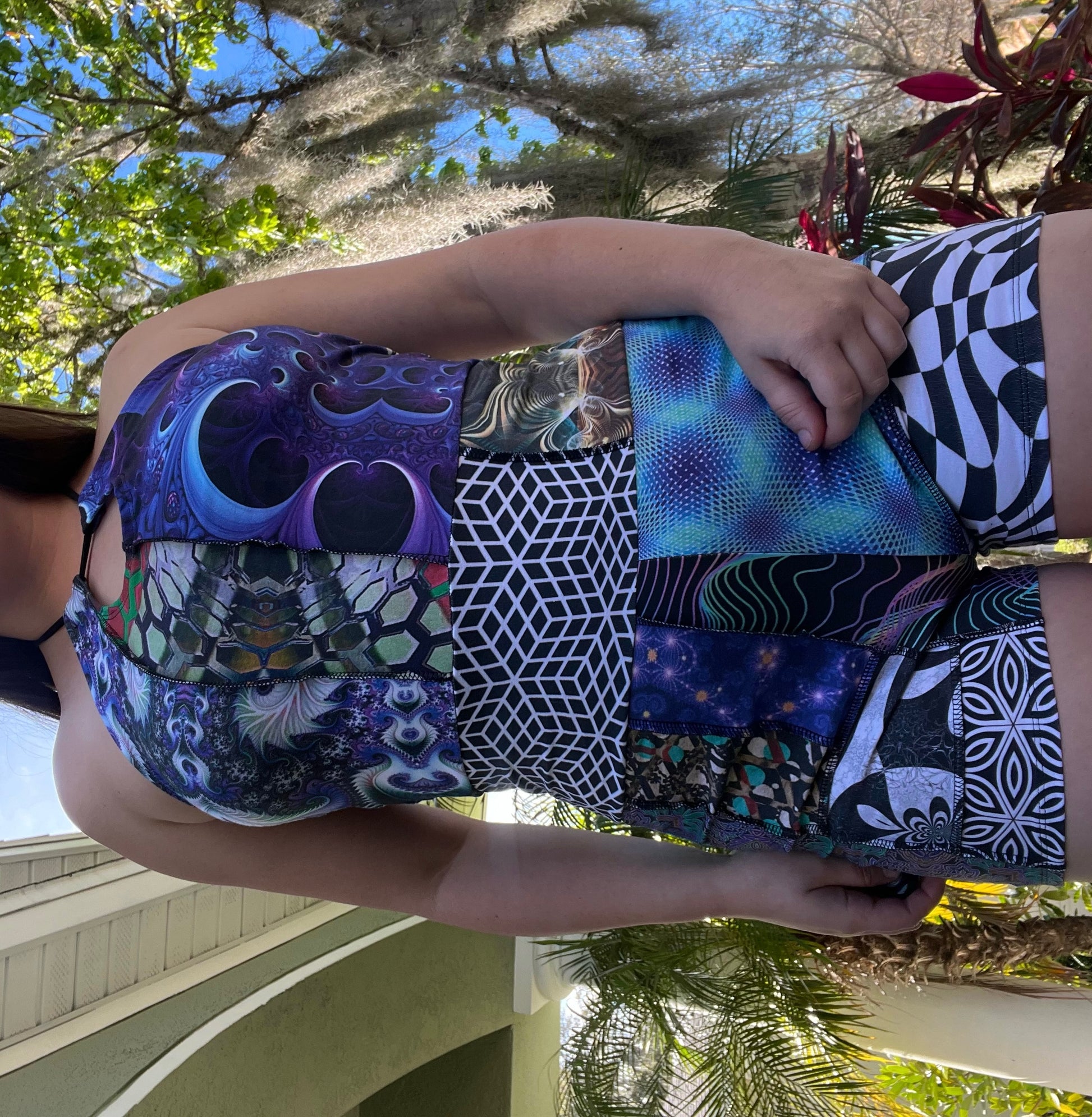 Mostly all patterned fabric is 93% Cotton 7% Spandex - It’s a 4 way stretch that’s very comfortable and allows for movement & breathability while also holding you in just right, contents of solid fabrics vary because I tend to switch them up, but I normally stick with natural fibers. 99% of everything I make is fire safe and can confidently be worn while flowing with fire props. Feel free to email me if you have questions about a specific one :)