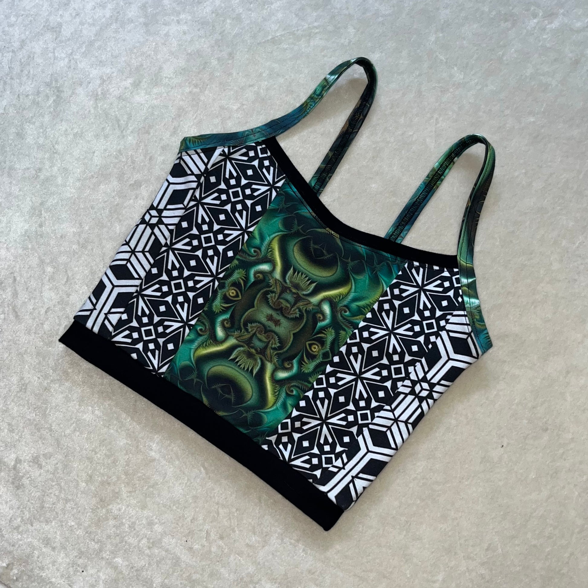 Mostly all patterned fabric is 93% Cotton 7% Spandex - It’s a 4 way stretch that’s very comfortable and allows for movement & breathability while also holding you in just right, contents of solid fabrics vary because I tend to switch them up, but I normally stick with natural fibers. 99% of everything I make is fire safe and can confidently be worn while flowing with fire props. Feel free to email me if you have questions about a specific one :)