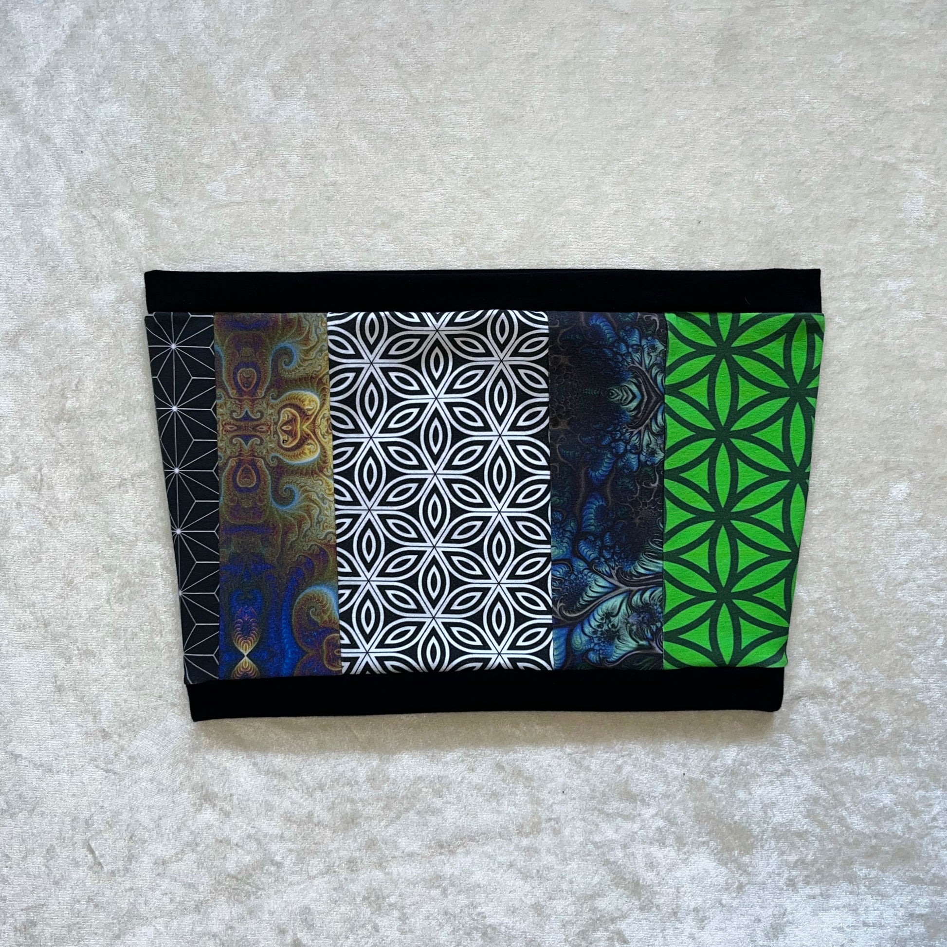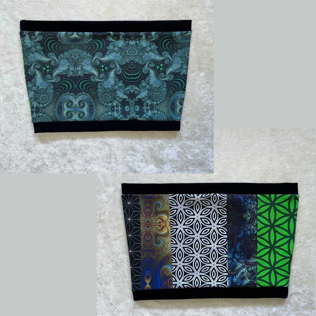 Mostly all patterned fabric is 93% Cotton 7% Spandex - It’s a 4 way stretch that’s very comfortable and allows for movement & breathability while also holding you in just right, contents of solid fabrics vary because I tend to switch them up, but I normally stick with natural fibers. 99% of everything I make is fire safe and can confidently be worn while flowing with fire props. Feel free to email me if you have questions about a specific one :)