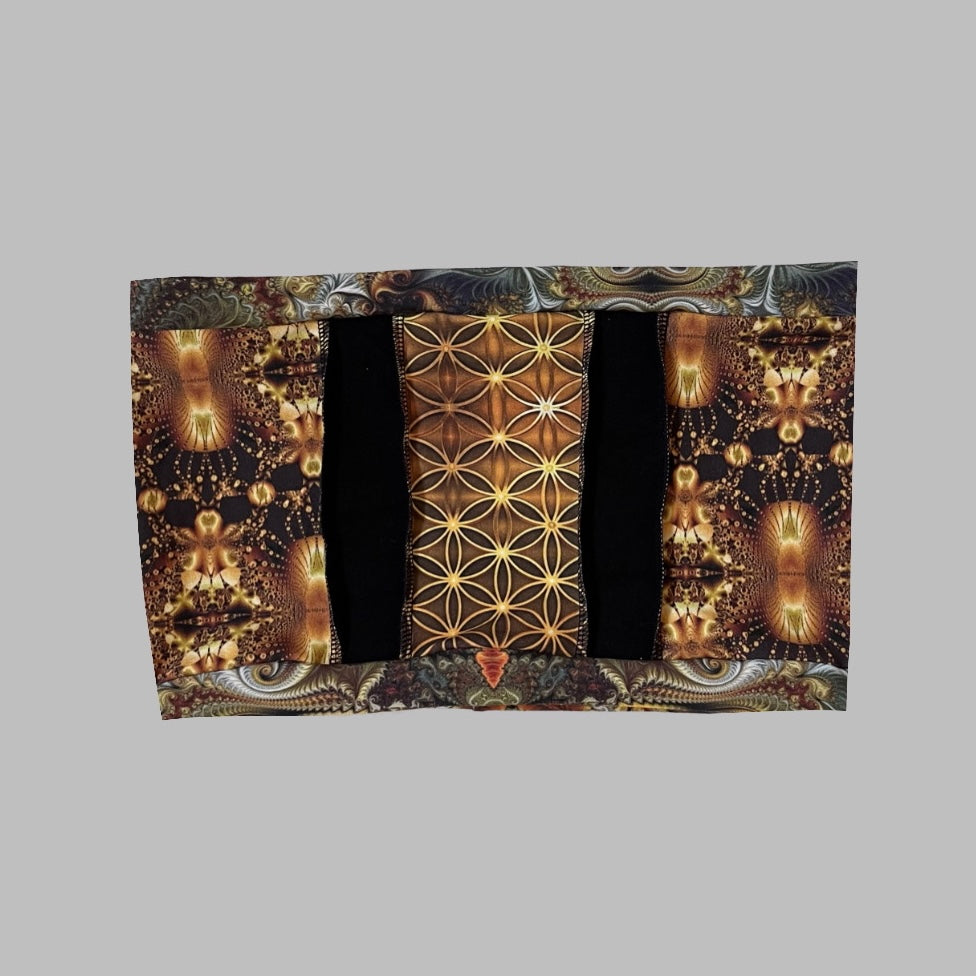 Mostly all patterned fabric is 93% Cotton 7% Spandex - It’s a 4 way stretch that’s very comfortable and allows for movement & breathability while also holding you in just right, contents of solid fabrics vary because I tend to switch them up, but I normally stick with natural fibers. 99% of everything I make is fire safe and can confidently be worn while flowing with fire props. Feel free to email me if you have questions about a specific one :)