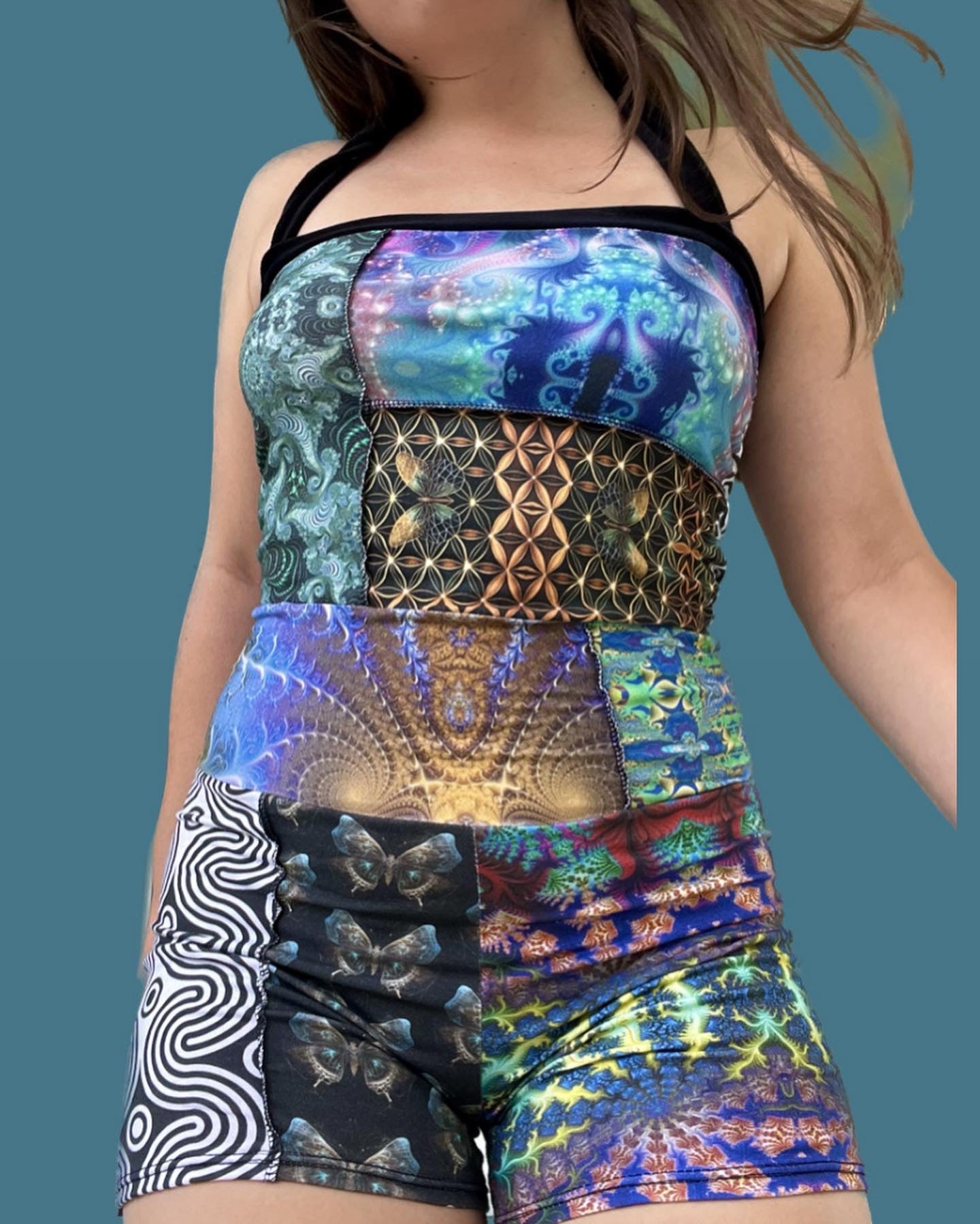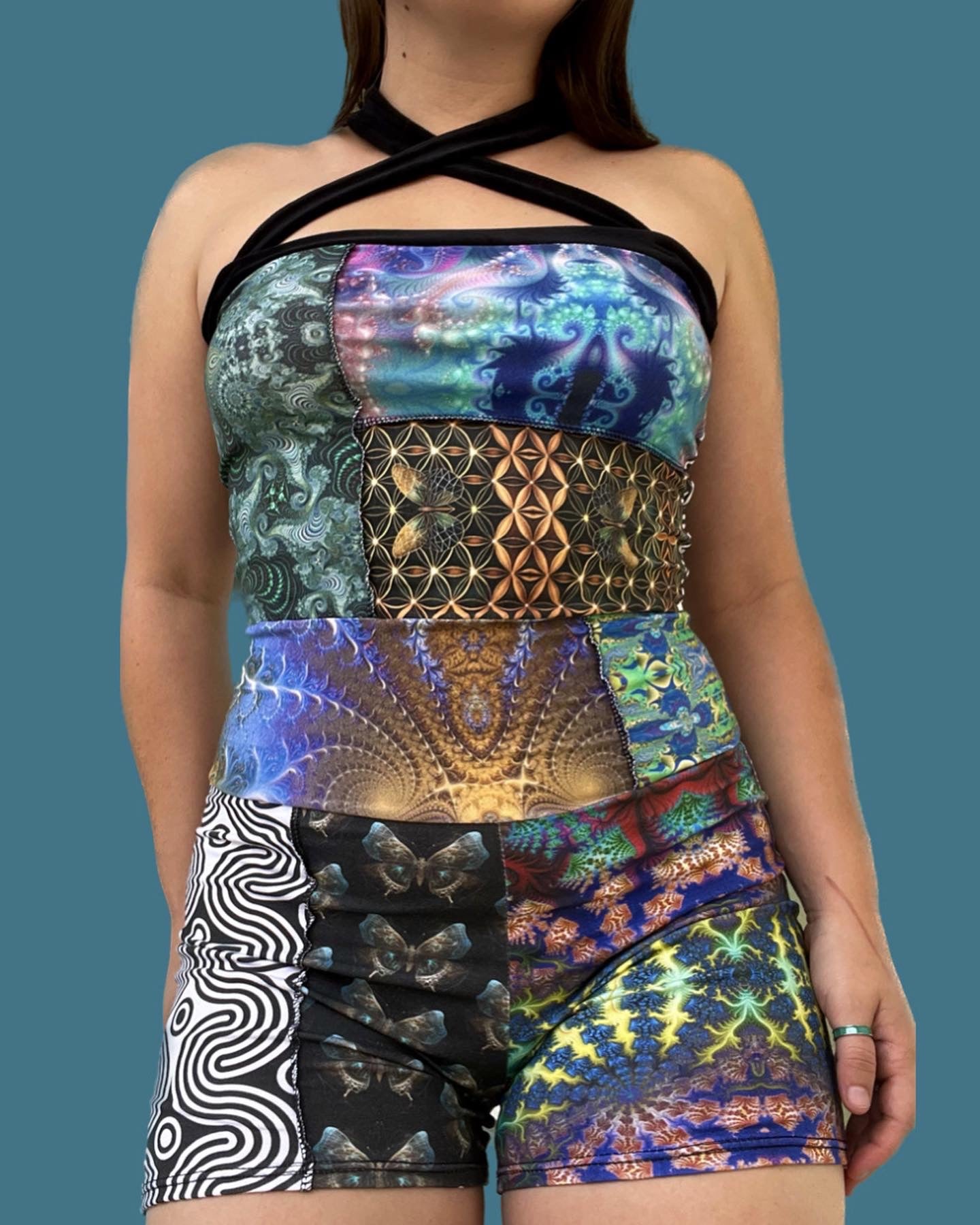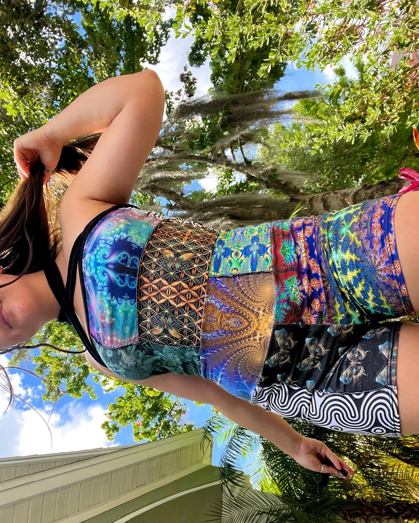 Mostly all patterned fabric is 93% Cotton 7% Spandex - It’s a 4 way stretch that’s very comfortable and allows for movement & breathability while also holding you in just right, contents of solid fabrics vary because I tend to switch them up, but I normally stick with natural fibers. 99% of everything I make is fire safe and can confidently be worn while flowing with fire props. Feel free to email me if you have questions about a specific one :)