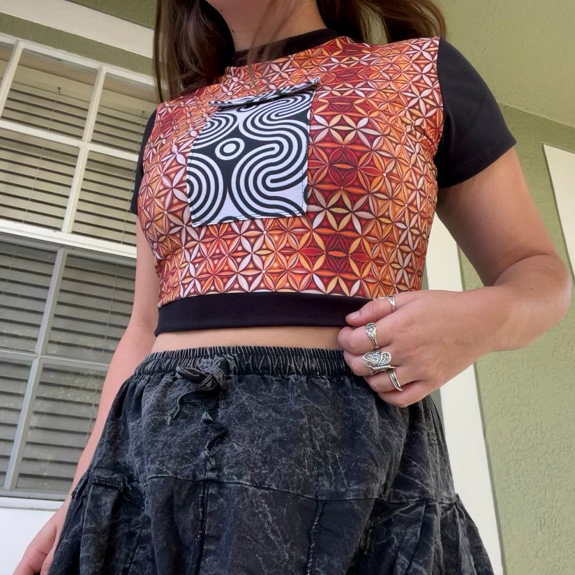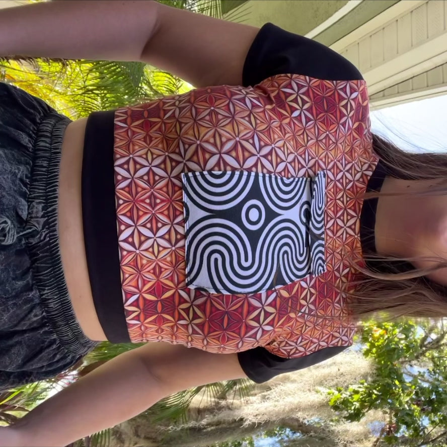 Mostly all patterned fabric is 93% Cotton 7% Spandex - It’s a 4 way stretch that’s very comfortable and allows for movement & breathability while also holding you in just right, contents of solid fabrics vary because I tend to switch them up, but I normally stick with natural fibers. 99% of everything I make is fire safe and can confidently be worn while flowing with fire props. Feel free to email me if you have questions about a specific one :)