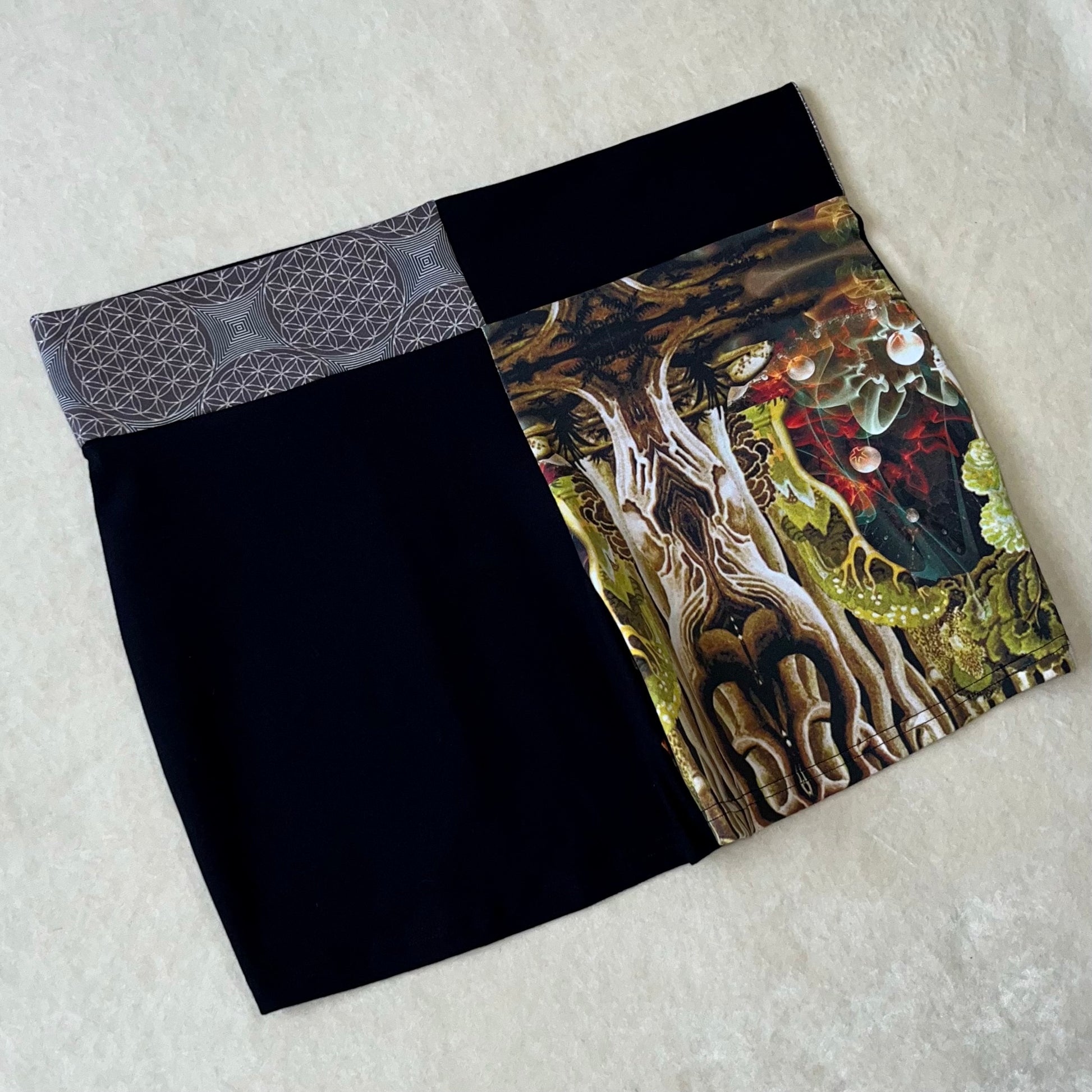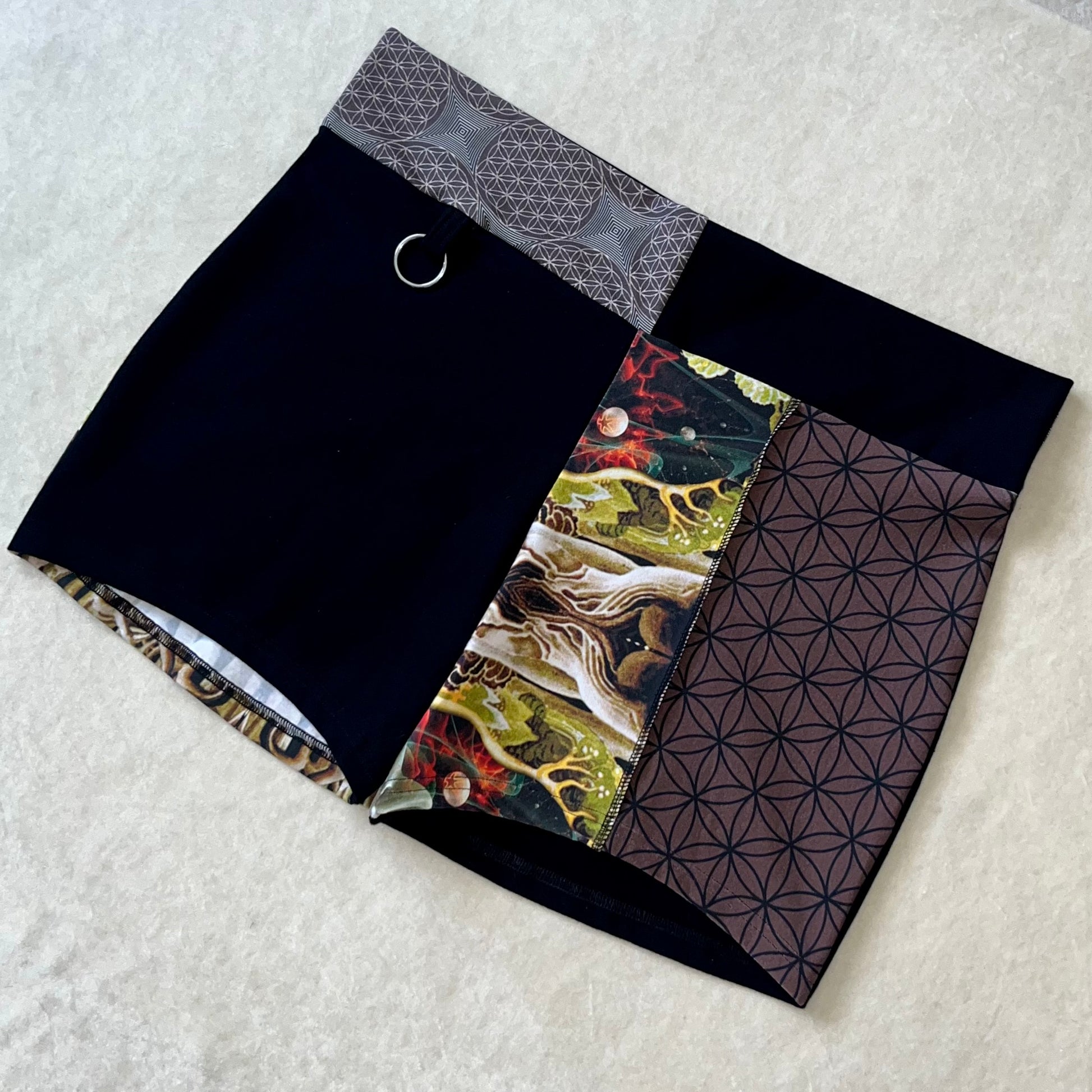 Mostly all patterned fabric is 93% Cotton 7% Spandex - It’s a 4 way stretch that’s very comfortable and allows for movement & breathability while also holding you in just right, contents of solid fabrics vary because I tend to switch them up, but I normally stick with natural fibers. 99% of everything I make is fire safe and can confidently be worn while flowing with fire props. Feel free to email me if you have questions about a specific one :)