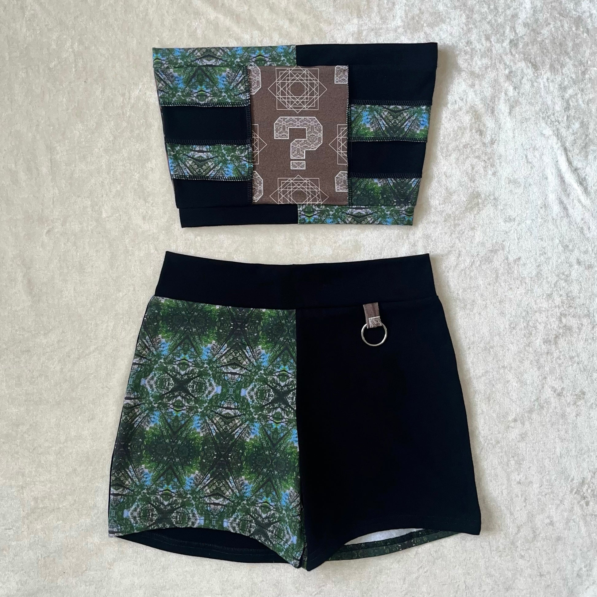 Mostly all patterned fabric is 93% Cotton 7% Spandex - It’s a 4 way stretch that’s very comfortable and allows for movement & breathability while also holding you in just right, contents of solid fabrics vary because I tend to switch them up, but I normally stick with natural fibers. 99% of everything I make is fire safe and can confidently be worn while flowing with fire props. Feel free to email me if you have questions about a specific one :)