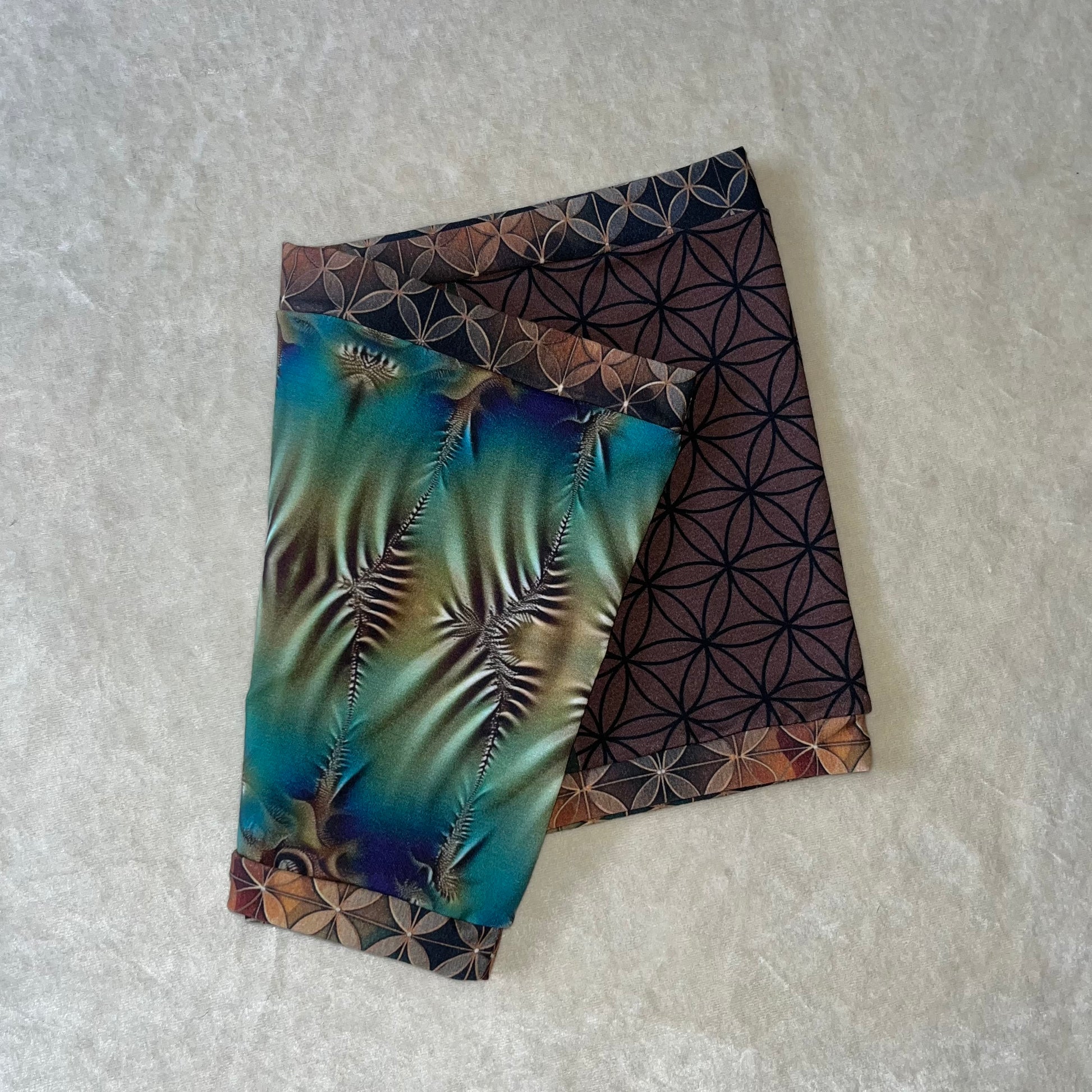 Mostly all patterned fabric is 93% Cotton 7% Spandex - It’s a 4 way stretch that’s very comfortable and allows for movement & breathability while also holding you in just right, contents of solid fabrics vary because I tend to switch them up, but I normally stick with natural fibers. 99% of everything I make is fire safe and can confidently be worn while flowing with fire props. Feel free to email me if you have questions about a specific one :)