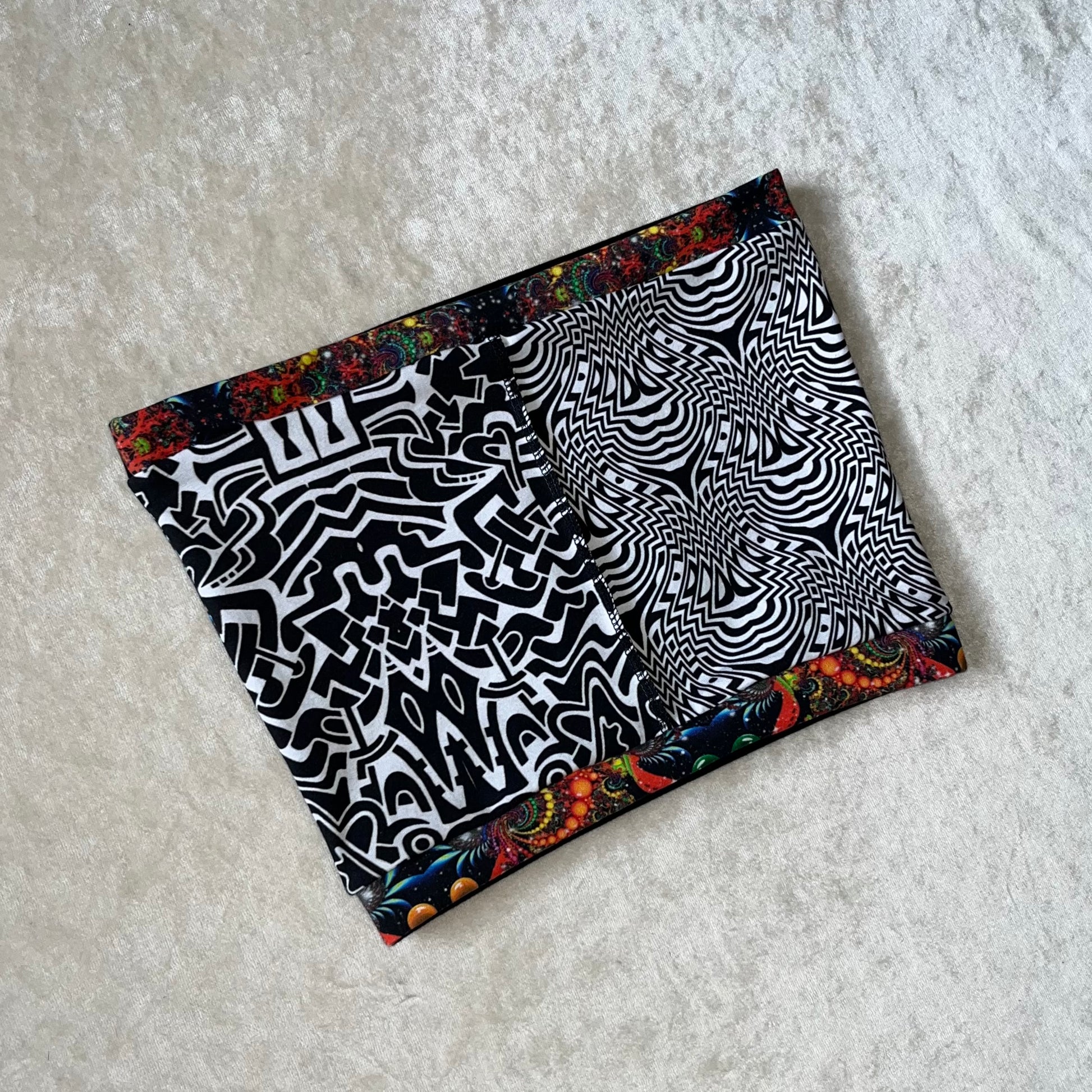 Mostly all patterned fabric is 93% Cotton 7% Spandex - It’s a 4 way stretch that’s very comfortable and allows for movement & breathability while also holding you in just right, contents of solid fabrics vary because I tend to switch them up, but I normally stick with natural fibers. 99% of everything I make is fire safe and can confidently be worn while flowing with fire props. Feel free to email me if you have questions about a specific one :)