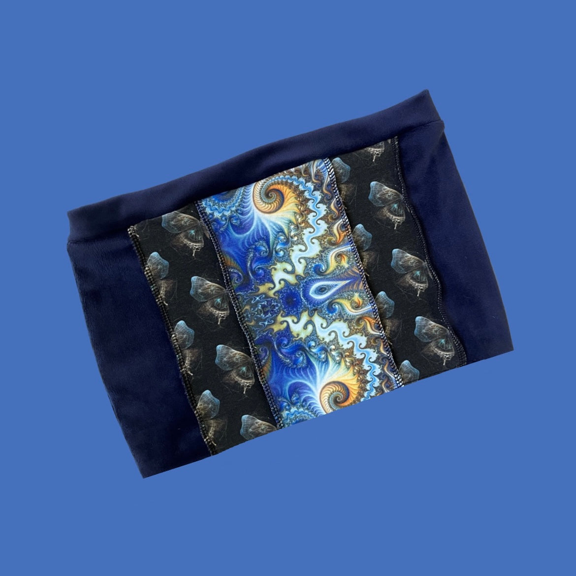 Mostly all patterned fabric is 93% Cotton 7% Spandex - It’s a 4 way stretch that’s very comfortable and allows for movement & breathability while also holding you in just right, contents of solid fabrics vary because I tend to switch them up, but I normally stick with natural fibers. 99% of everything I make is fire safe and can confidently be worn while flowing with fire props. Feel free to email me if you have questions about a specific one :)